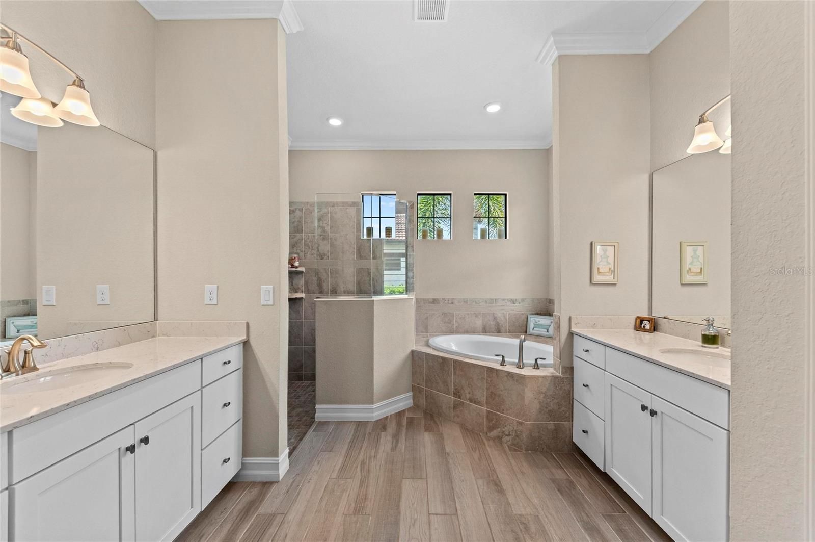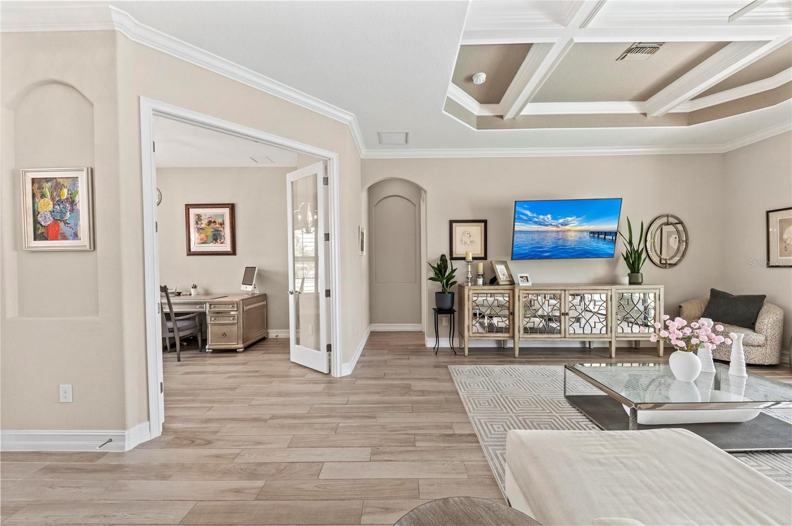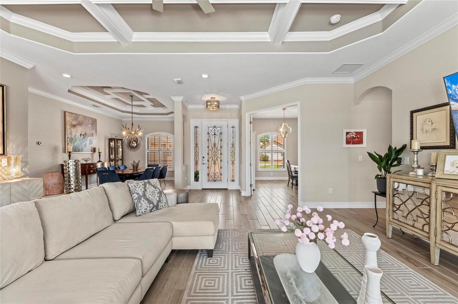 - Ceiling Fan(s), Coffered Ceiling(s), Crown Molding, Eat-in Kitchen, Kitchen/Family Room Combo, Open Floorplan, Main Level Primary, Split Bedrooms, Stone Counters, Thermostat, Walk-In Closet(s), Window Treatments