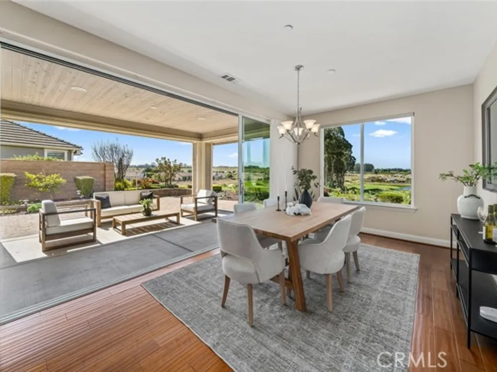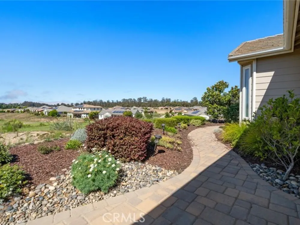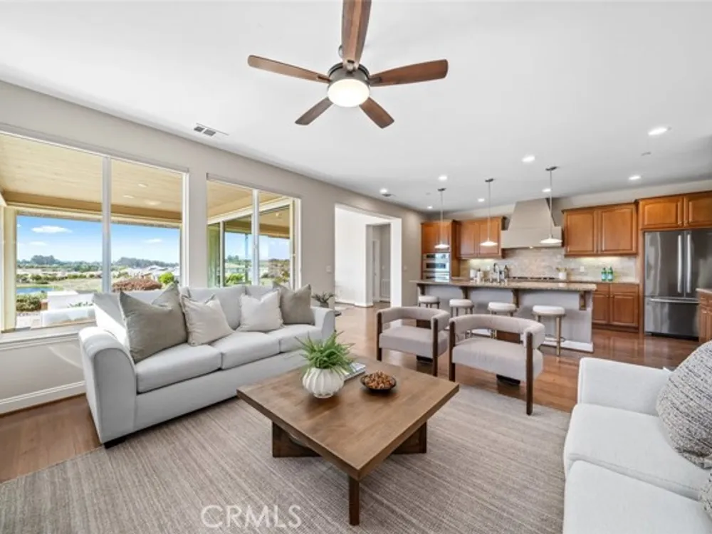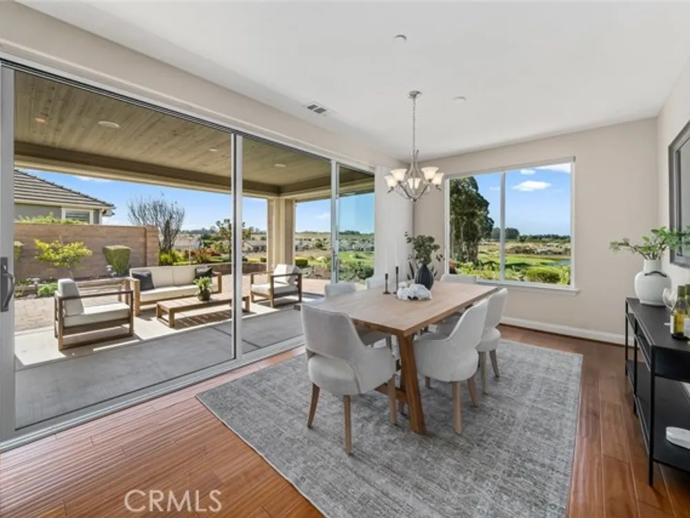 Resort living begins in this California Coastal “Nice†floor-plan home, beautifully situated on a very desirable cul-de-sac with a birds-eye panoramic view of the 5th, 6th and 7th holes of the Challenge Golf Course, plus the magnificent coastal sunsets. This 1,945 sq. ft. home, built in 2014, offers 2 bedrooms, 2 full bathrooms, plus a den with French door enclosure. Designer upgrades abound, including gorgeous hand scraped engineered wood floors, sweeping granite island with custom lighting, plantation shutters, ceiling fans and a rolling wall of glass providing exquisite views. Enter the gallery hallway and head toward the culinary kitchen - you'll love the raised panel cabinetry, granite countertops and island, tile backsplash, JennAir stainless steel appliances, including a 5-burner cooktop and a walk-in pantry - it's a chefs dream! Around the corner is the coveted SmartSpace/laundry, designed for optimum organization with a built-in desk, storage cabinets and countertops - it's a great space for working from home or enjoying your favorite hobbies. Across from the kitchen is a super comfortable living room with a spacious den next door, and a large dining room with loads of natural light and incredible views. Head outside the rolling wall of glass to the covered patio - i