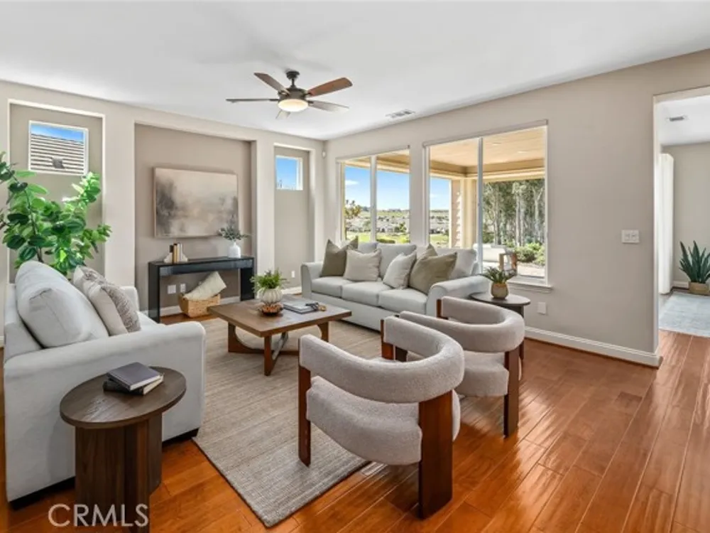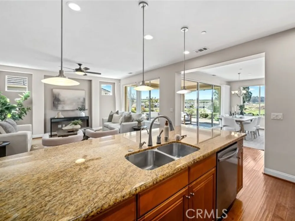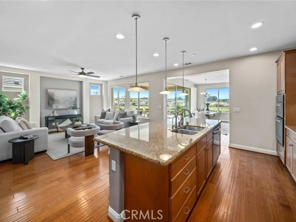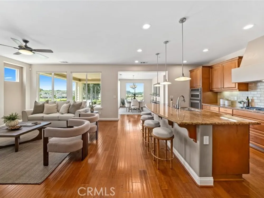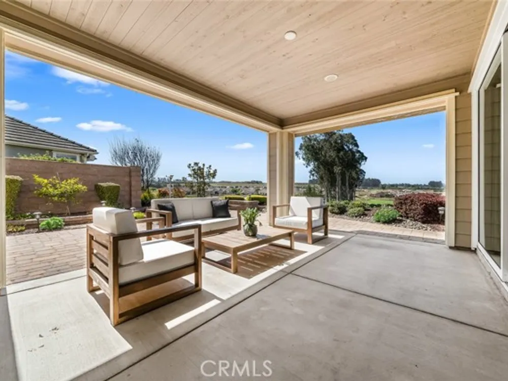 Resort living begins in this California Coastal “Nice†floor-plan home, beautifully situated on a very desirable cul-de-sac with a birds-eye panoramic view of the 5th, 6th and 7th holes of the Challenge Golf Course, plus the magnificent coastal sunsets. This 1,945 sq. ft. home, built in 2014, offers 2 bedrooms, 2 full bathrooms, plus a den with French door enclosure. Designer upgrades abound, including gorgeous hand scraped engineered wood floors, sweeping granite island with custom lighting, plantation shutters, ceiling fans and a rolling wall of glass providing exquisite views. Enter the gallery hallway and head toward the culinary kitchen - you'll love the raised panel cabinetry, granite countertops and island, tile backsplash, JennAir stainless steel appliances, including a 5-burner cooktop and a walk-in pantry - it's a chefs dream! Around the corner is the coveted SmartSpace/laundry, designed for optimum organization with a built-in desk, storage cabinets and countertops - it's a great space for working from home or enjoying your favorite hobbies. Across from the kitchen is a super comfortable living room with a spacious den next door, and a large dining room with loads of natural light and incredible views. Head outside the rolling wall of glass to the covered patio - i