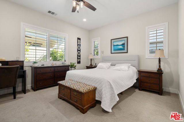 Welcome to Ovation at Flora Park, where resort-style living meets contemporary comfort. This beautifully appointed Bougainvillea 1 floorplan offers the ease of single-level living with two bedrooms, two and a half bathrooms, and a versatile den or office that can easily serve as a third bedroom. Thoughtful upgrades throughout include plantation shutters, ceiling fans with lighting in the living room and bedrooms, and durable luxury vinyl plank flooring that flows through the main living areas. At the heart of the home, the kitchen impresses with quartz countertops, a generous eat-at island, floor-to-ceiling cabinetry, and a subway tile backsplash. The appliance suite features an LG microwave, oven, and refrigerator, complemented by a Maytag stovetop and dishwasher. A walk-in pantry adds valuable storage and convenience. The adjacent dining area showcases custom built-in cabinetry with a wine fridge, while additional upper cabinets in the hallway provide even more organization. The laundry room, equipped with a Maytag washer and dryer and a large utility sink, is brightened by solar tubes that also illuminate the powder room, creating a warm, natural glow. Outdoor spaces are designed for both beauty and ease, with teak decking on the patio, artificial turf along the side yard, and backyard irrigation to maintain the mature plum, peach, apple, and lemon trees. Clear-view screen doors at the front entry and side garage door invite the fresh air in. The two-car garage features an epoxy floor and direct home access, and the "Quiet Cool" whole-house fan system enhances air quality and energy efficiency. The primary suite offers a spa-like retreat with an extra-large, glass-walled accessible shower. Life at Flora Park is vibrant and social, with resort-style amenities that include a sparkling pool and spa, fitness center, pickleball courts, game room, and community clubhouse. Combining modern design, practical upgrades, and a welcoming atmosphere, this exceptional home offers the perfect blend of relaxation and sophistication in one of the area's premier 55+ communities.