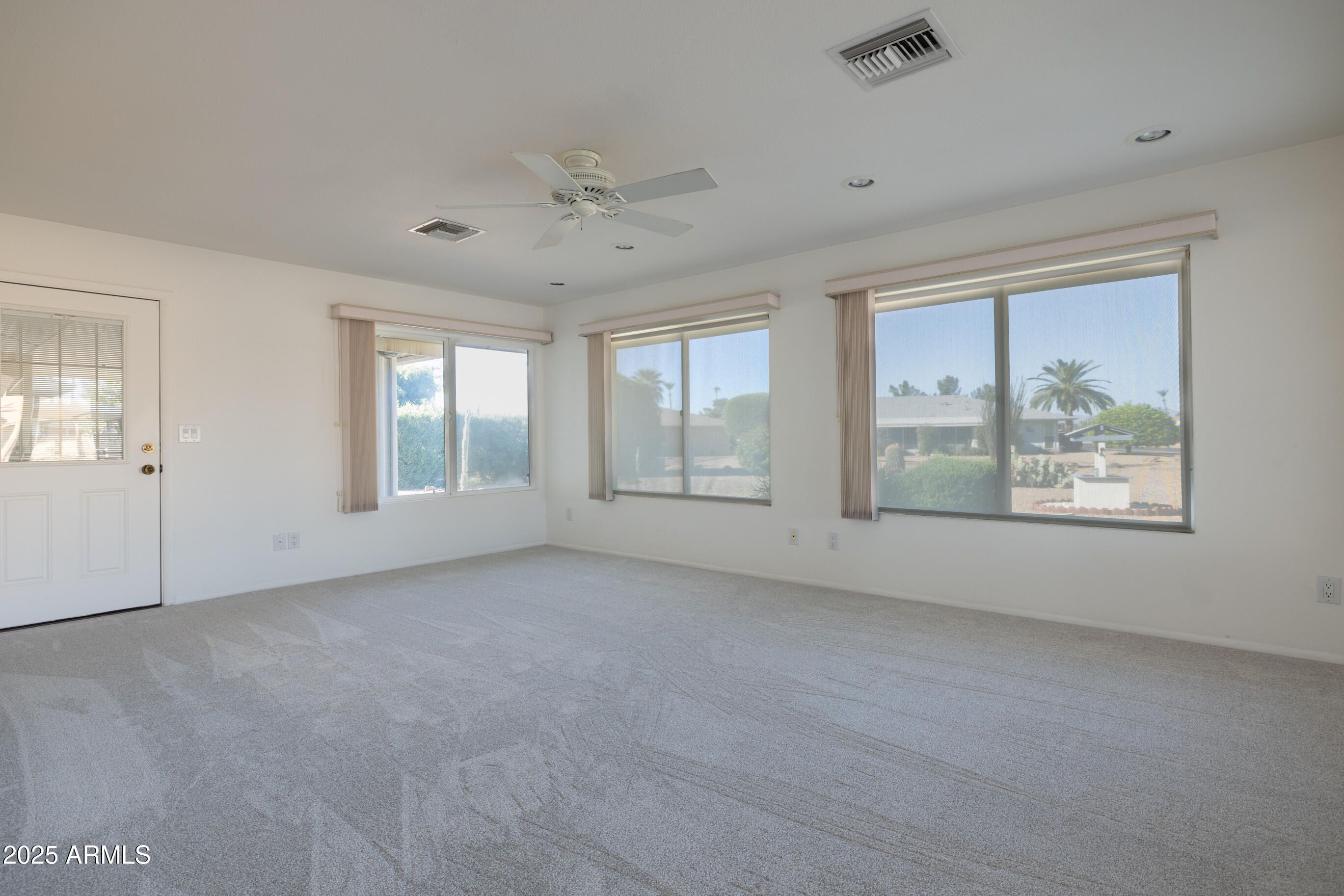 Fresh, bright, and ready for fun! This inviting 2 bedroom, 2 bath single story gem in Sun City's sought-after Phase 2 community sits proudly on a spacious 10,600 sq. ft. corner lot. Step inside to discover fresh interior paint and carpet, plus a versatile 14' x 20' family room ideal for relaxing or entertaining. The sunny kitchen flows easily into open living areas that make daily living a breeze. Enjoy the convenience of low maintenance living in a vibrant 55+ active adult community offering 8 recreation centers, 8 golf courses, pools, bowling, pickleball, and more. This move-in-ready home is the perfect place to start your next chapter. This home is turn-key & waiting for you!