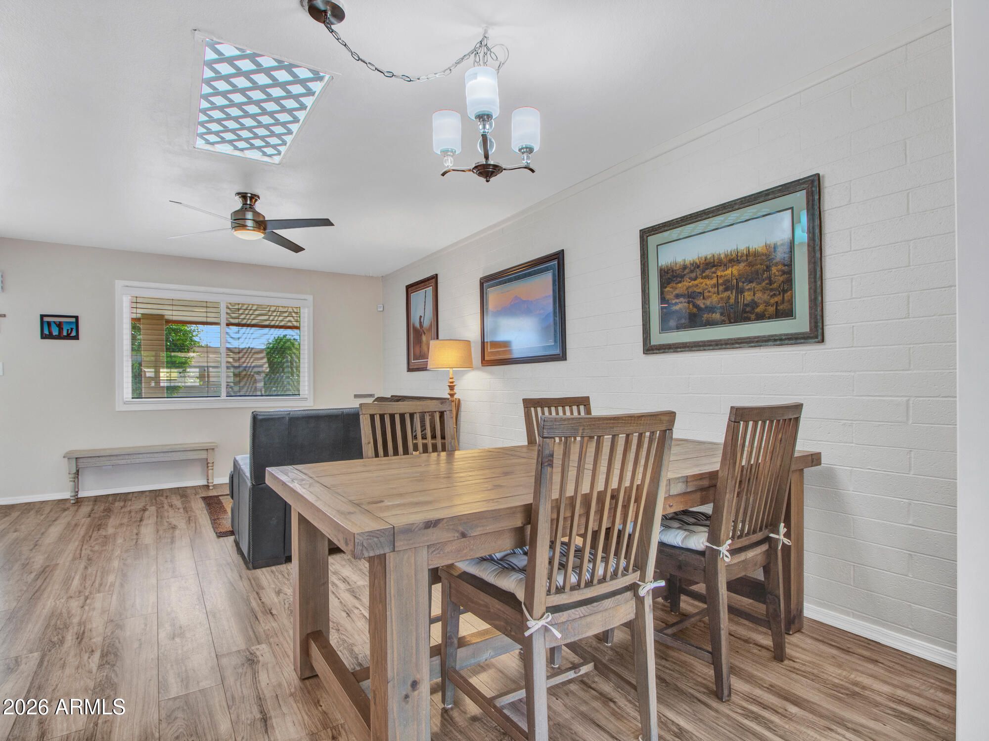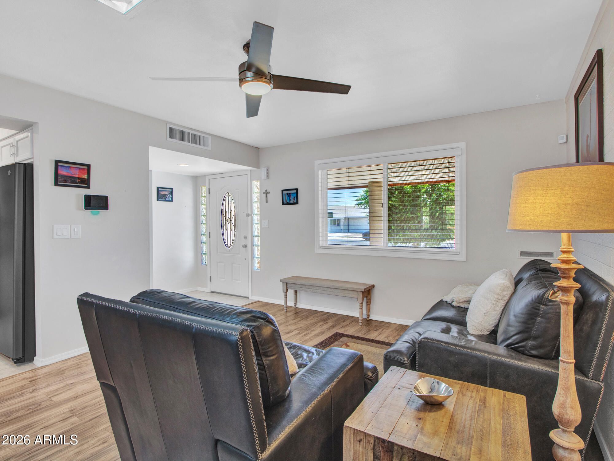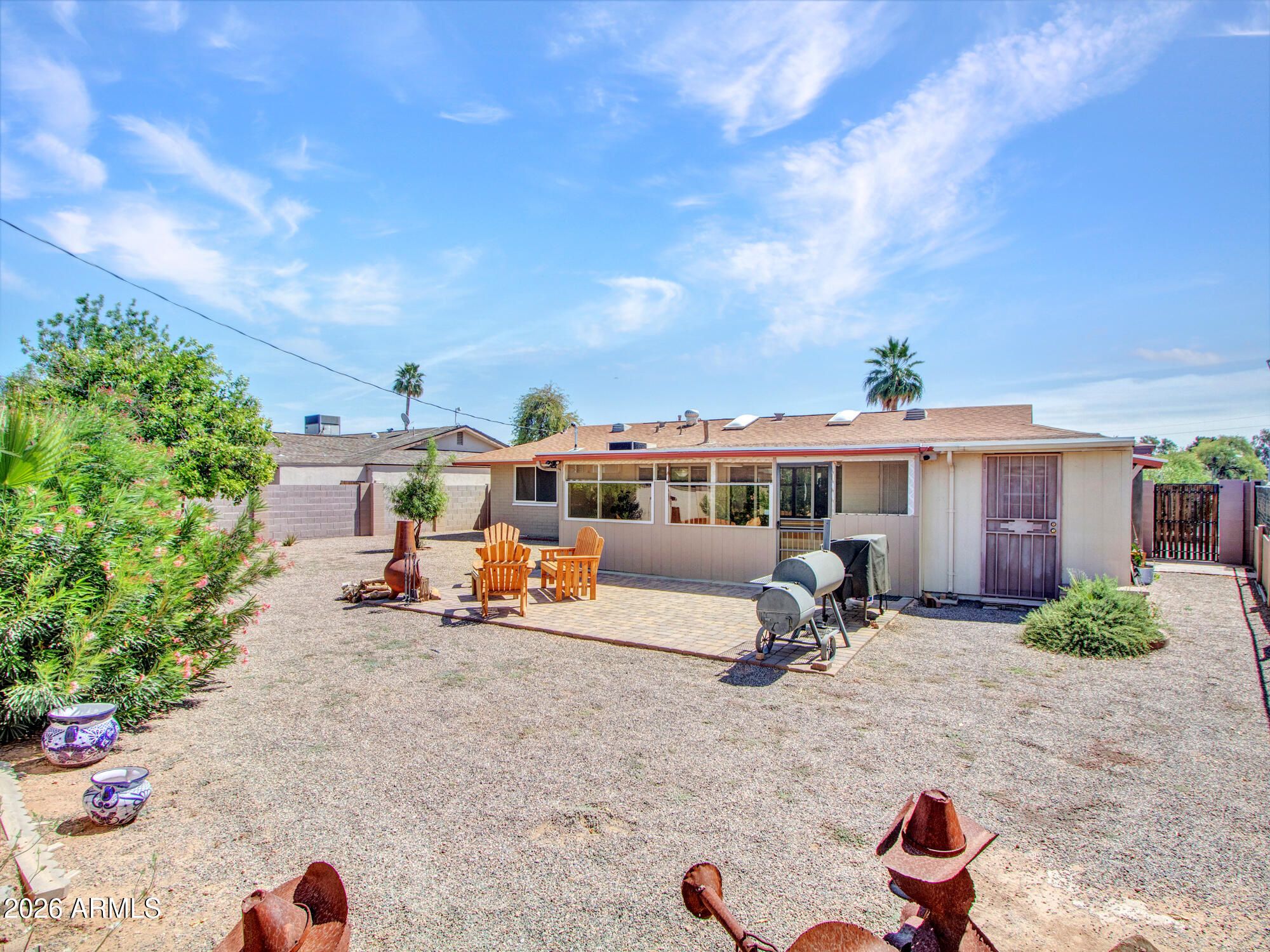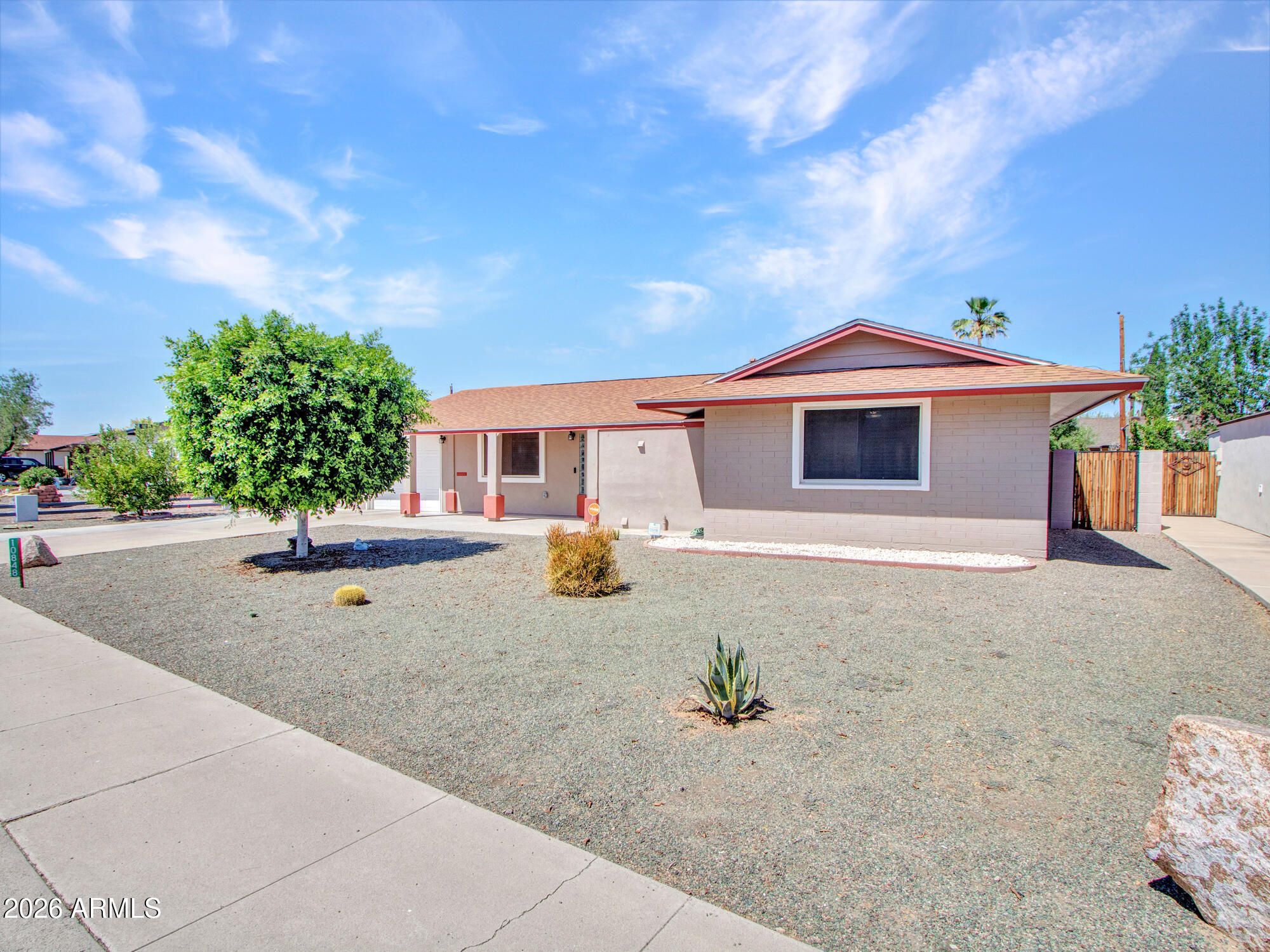 Experience the quintessential Arizona lifestyle in this charming 2-bedroom, 1.75-bath home in Sun City. This single-level residence features over $14,000 in recent electrical updates and an inviting interior with a neutral color palette. The formal living and dining spaces flow into a beautifully updated Arizona room, where large picture windows flood the space with natural light. The kitchen features stainless steel appliances, a gas cooktop, and a center island that opens to a cozy dining nook and living area. The primary suite serves as a private retreat with a walk-in closet and a modern ensuite bathroom. The 1-car garage and storage area/golf cart garage feature freshly finished epoxy floors. Outside, the spacious backyard offers mature fruit trees and an enclosed covered patio perfect for enjoying desert sunsets. Enjoy world-class golf and recreation centers in this premier community.