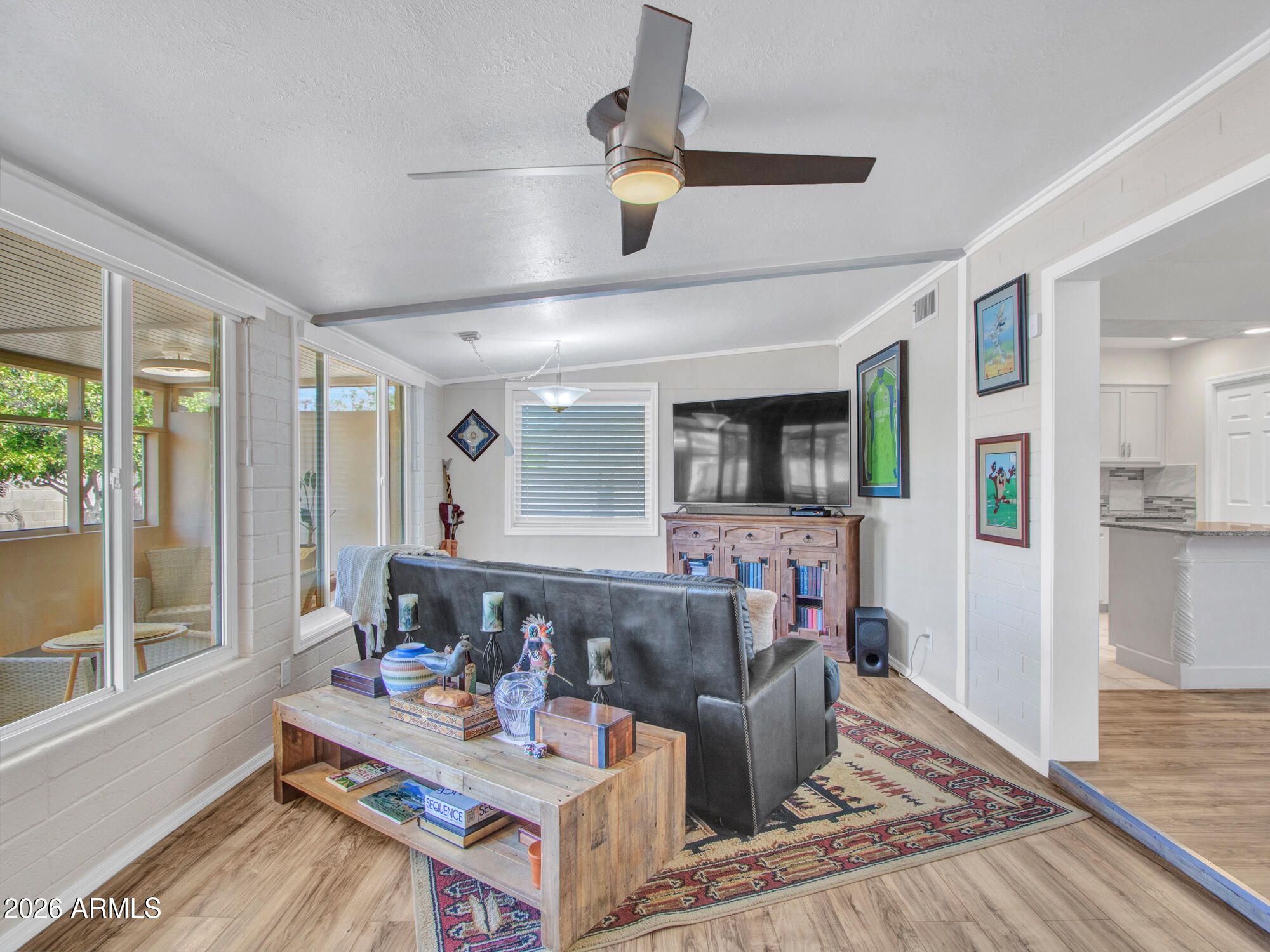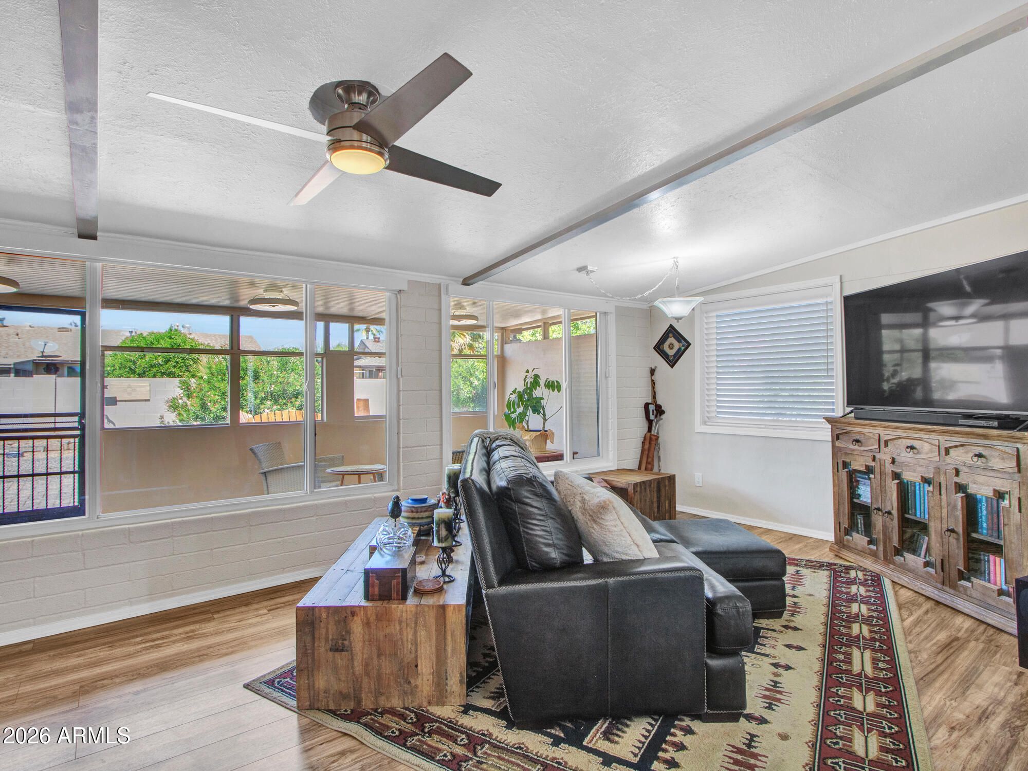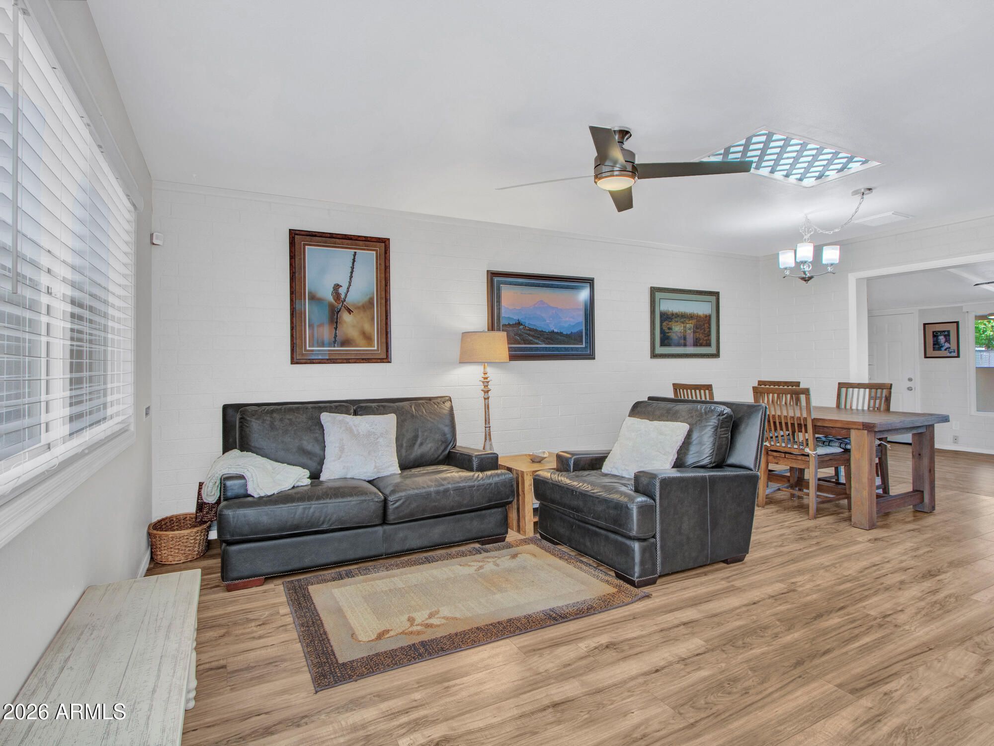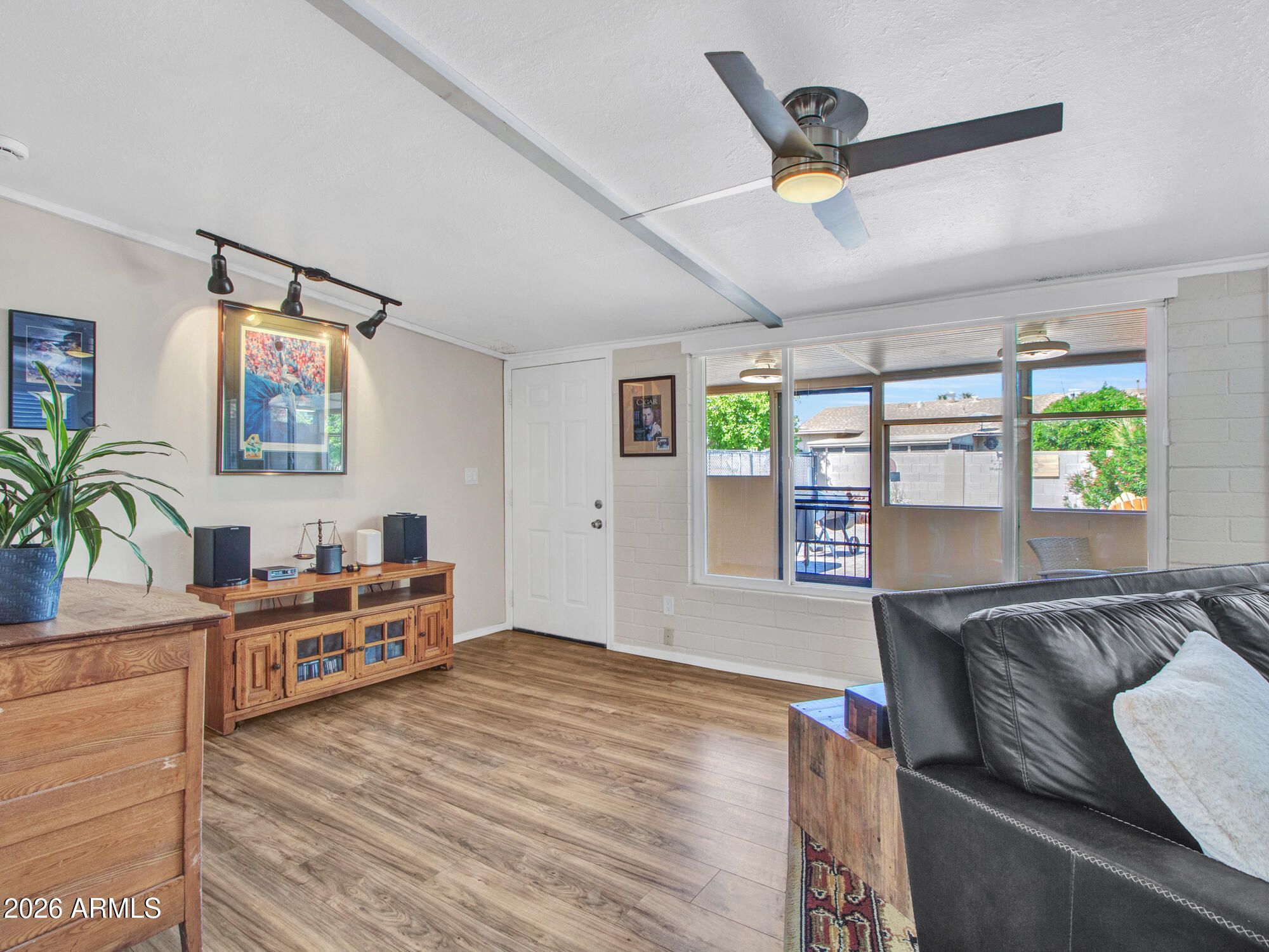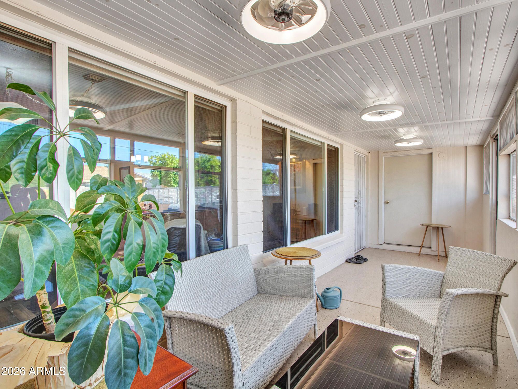 Experience the quintessential Arizona lifestyle in this charming 2-bedroom, 1.75-bath home in Sun City. This single-level residence features over $14,000 in recent electrical updates and an inviting interior with a neutral color palette. The formal living and dining spaces flow into a beautifully updated Arizona room, where large picture windows flood the space with natural light. The kitchen features stainless steel appliances, a gas cooktop, and a center island that opens to a cozy dining nook and living area. The primary suite serves as a private retreat with a walk-in closet and a modern ensuite bathroom. The 1-car garage and storage area/golf cart garage feature freshly finished epoxy floors. Outside, the spacious backyard offers mature fruit trees and an enclosed covered patio perfect for enjoying desert sunsets. Enjoy world-class golf and recreation centers in this premier community.