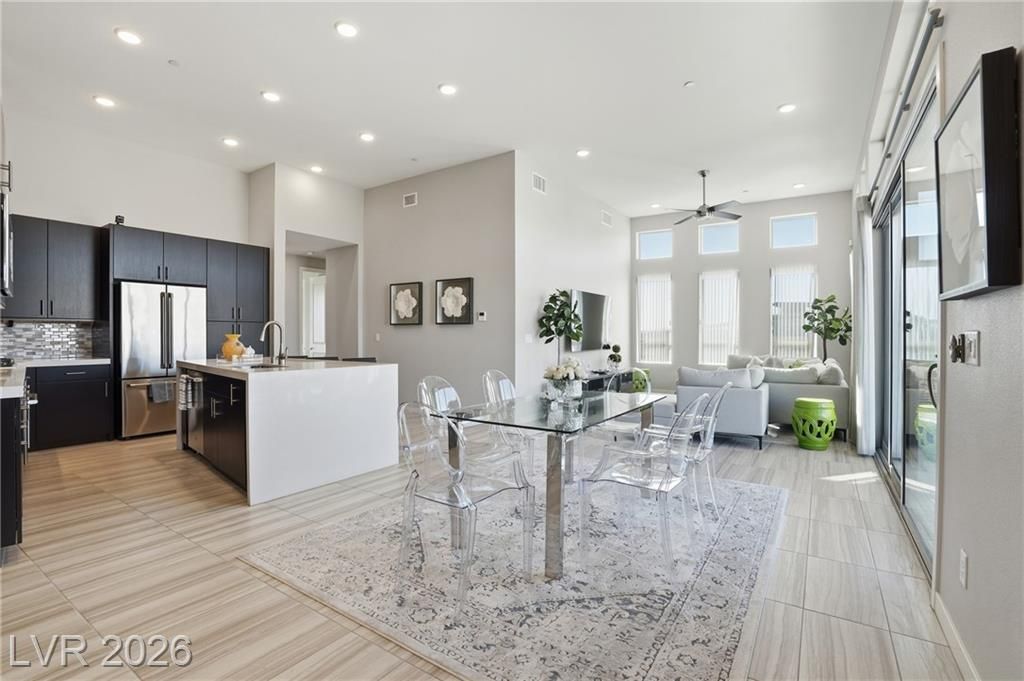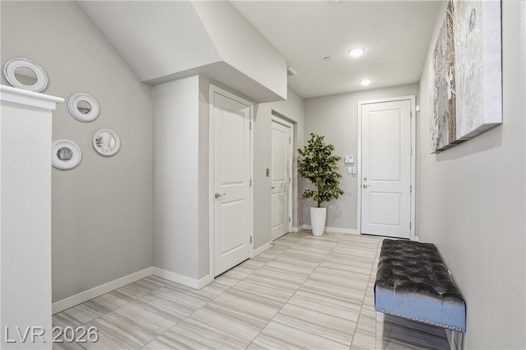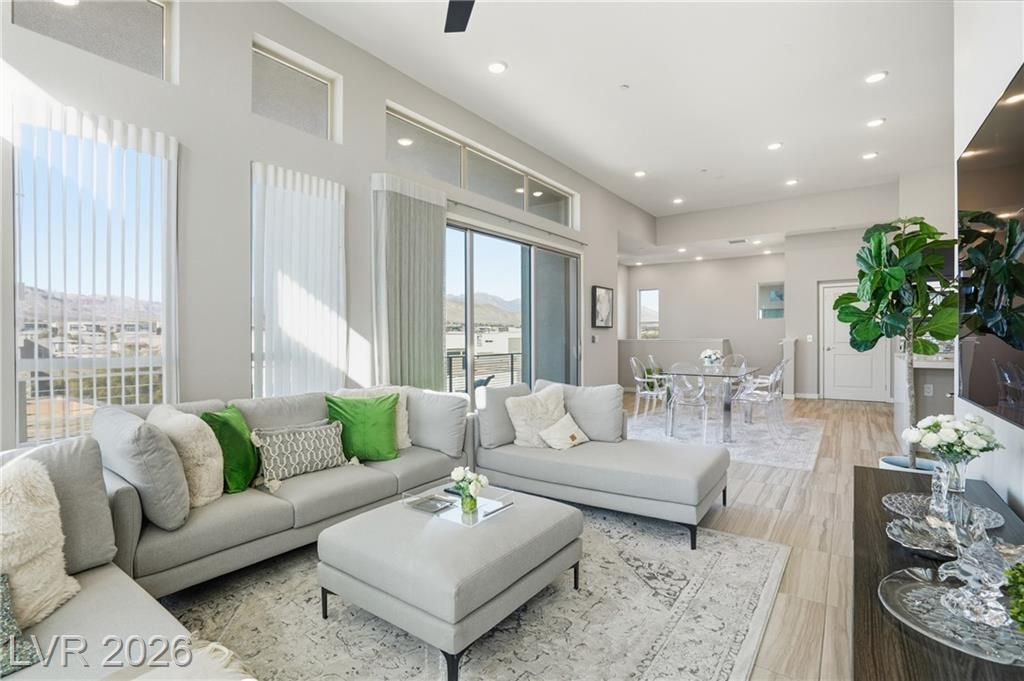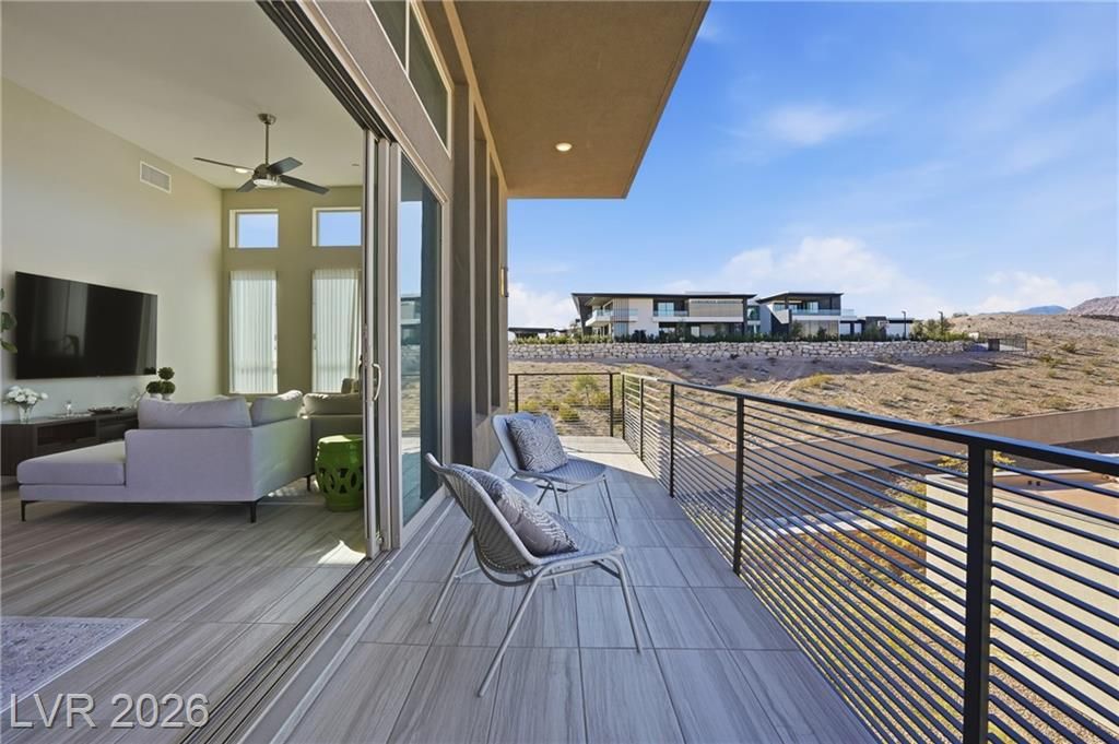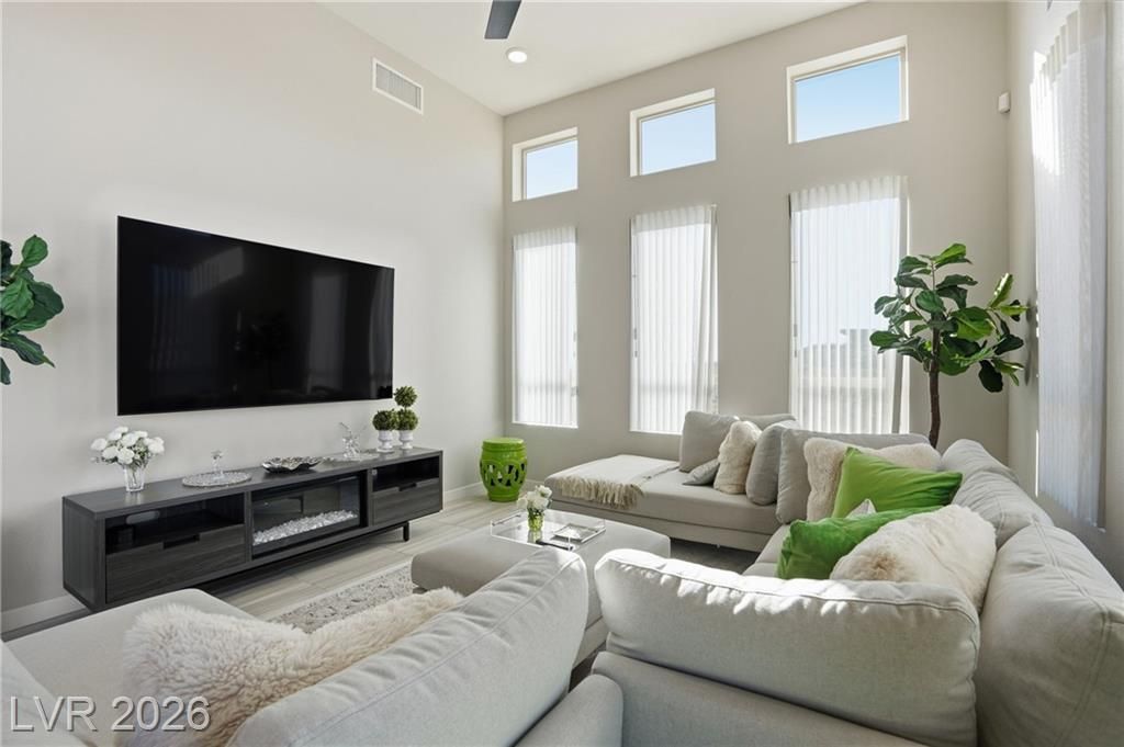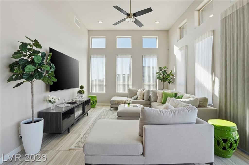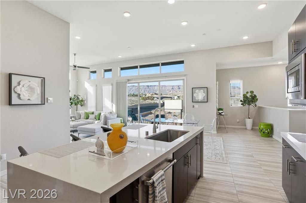 Stunning residence in guard-gated Trilogy in Summerlin featuring single-level luxury living on an upper floor with elevator access, 2 bedrm plus den, 2.5 baths, & an open, modern great room design ideal for entertaining. An expansive chef’s kitchen with a large island, sleek cabinetry, & quartz-style counters flows seamlessly into the dining, living areas & out to a generous covered deck for true indoor–outdoor living. The elegant primary suite offers a spa-inspired bath with an oversized shower & walk-in closet, while the private ensuite guest room & separate den provide flexible space for an office or visiting family. Home also includes an oversized laundry/SmartSpace with extra storage, an attached 2-car garage. Trilogy’s resort amenities include a clubhouse, fitness center, pool, & a vibrant 55+ lifestyle. This is where neighbors become friends, & events bring people together. The lifestyle is centered around the Outlook club, making it one of the most sought-after 55+ communities.