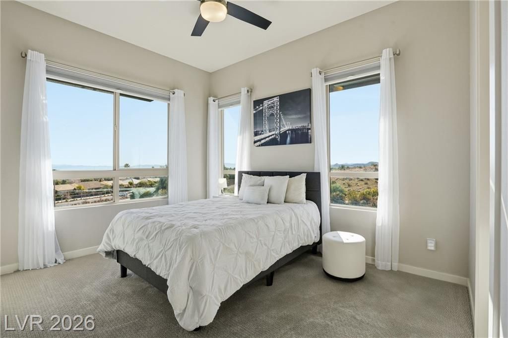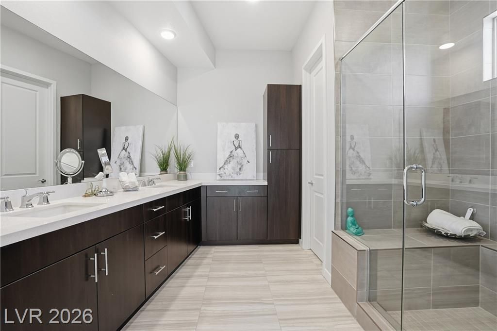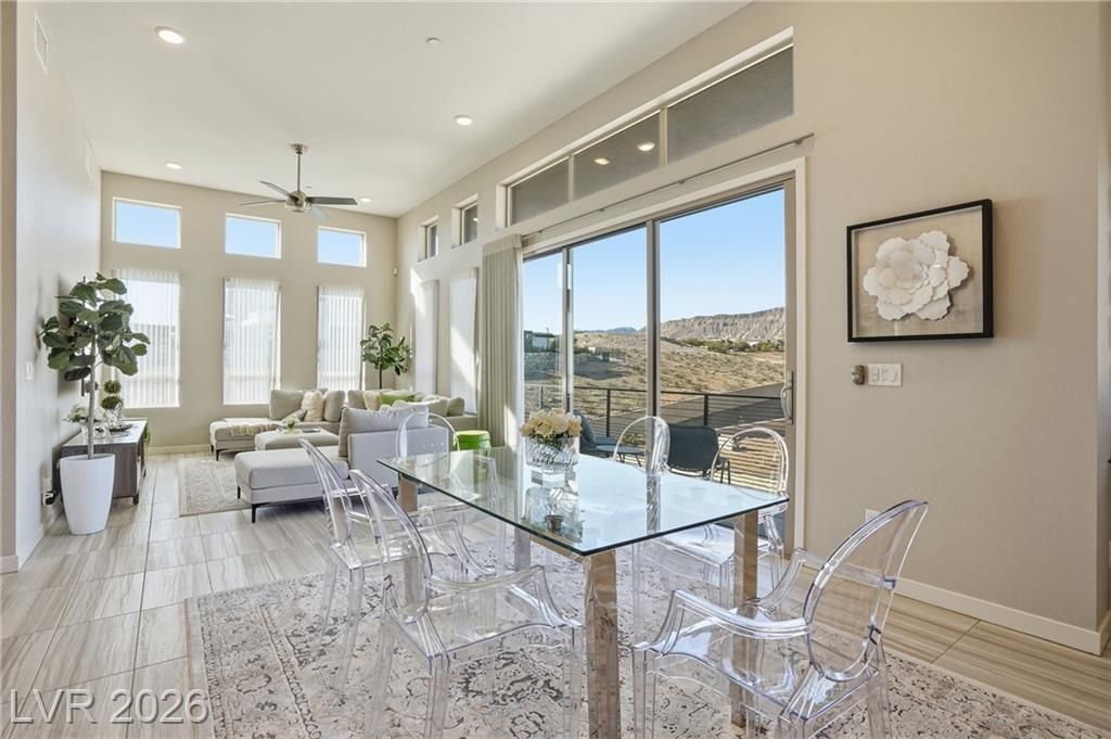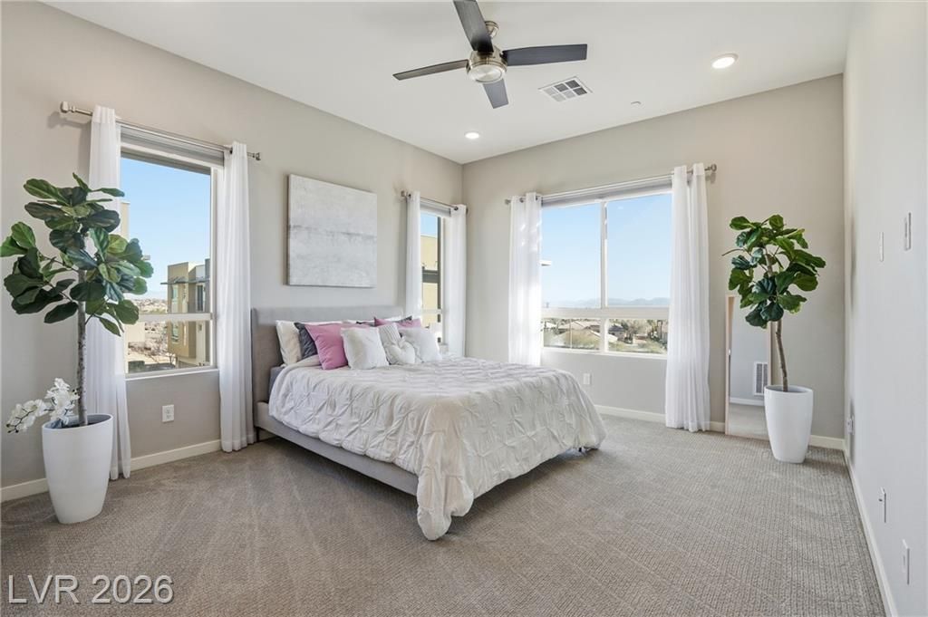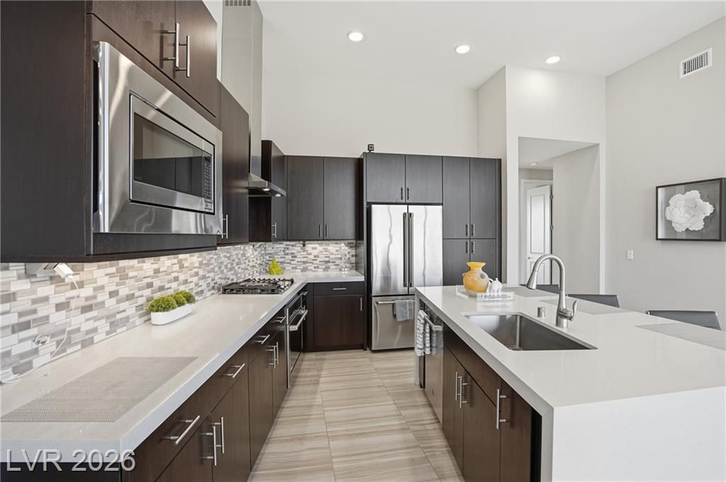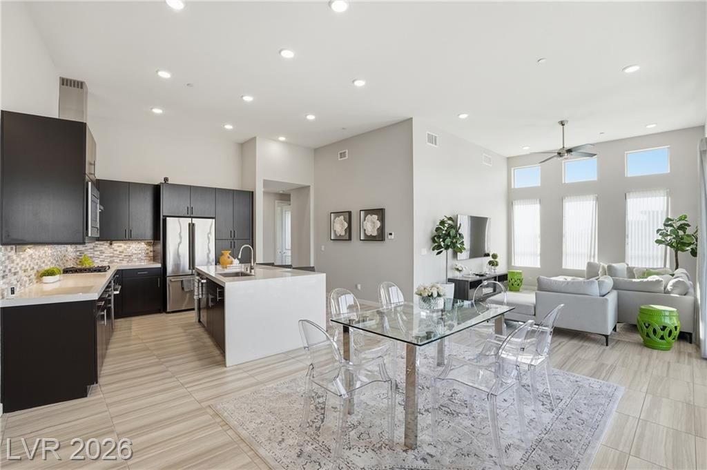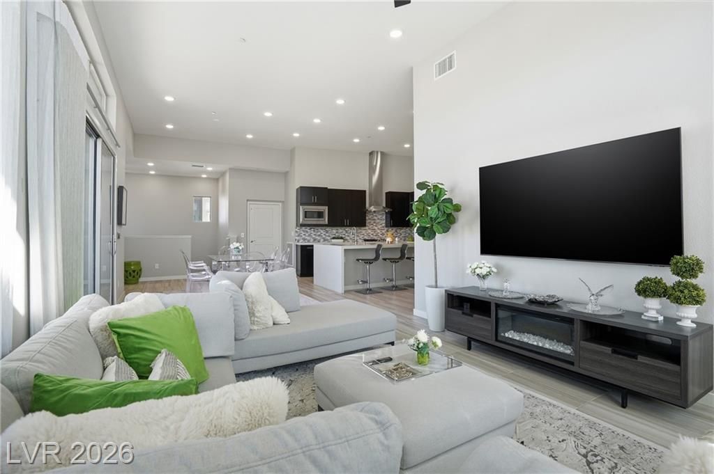 Stunning residence in guard-gated Trilogy in Summerlin featuring single-level luxury living on an upper floor with elevator access, 2 bedrm plus den, 2.5 baths, & an open, modern great room design ideal for entertaining. An expansive chef’s kitchen with a large island, sleek cabinetry, & quartz-style counters flows seamlessly into the dining, living areas & out to a generous covered deck for true indoor–outdoor living. The elegant primary suite offers a spa-inspired bath with an oversized shower & walk-in closet, while the private ensuite guest room & separate den provide flexible space for an office or visiting family. Home also includes an oversized laundry/SmartSpace with extra storage, an attached 2-car garage. Trilogy’s resort amenities include a clubhouse, fitness center, pool, & a vibrant 55+ lifestyle. This is where neighbors become friends, & events bring people together. The lifestyle is centered around the Outlook club, making it one of the most sought-after 55+ communities.