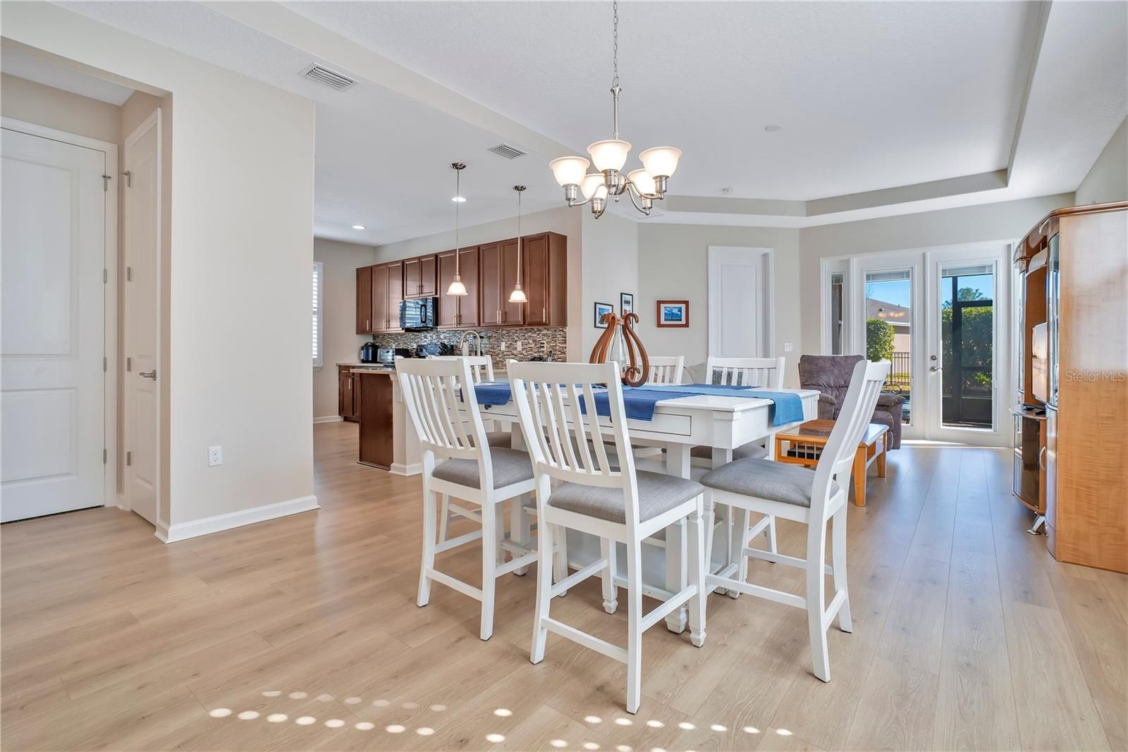 Welcome to low-maintenance living in this well-designed patio home, ideally situated toward the back of a desirable 55+ community for a quieter, more peaceful setting AWAY FROM through traffic. Resort-style living awaits in the gated, guard-attended Victoria Gardens community. Qualified buyers can TAKE ADVANTAGE of a 1% interest rate buy-down for the first year when using the seller’s preferred lender. That lender will pay to temporarily reduce your rate for year one, PLUS credit your appraisal fee back at closing, a $500 value. Plantation shutters throughout provide a clean, classic look and excellent light control, allowing you to maintain privacy without sacrificing natural light. The kitchen features a walk-in pantry, granite countertops, decorative backsplash and generous counter space. A large kitchen window offers the perfect spot for a rolling island cart to add even more workspace. No wasted space. The combined living and dining areas are highlighted by a single tray ceiling that visually unites the space. Nine-foot ceilings help with efficient heating and cooling while creating an open, comfortable feel. Laminate flooring throughout makes cleanup easy and is ideal for allergy-conscious buyers. The primary bedroom suite features a decorative tray ceiling, two walk-in closets, and an en suite bath with double vanities and a walk-in shower. Open up your living space to the outdoors with beautiful French doors that lead to a screened porch with pavers that overlook a privacy hedge backdrop for a peaceful view. The backyard offers space for pets, and approved fence option. Keep laundry and household tasks out of sight and out of the way with a separate laundry room. An important convenience many buyers appreciate. Additional features include a gas water heater, with gas options available for the range and dryer. Insurance savings may apply with a fire hydrant located next to the property and a fire station approximately one mile away. Enjoy true lock-and-leave living with lawn care included. HOA dues cover mowing, trimming, edging, weed control, fertilize, mulch, lawn irrigation, cable TV, and internet. Community amenities include a clubhouse, restaurant, poolside dining area, spacious business center, multi-purpose rooms, resort-style pool, pergolas, separate hot tub area, tennis courts, pickleball courts, and gated security. Conveniently located near Victoria Park Village Center with medical offices, pizzeria, ice cream shop, City Wine & Cigar and easy access to I-4. Low-maintenance living, a quiet location, and a layout that simply makes sense—this patio home checks all the right boxes for easy 55+ living.