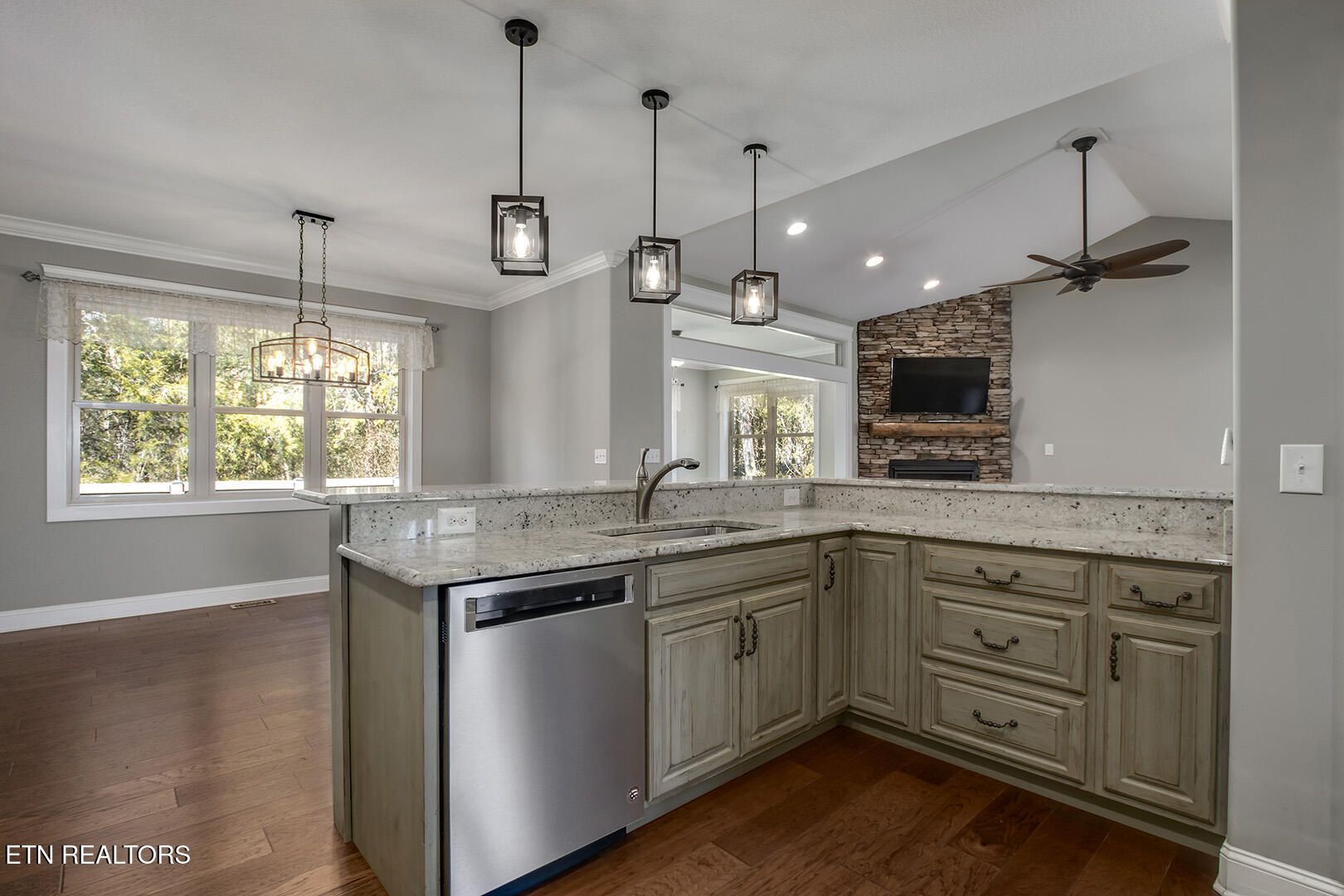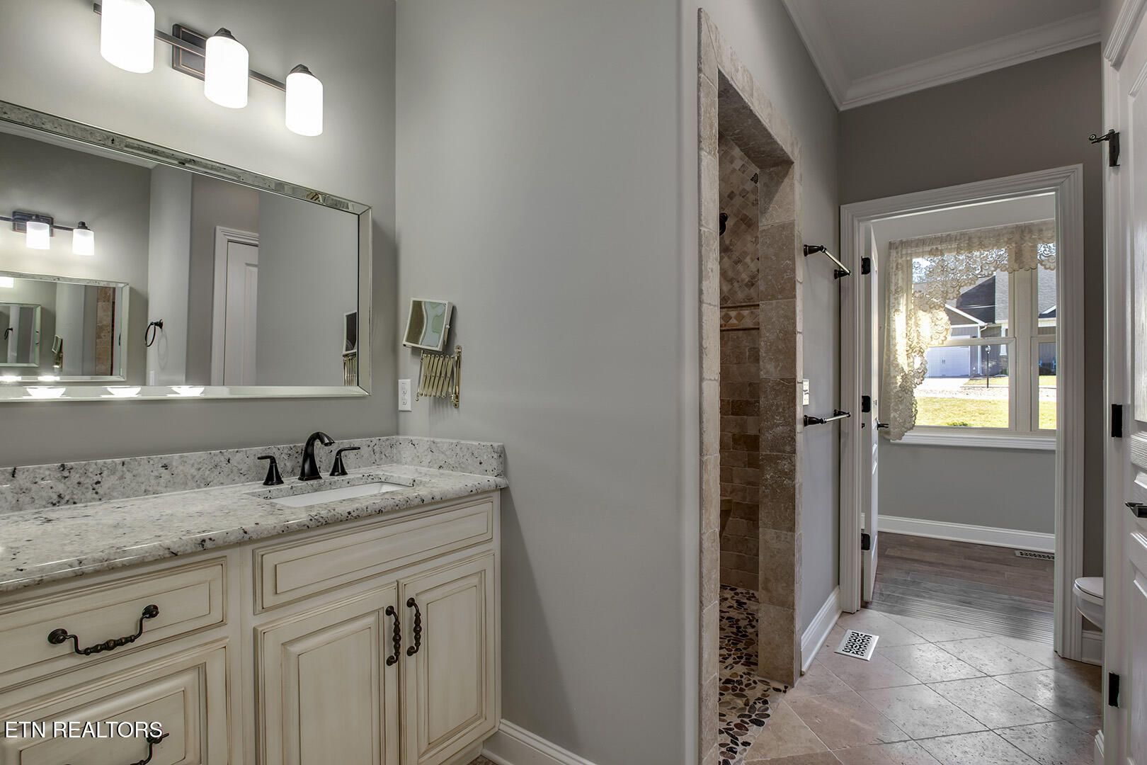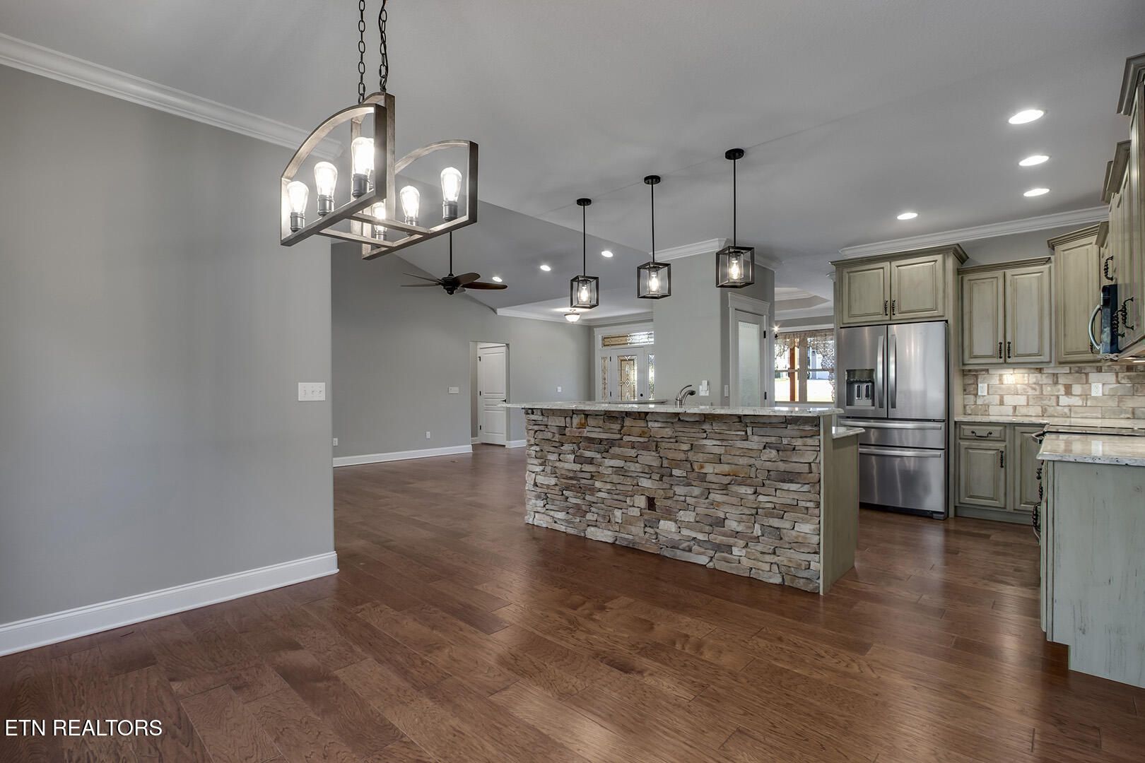The three car garage and the stone front offer great drive by and walk up appeal. The neighborhood has sidewalks and good street lighting. This house has common property behind it. Inside, the kitchen has custom cabinets and granite counter tops and a large pantry. Tray ceilings, walk-in closets, tiled bathrooms,and crown moldings add to the overall appeal. Relax on the private back porch or visit with the friendly neighbors in this great location. If you are looking for a 3 bedroom, 2 and 1/2 bath in a well maintained house, this is a MUST SEE. Square footage is approximate, buyers to verify.