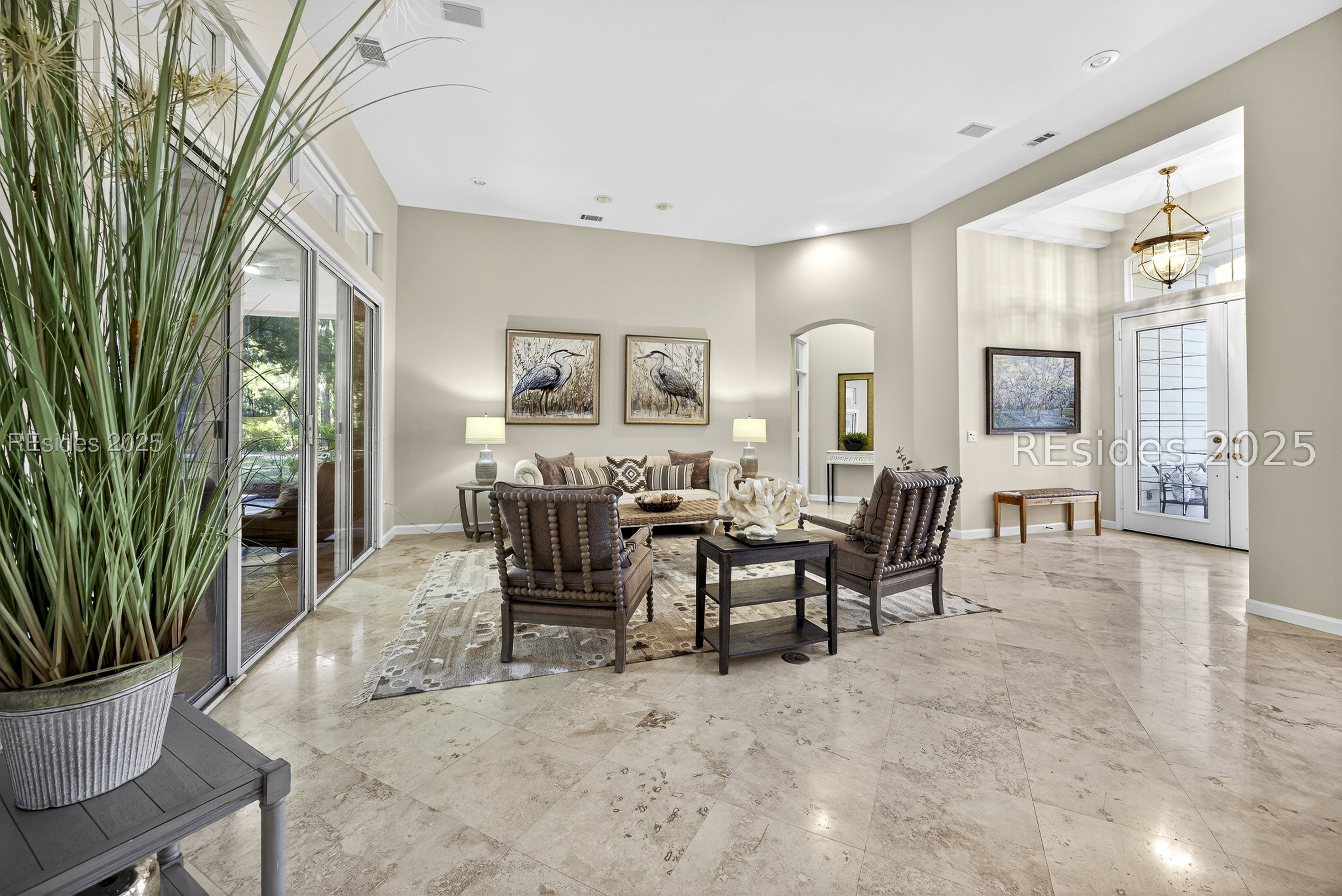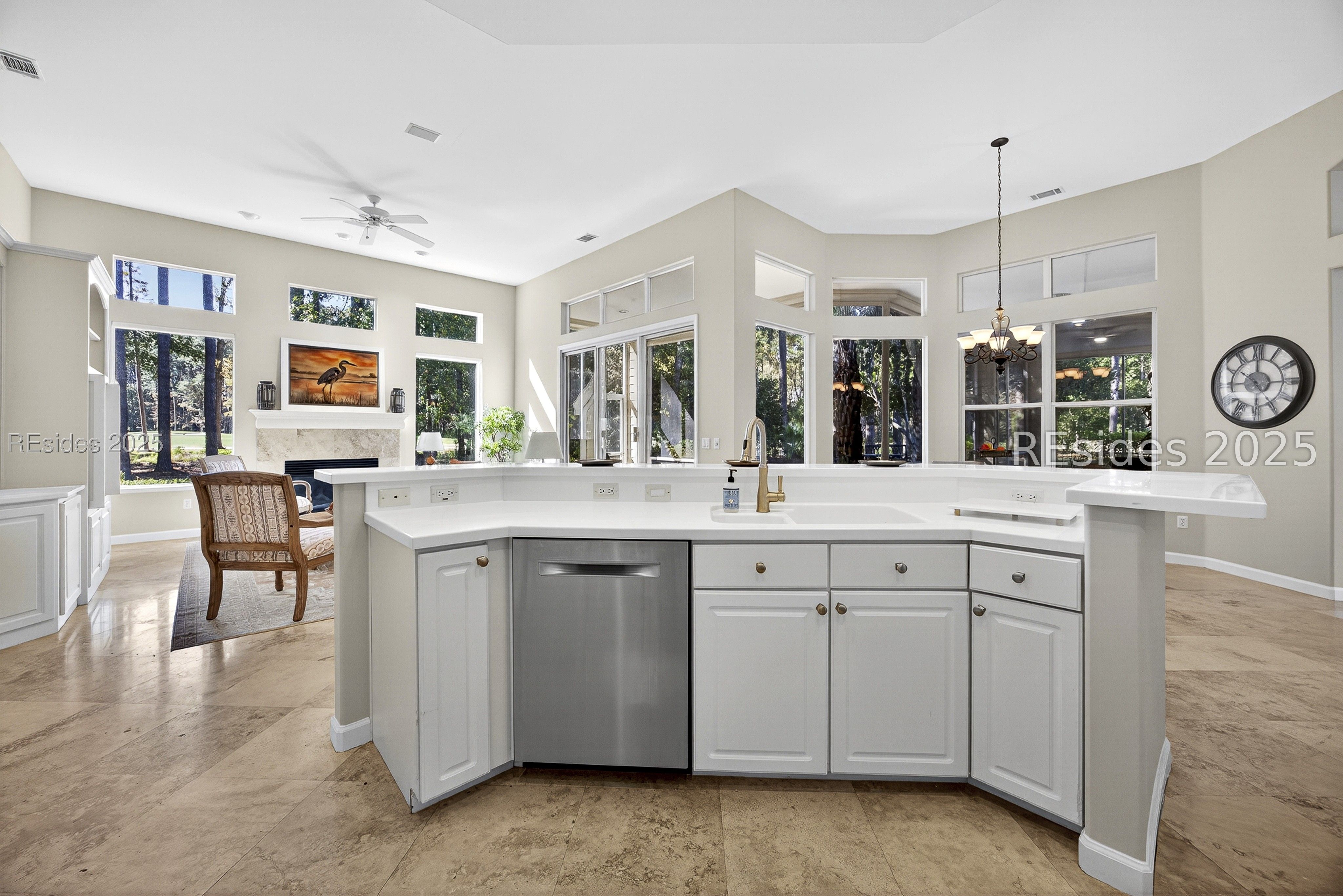 Nestled right off the 7th fairway, this impressive Rutledge/Madison retreat offers a private wooded lot that frames the golf course views while still being close to all Sun City amenities. This expansive home seamlessly combines soaring 12' ceilings, elegant travertine floors, a gas fireplace, with large windows that invite sunshine throughout the home. The open-concept kitchen features gas cooking, stainless appliances, double ovens, and plenty of storage space, and a large island with an integrated two-bowl sink. The primary suite has a luxurious jetted soaking tub, a generous separate shower, and dual vanities with counter space galore. The walk-in closet has extra storage tucked away for less frequently used items like suitcases. The oversized screened porch provides the perfect gathering place beautifully accented with slate, made for relaxing or entertaining in style. The office can easily be converted into a bedroom with a great place for a closet. In addition, there is a two-car garage and a golf cart bay -- all with an epoxy floor. Additional updates include the replacement of all polybutylene plumbing with modern PEX piping for peace of mind and long-term reliability. Located close to Sun City's renowned amenities -- three golf courses, multiple pools, fitness centers, pickleball, tennis, and countless social clubs.