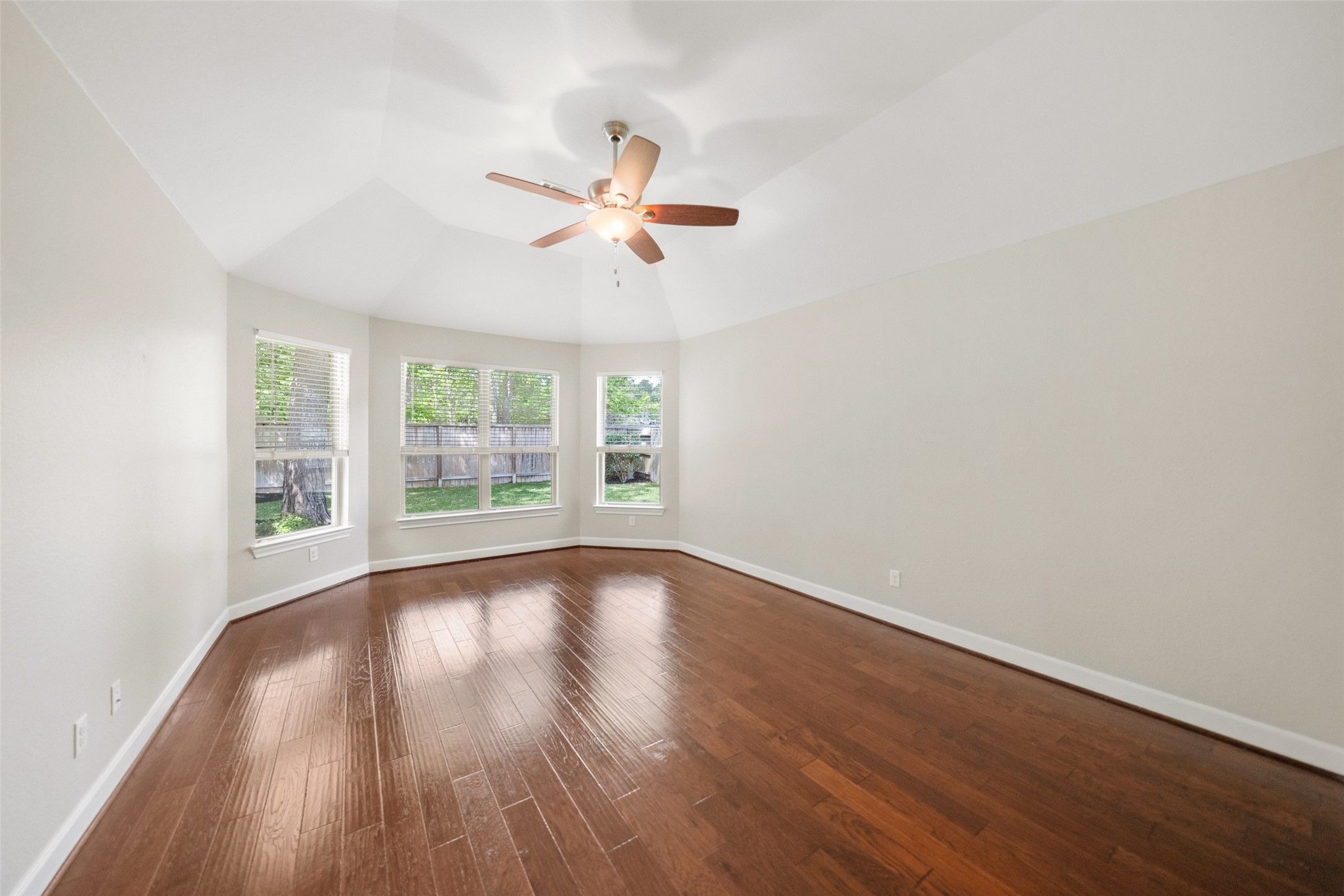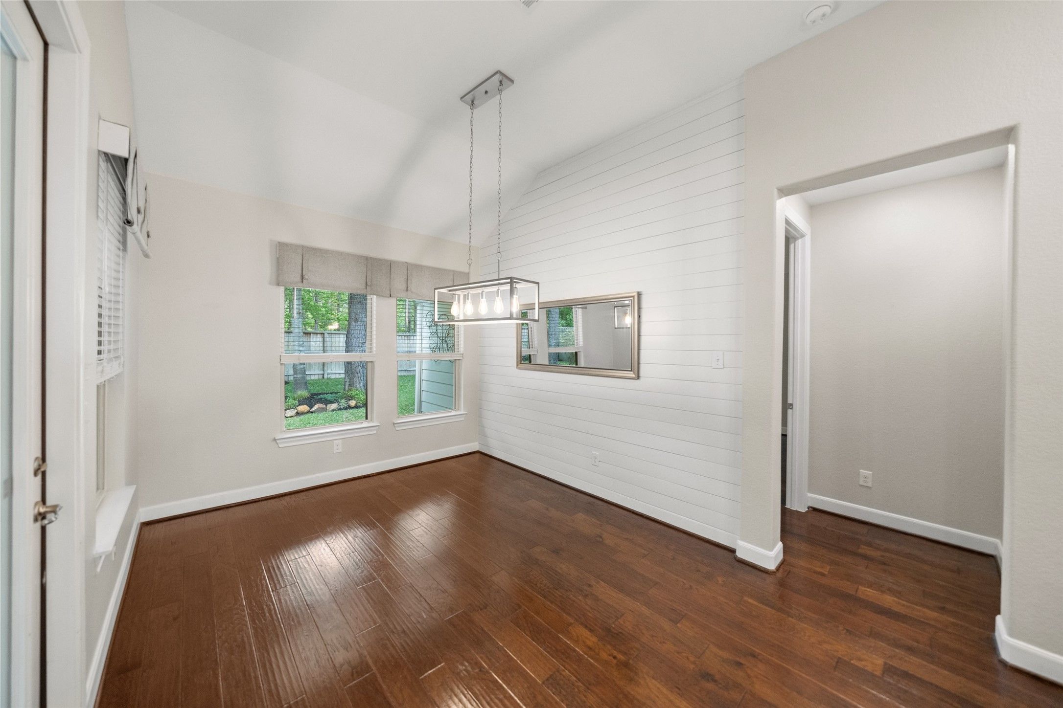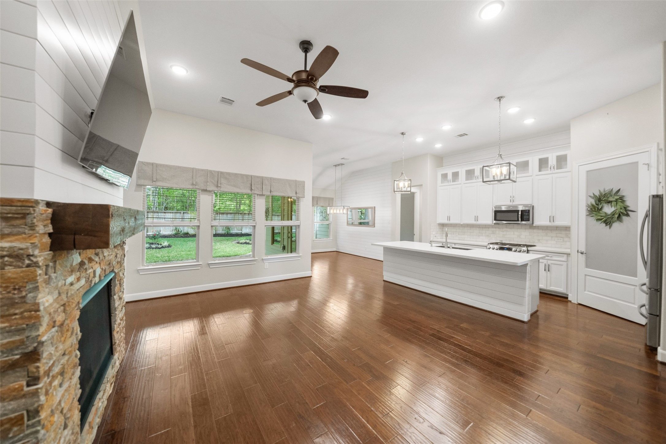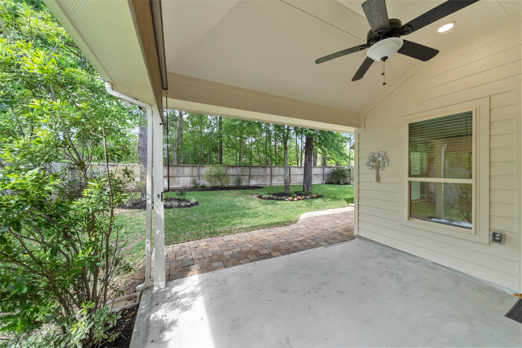 Welcome to 109 Gray Vervain Ct in the highly desirable 55+ Bonterra section of Woodforest. This beautifully designed home features 2 bedrooms, 2 baths, and engineered wood flooring throughout. Ceramic tile flooring in bathrooms and closets. The spacious primary suite offers a spa-like retreat with large walk-in shower, dual sinks, vanity, and spacious walk-in closet. Stylish custom accent lighting enhances the home’s charm, while the covered patio is perfect for year-round relaxation or entertaining. Built by Taylor Morrison, this home also includes a versatile flex room or office with a custom Murphy bed, barn doors, and abundant storage. Enjoy the open-concept kitchen, dining, and living space ideal for modern living. Serene backyard with no rear neighbors, offering added privacy. Located on a quiet cul-de-sac street with no through traffic. Conveniently located near Bonterra amenities and nearby shopping and dining, this home has it all! Can close fast.