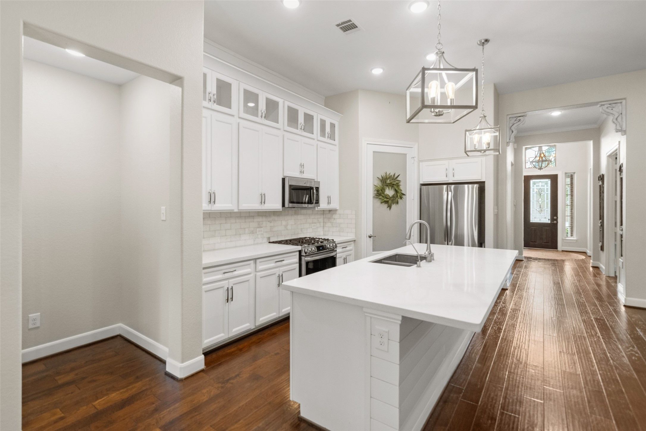 - Handicap Access, High Ceilings, Kitchen Island, Kitchen/Family Room Combo, Quartz Countertops, Walk-In Pantry, Ceiling Fan(s), Programmable Thermostat