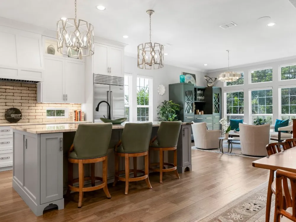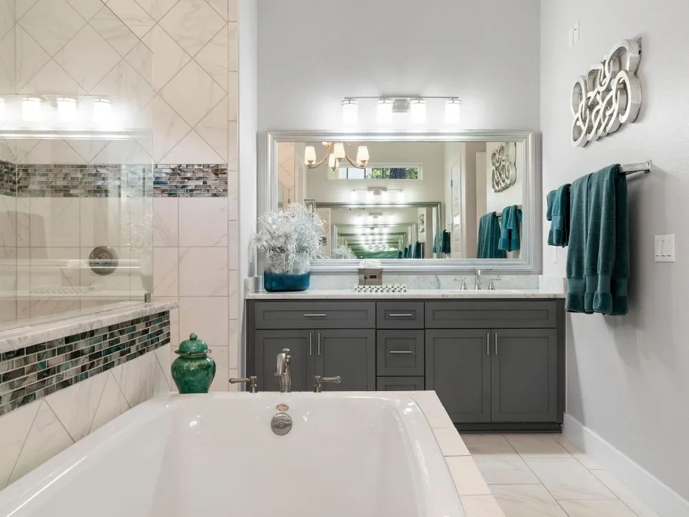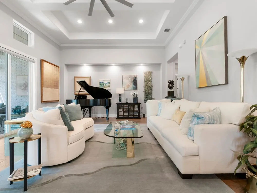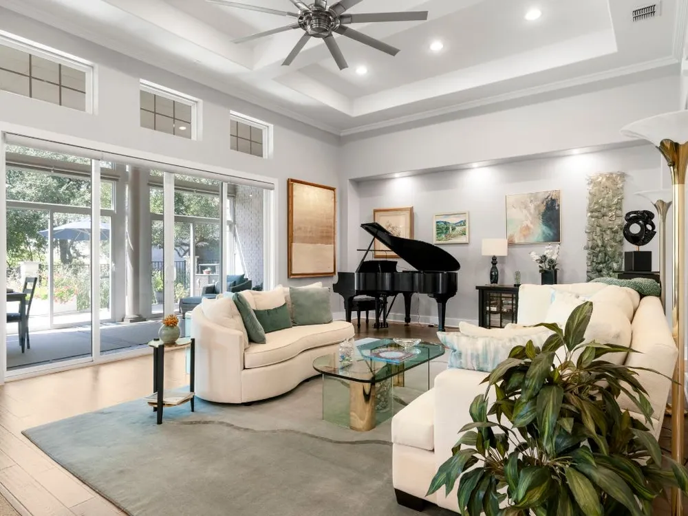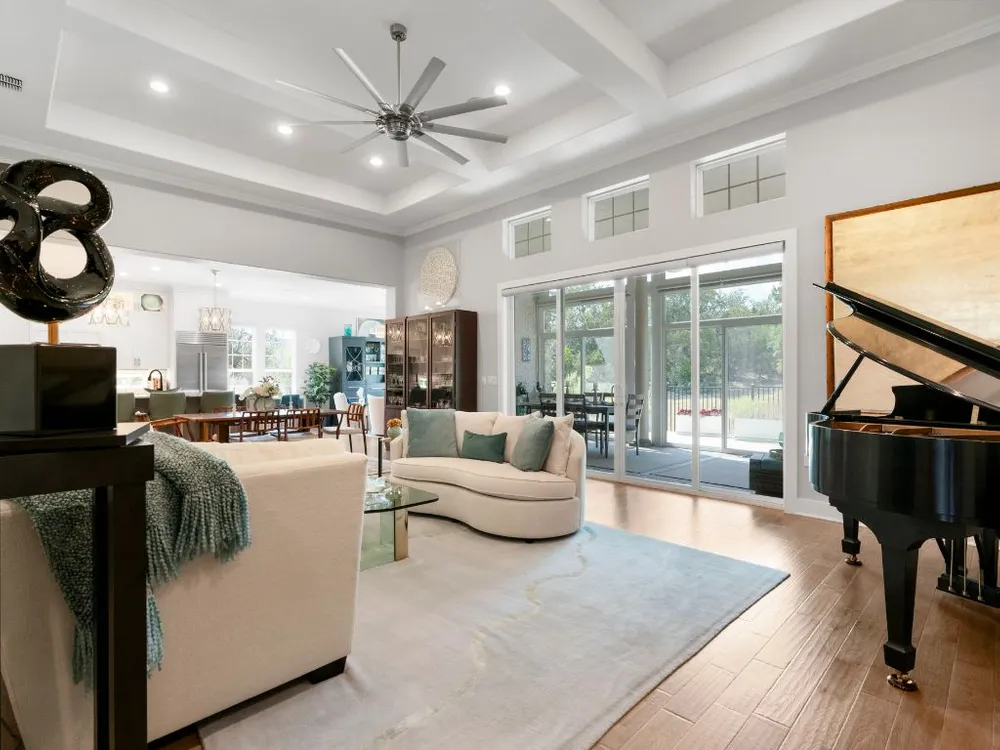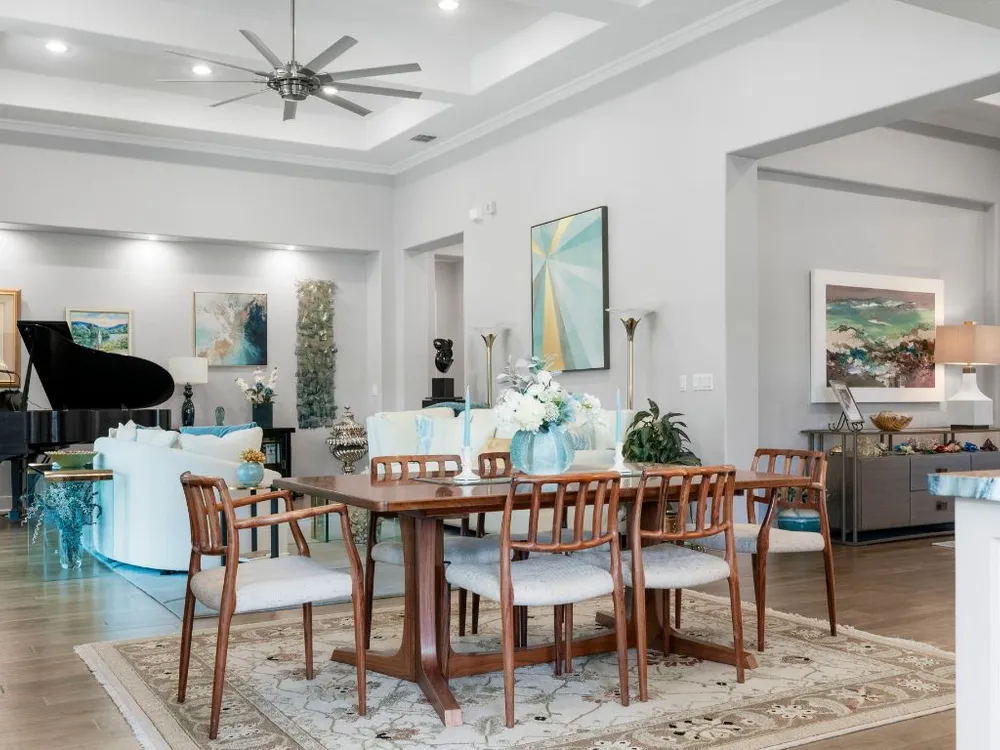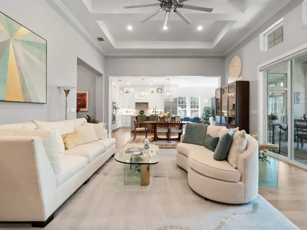 - Built-in Features, Tray Ceiling(s), Ceiling Fan(s), Chandelier, Crown Molding, Dry Bar, Coffered Ceiling(s), Double Vanity, Entrance Foyer, Granite Counters, High Ceilings, In-Law Floorplan, Kitchen Island, Multiple Living Areas, Main Level Primary, Multiple Primary Bathrooms, NoInteriorSteps, Open Floorplan, Storage, Soaking Tub, Walk-In Closet(s)