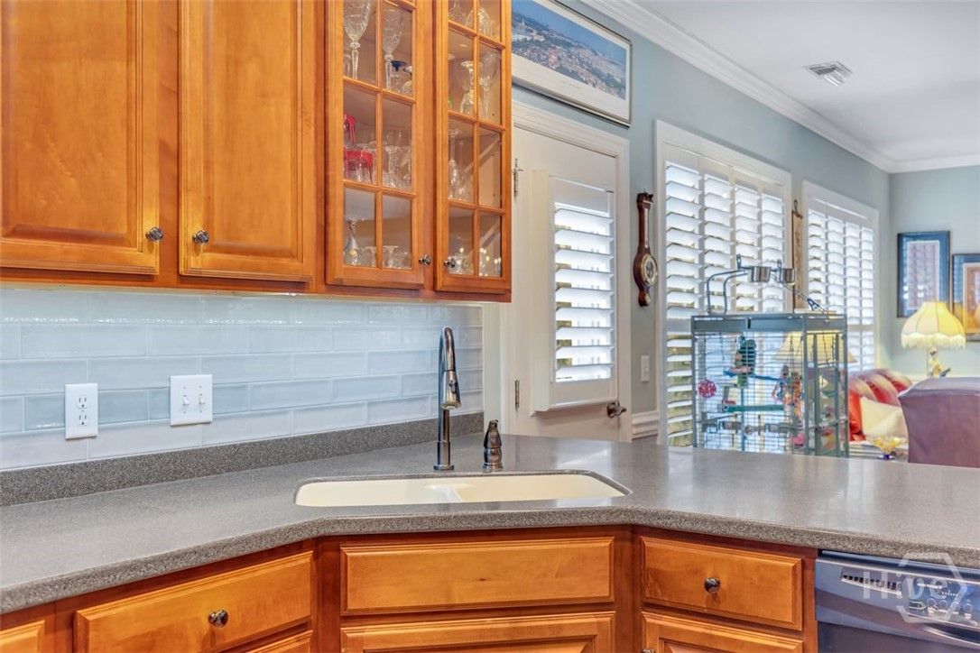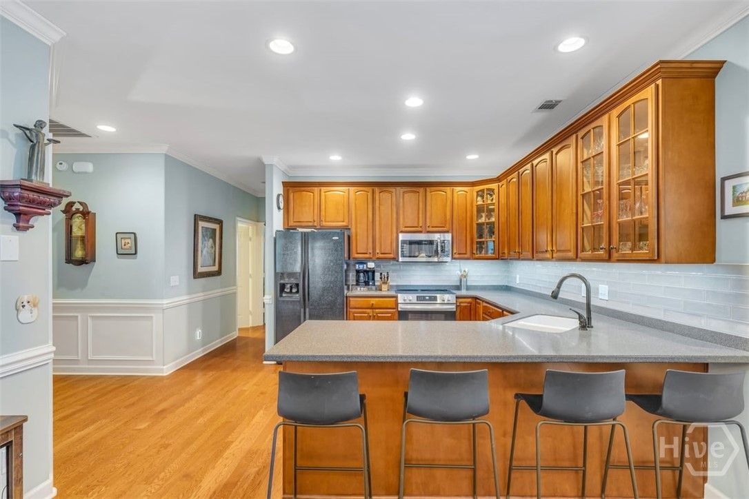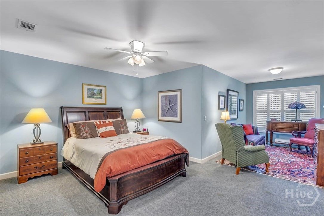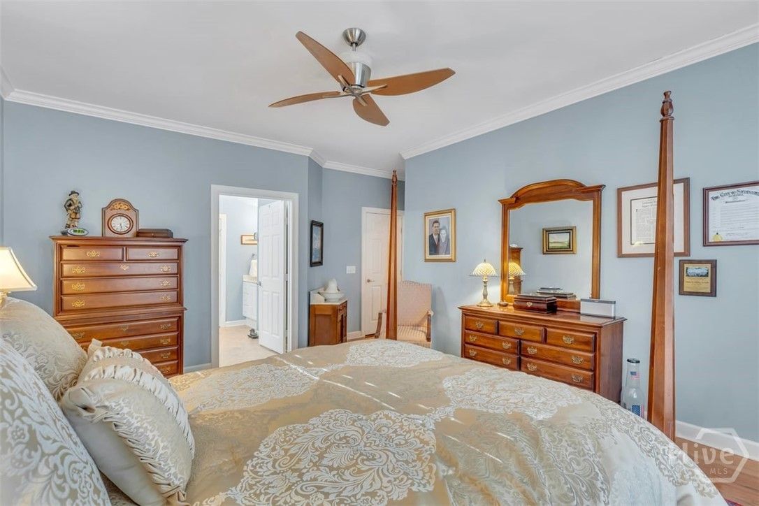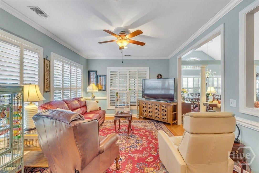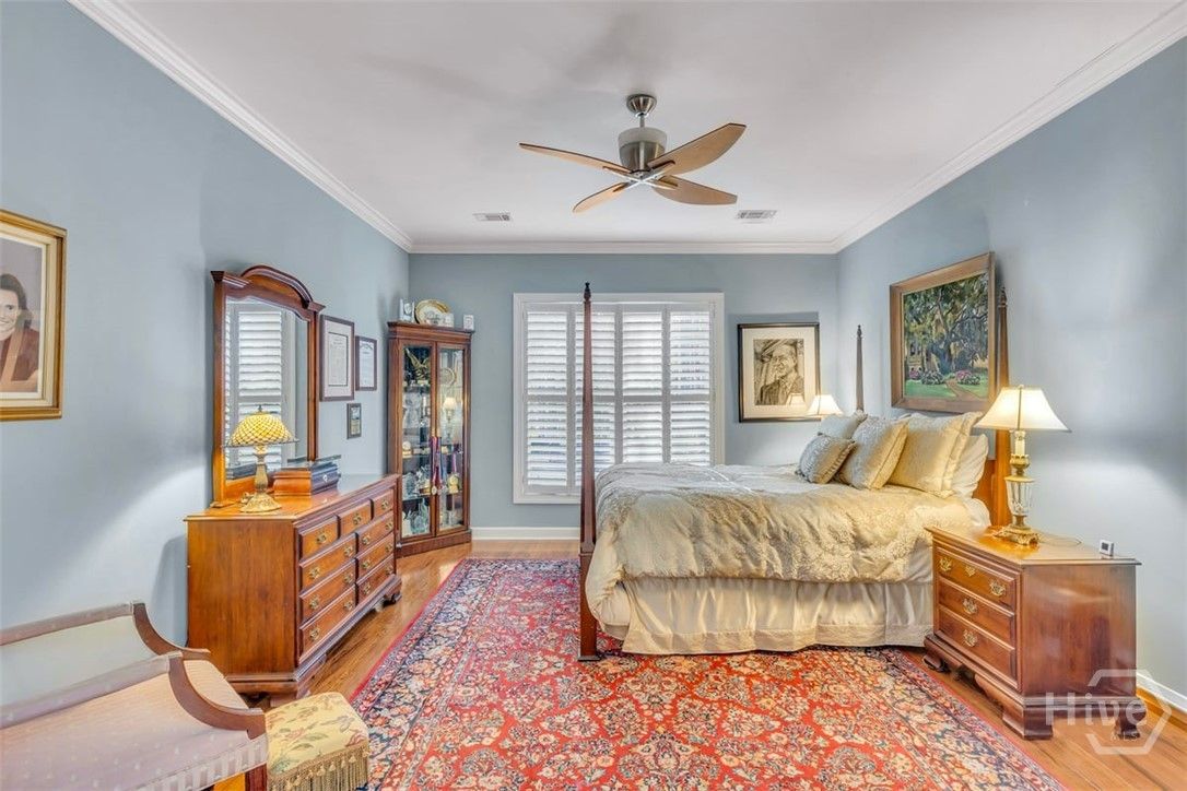 This 4BR/3BA townhome in Westbrook at Savannah Quarters offers 3,239 square feet of well-designed living space with two bedrooms on the main level and two upstairs. The kitchen features rich brown cabinetry, pantry storage, premium appliances, and a breakfast bar that opens to a gracious den. The generous living room boasts a cathedral ceiling, gas fireplace, mantle, and built-in bookshelves, complemented by a formal dining room. The main-level owner’s suite includes a spacious bath with double vanities and a custom walk-in closet. A second bedroom or office, full bath, and laundry are also conveniently located on the main floor. Upstairs, two large bedrooms share a Jack-and-Jill bath. A screened porch overlooks the fenced yard and wooded backdrop for added privacy. Upgrades include custom wood shutters, crown molding with bullnosed corners, chair rail, and a new roof.