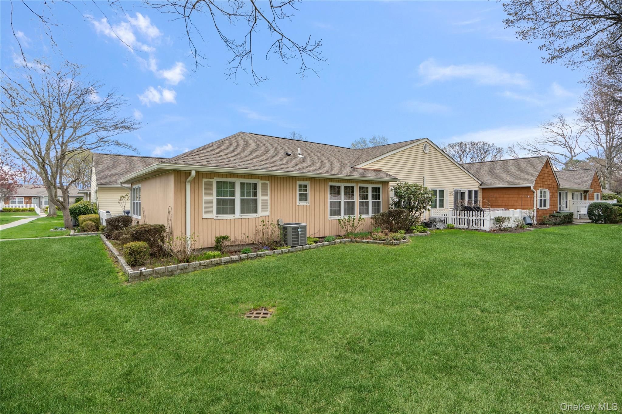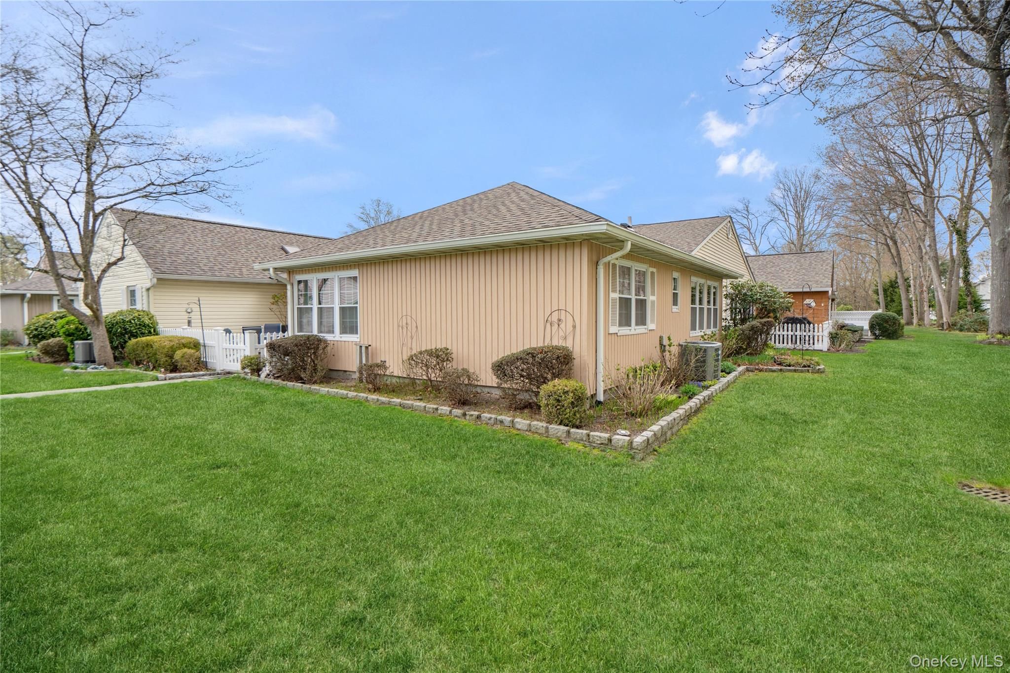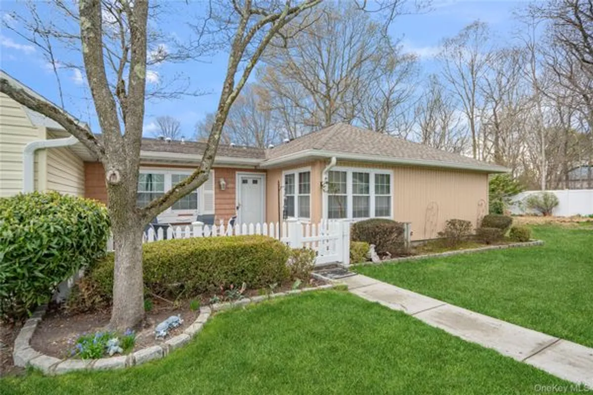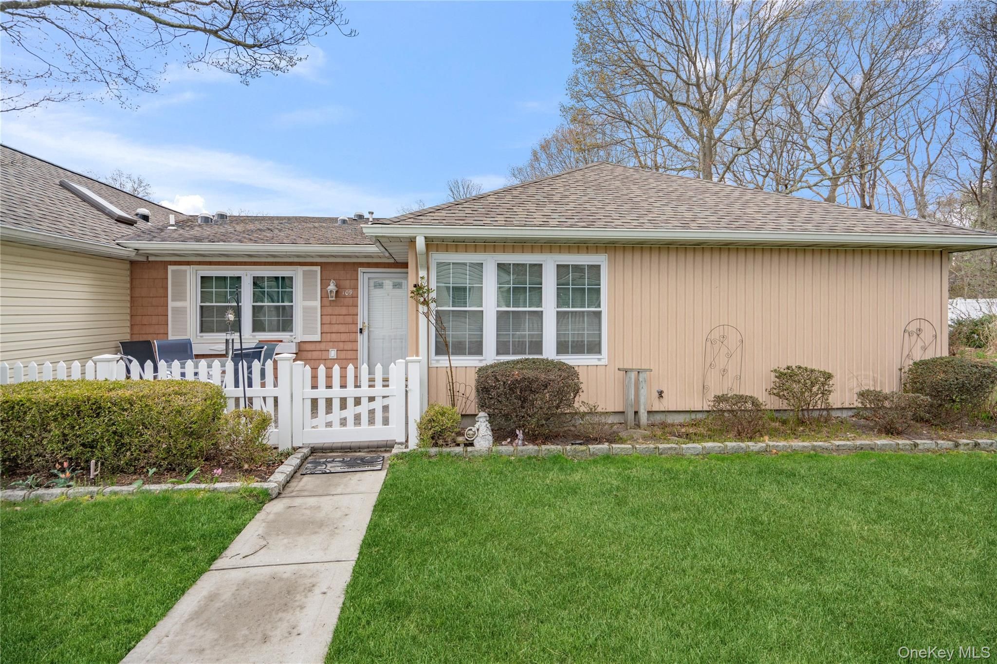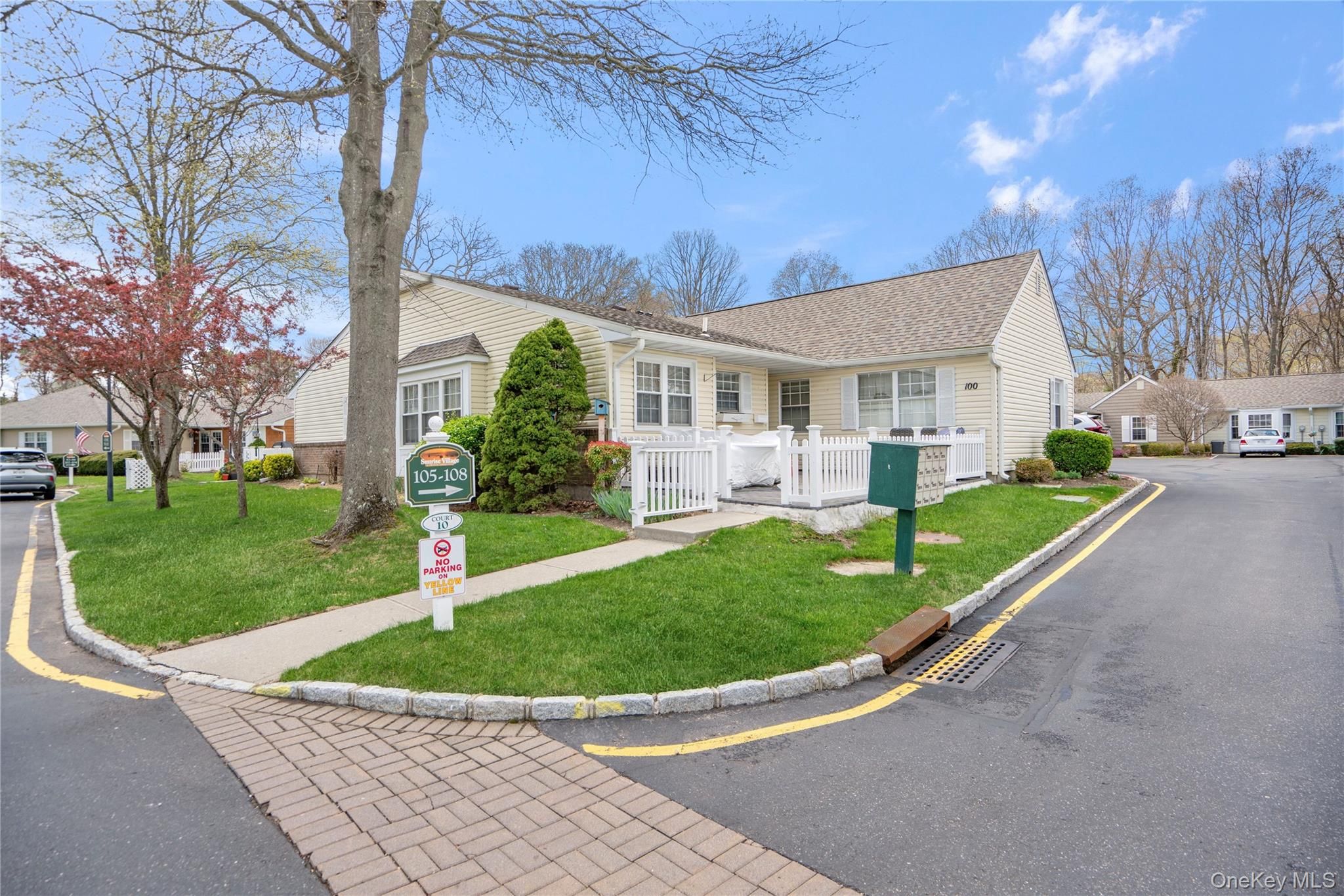 Welcome to 109 Revere Drive, a 2-Bed, 2 Bath, ranch style home in Sayville's desirable SUNRISE VILLAGE...a 55+, Gated Community! This end unit, Dartmouth model, offering approx 1,273 sqft of living space, provides an updated kitchen, dining room, living room, two bedrooms, two full bathrooms, a large laundry/storage room and a 1-car garage with an electric garage door opener and pull down stairs to the attic for additional storage. A paver stone patio with a vinyl fence and gate, welcomes you home to this great unit. The patio is large enough for outdoor dining, entertaining or just relaxing in the outdoors. Enter in off the patio to a long entry foyer with vinyl, wood laminate flooring and a coat closet. Off the foyer is the dining room and living room, both carpeted and featuring crown moldings, two solar tubes and an oversized window for lots of natural light. The laminate flooring & crown moldings continue into the Eat-In Kitchen, which has updated cabinetry and granite counter tops with a tiled backsplash. The kitchen's dining area is cornered between the front & side wall windows for great natural light. Down the carpeted hall from the kitchen is a linen closet and a full bathroom with an updated granite topped vanity and glass sliding doors to the tub/shower. The second bedroom/home office provides a carpeted floor, crown moldings, a double closet, a built-in desk & storage center and a pull down Murphy Bed to provide maximum floor space when the bed is not needed. On the opposite side of the home and off the end of the entry foyer, is the hallway to the primary bedroom and ensuite. This bedroom, which is also carpeted and adorned by the crown moldings, is large enough to accommodate a king sized bed and provides a linen closet, walk-in closet and it's own full bath with a walk-in stalled shower and solar tube for ample lighting in the daytime. In the hallway beyond the primary bedroom is the access to the large laundry room, which is complimented with upper and lower cabinetry with a long counter top directly across from the washer & dryer...perfect for folding & sorting clothes and for additional storage. Off the laundry room is a door to the hallway leading to the 1-car garage with the electric garage door opener and pull down attic stairs. Beyond the garage door is a covered extension for the garbage & recycling pails, and the outdoor parking space for this unit. This great home also provides the comfort of Central Air Conditioning, an Electric Hot Water Heater and eight independent electric thermostats so you can comfortably & economically heat each room as desired. Sunrise Village is a Planned Unit Development (PUD) managed by Fairfield Properties, and there is a one-time $1,000 transfer fee paid to Fairfield by the new owner.