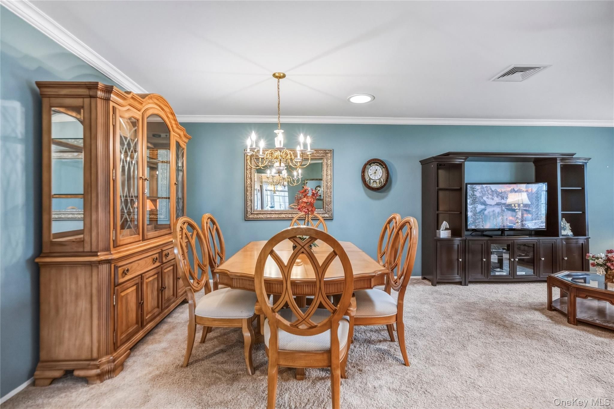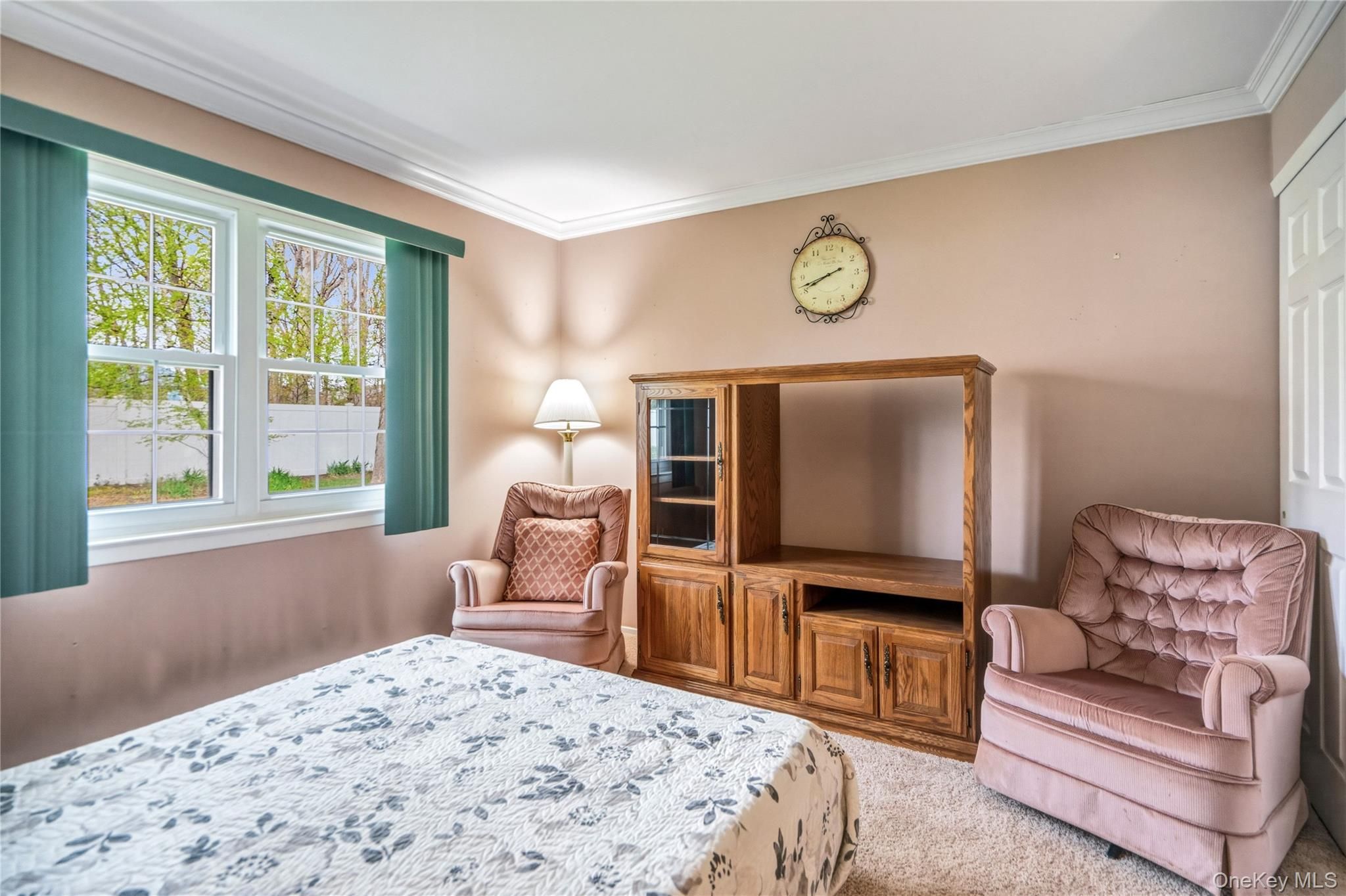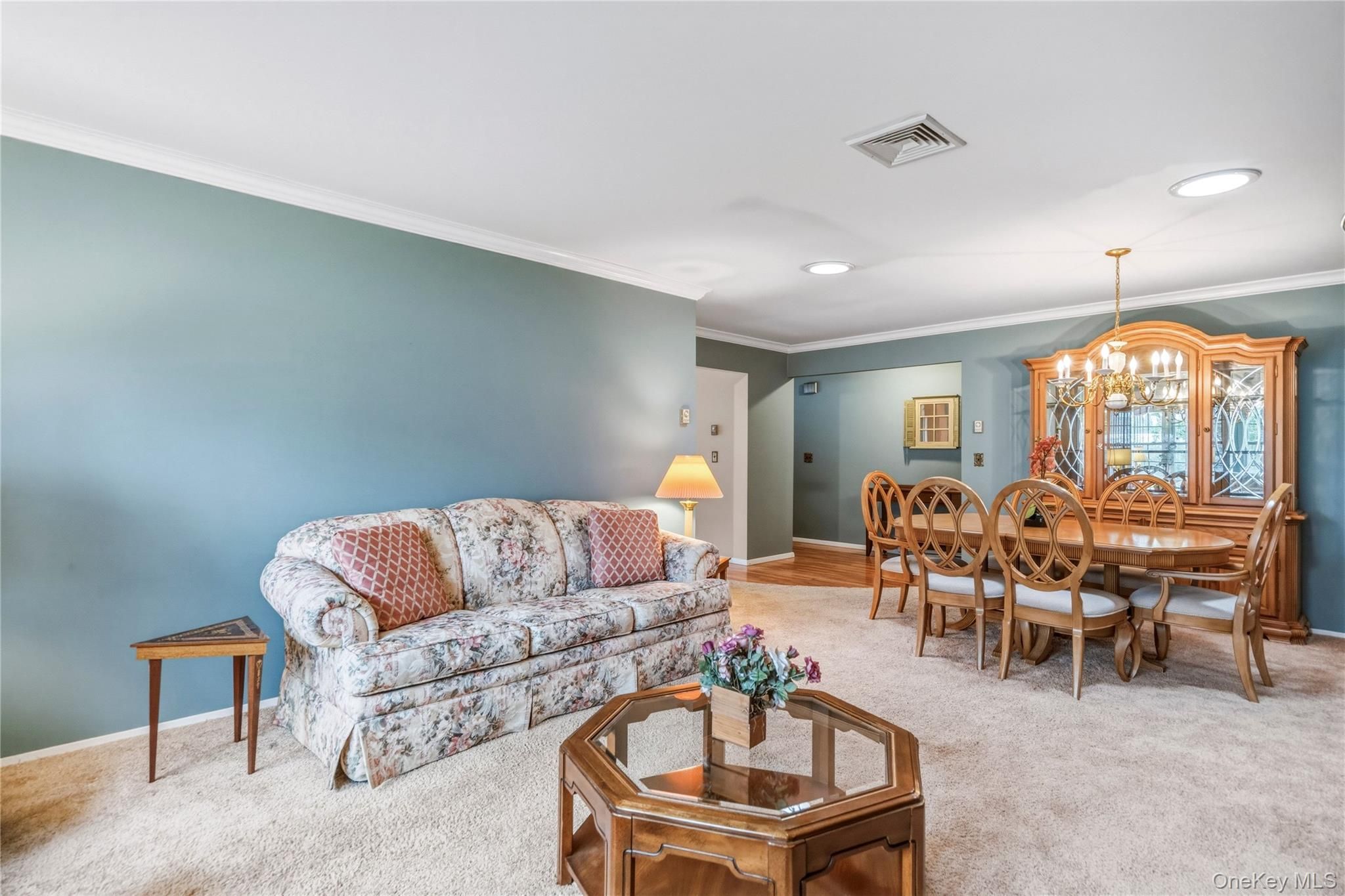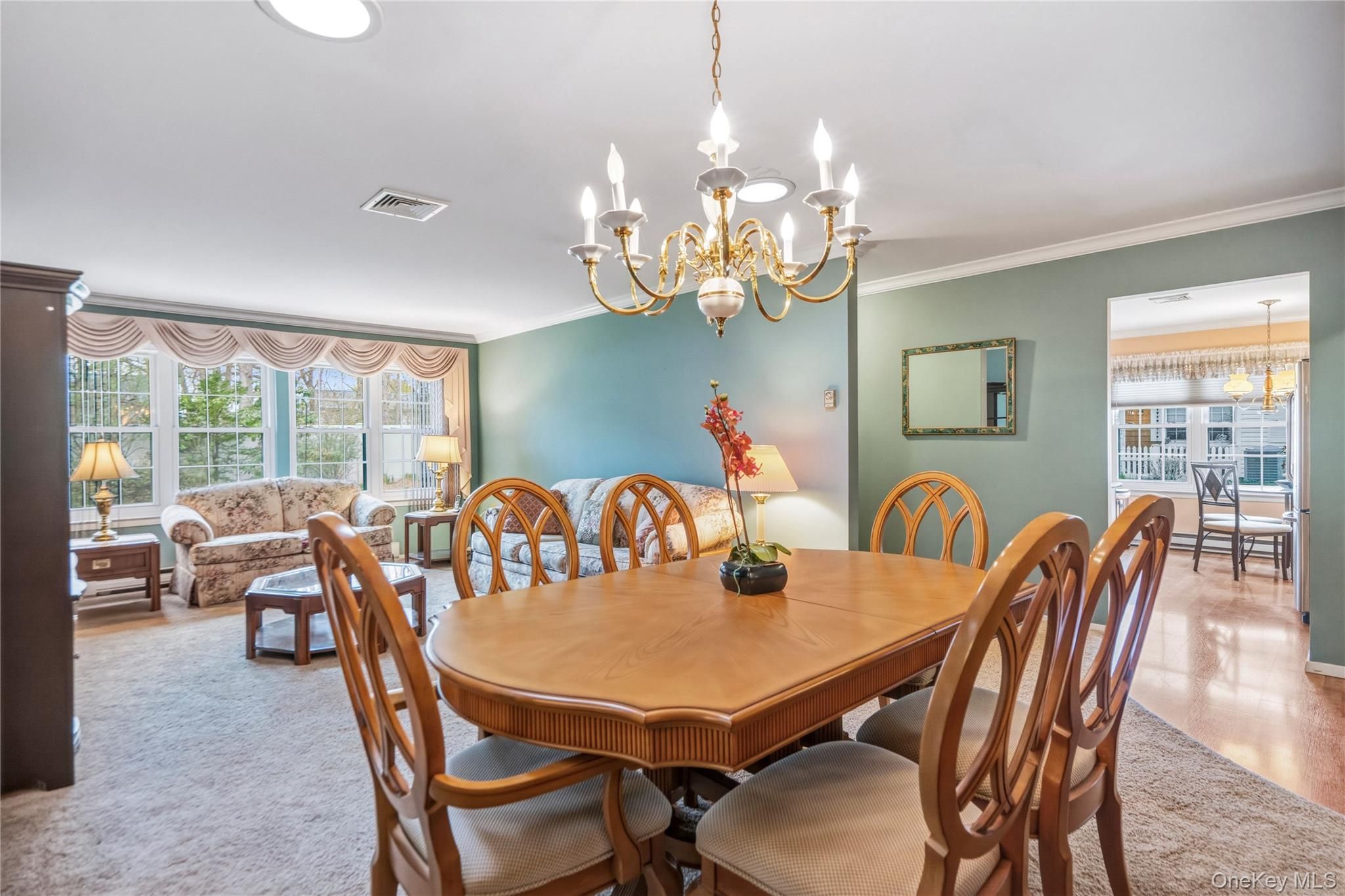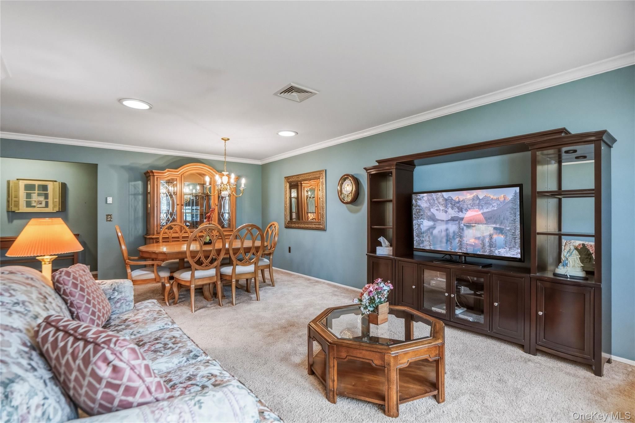 Welcome to 109 Revere Drive, a 2-Bed, 2 Bath, ranch style home in Sayville's desirable SUNRISE VILLAGE...a 55+, Gated Community! This end unit, Dartmouth model, offering approx 1,273 sqft of living space, provides an updated kitchen, dining room, living room, two bedrooms, two full bathrooms, a large laundry/storage room and a 1-car garage with an electric garage door opener and pull down stairs to the attic for additional storage. A paver stone patio with a vinyl fence and gate, welcomes you home to this great unit. The patio is large enough for outdoor dining, entertaining or just relaxing in the outdoors. Enter in off the patio to a long entry foyer with vinyl, wood laminate flooring and a coat closet. Off the foyer is the dining room and living room, both carpeted and featuring crown moldings, two solar tubes and an oversized window for lots of natural light. The laminate flooring & crown moldings continue into the Eat-In Kitchen, which has updated cabinetry and granite counter tops with a tiled backsplash. The kitchen's dining area is cornered between the front & side wall windows for great natural light. Down the carpeted hall from the kitchen is a linen closet and a full bathroom with an updated granite topped vanity and glass sliding doors to the tub/shower. The second bedroom/home office provides a carpeted floor, crown moldings, a double closet, a built-in desk & storage center and a pull down Murphy Bed to provide maximum floor space when the bed is not needed. On the opposite side of the home and off the end of the entry foyer, is the hallway to the primary bedroom and ensuite. This bedroom, which is also carpeted and adorned by the crown moldings, is large enough to accommodate a king sized bed and provides a linen closet, walk-in closet and it's own full bath with a walk-in stalled shower and solar tube for ample lighting in the daytime. In the hallway beyond the primary bedroom is the access to the large laundry room, which is complimented with upper and lower cabinetry with a long counter top directly across from the washer & dryer...perfect for folding & sorting clothes and for additional storage. Off the laundry room is a door to the hallway leading to the 1-car garage with the electric garage door opener and pull down attic stairs. Beyond the garage door is a covered extension for the garbage & recycling pails, and the outdoor parking space for this unit. This great home also provides the comfort of Central Air Conditioning, an Electric Hot Water Heater and eight independent electric thermostats so you can comfortably & economically heat each room as desired. Sunrise Village is a Planned Unit Development (PUD) managed by Fairfield Properties, and there is a one-time $1,000 transfer fee paid to Fairfield by the new owner.