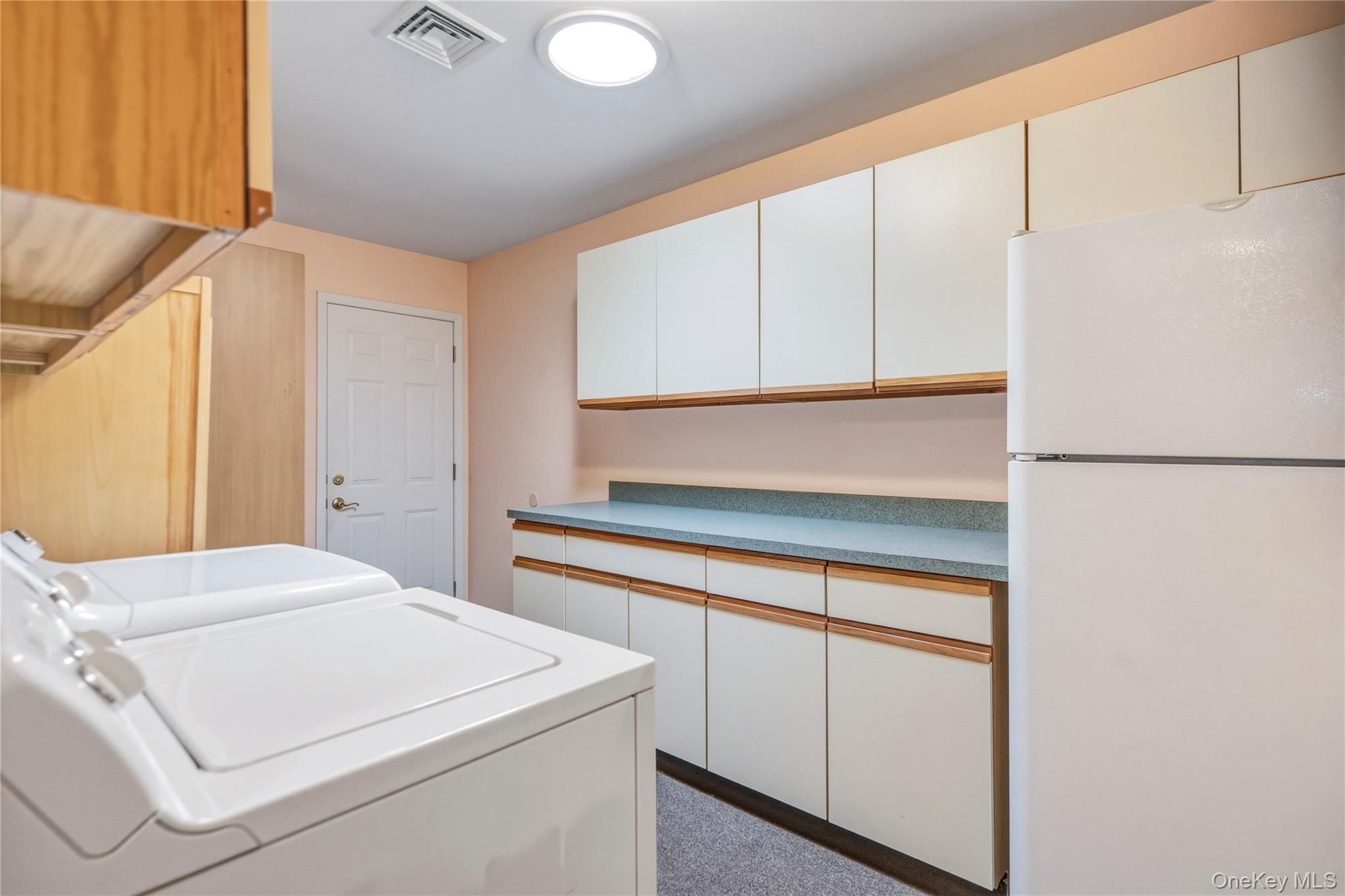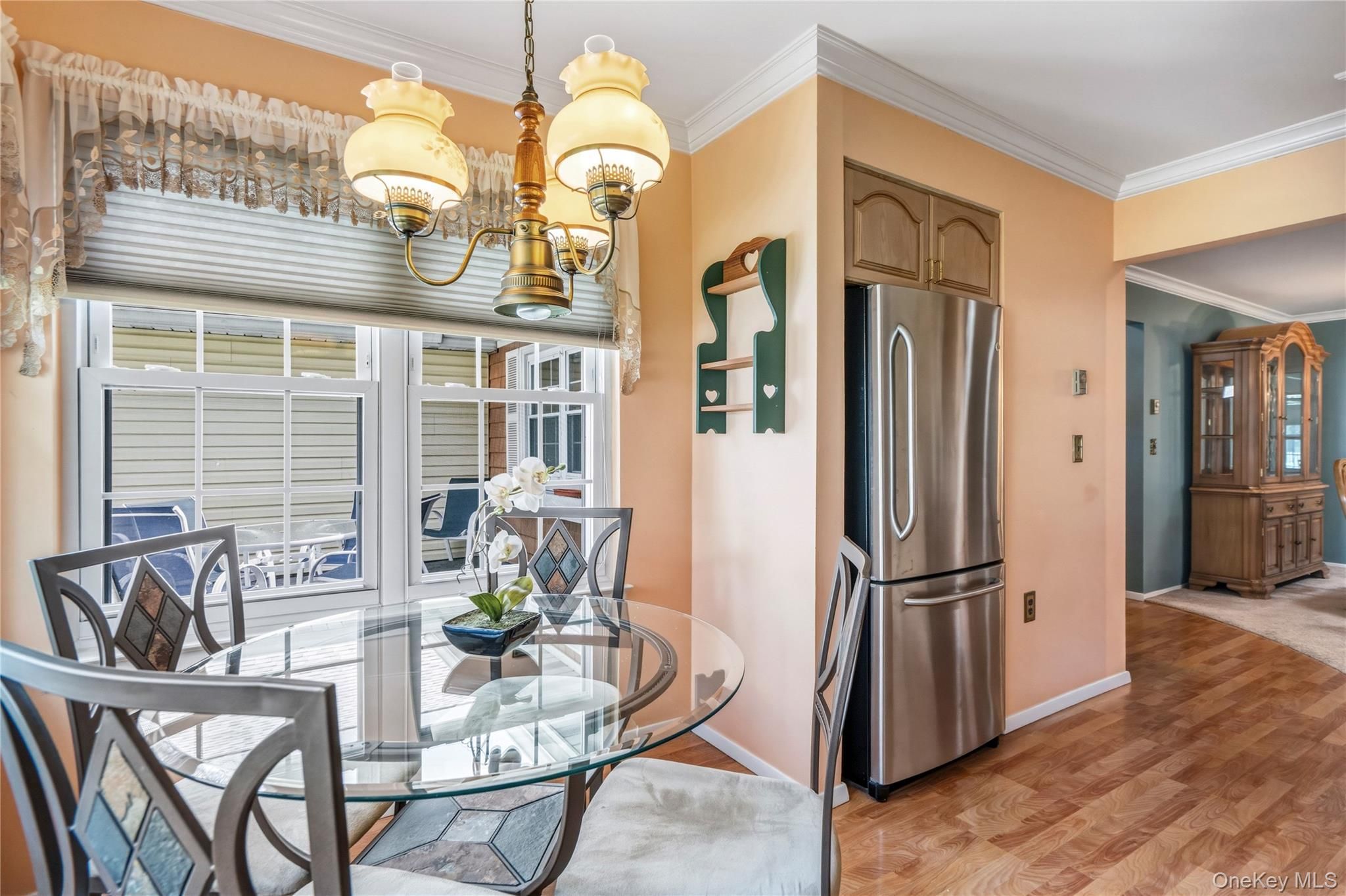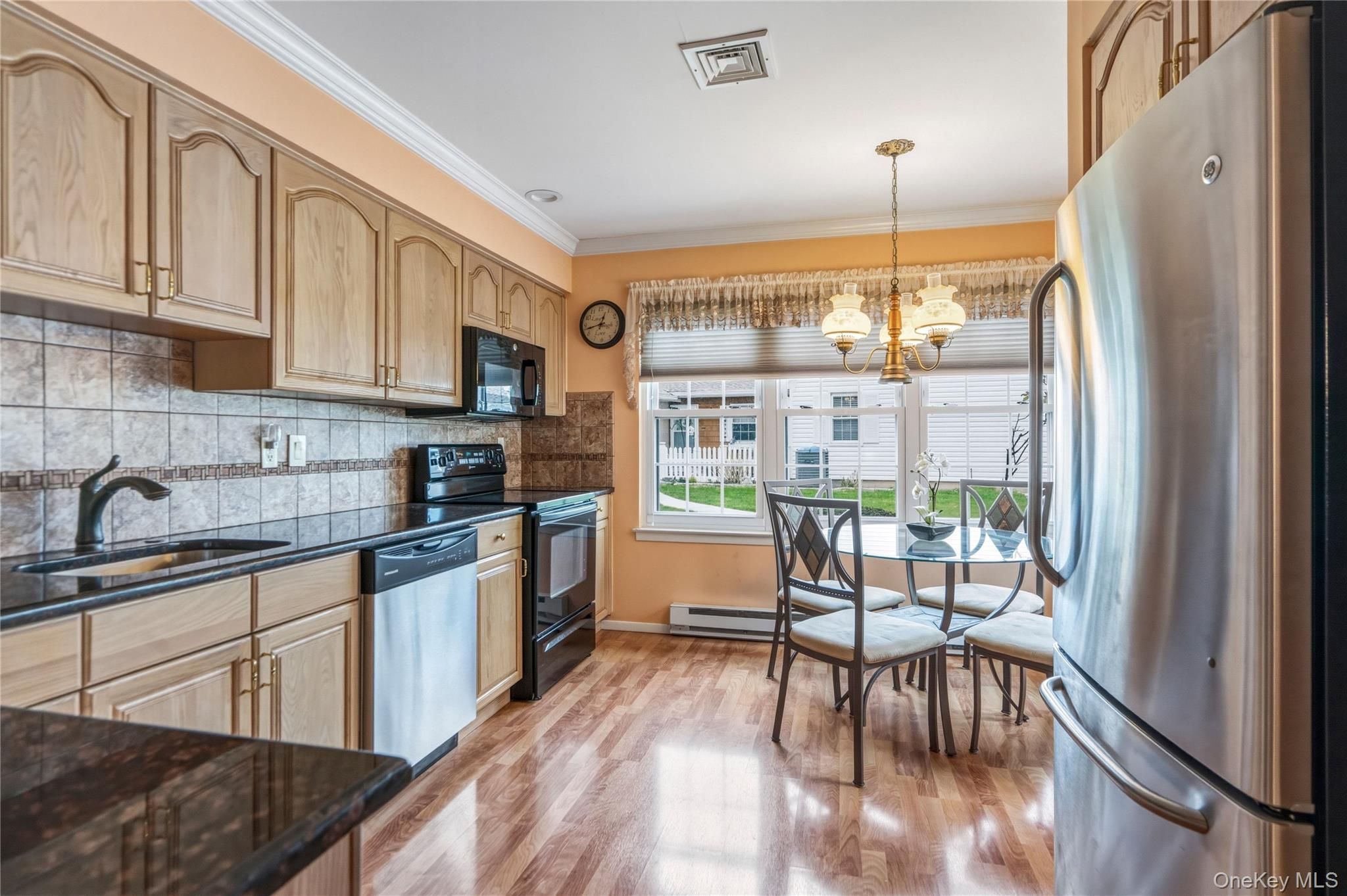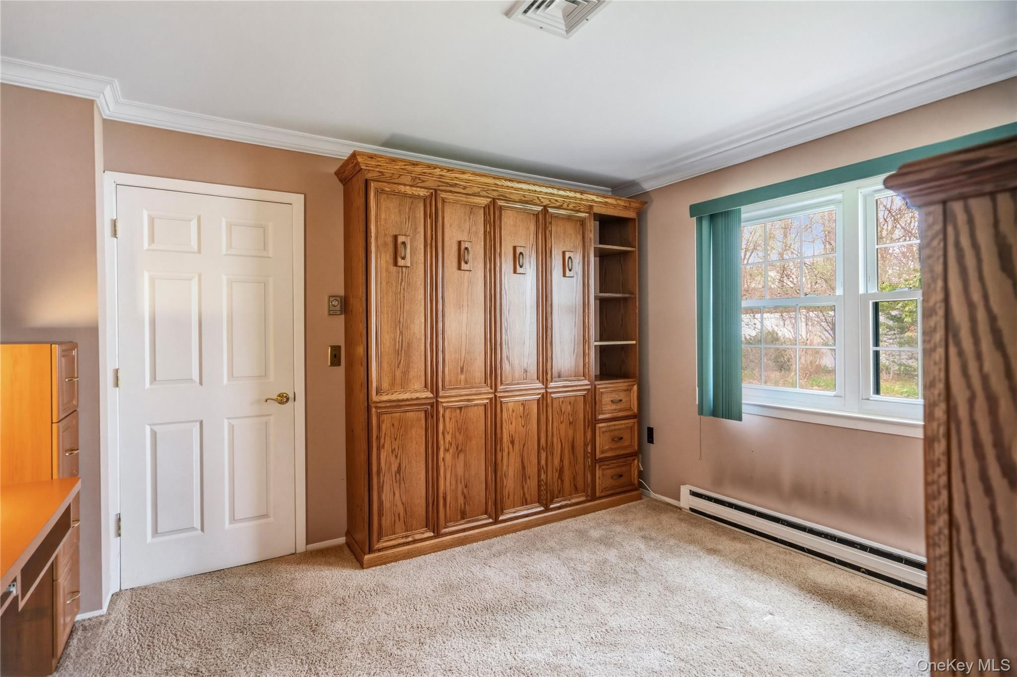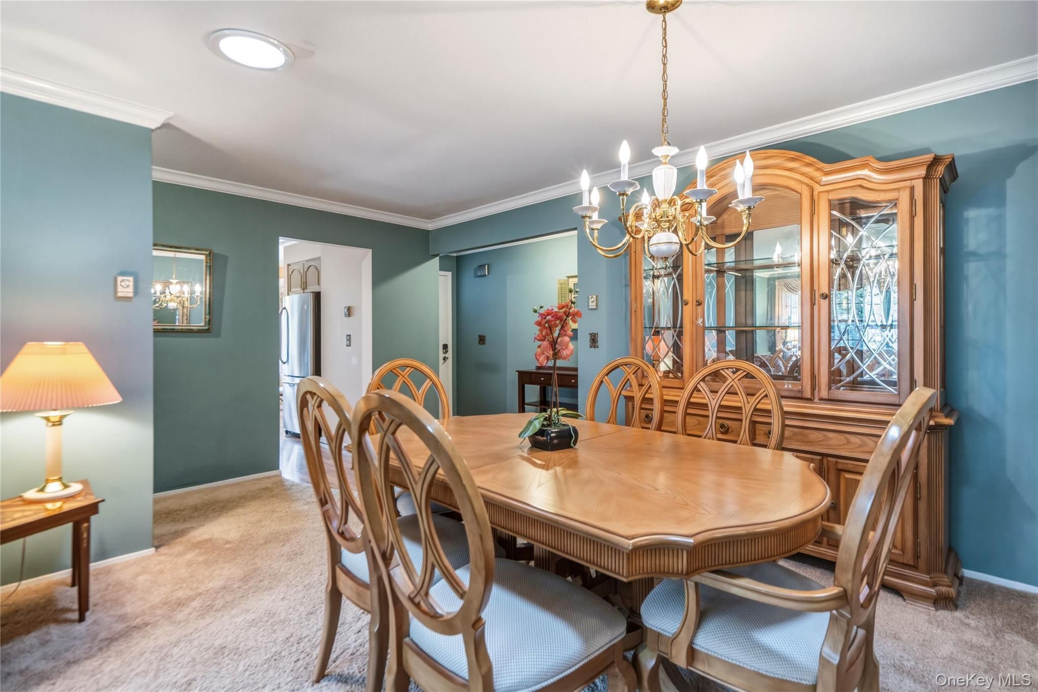 Welcome to 109 Revere Drive, a 2-Bed, 2 Bath, ranch style home in Sayville's desirable SUNRISE VILLAGE...a 55+, Gated Community! This end unit, Dartmouth model, offering approx 1,273 sqft of living space, provides an updated kitchen, dining room, living room, two bedrooms, two full bathrooms, a large laundry/storage room and a 1-car garage with an electric garage door opener and pull down stairs to the attic for additional storage. A paver stone patio with a vinyl fence and gate, welcomes you home to this great unit. The patio is large enough for outdoor dining, entertaining or just relaxing in the outdoors. Enter in off the patio to a long entry foyer with vinyl, wood laminate flooring and a coat closet. Off the foyer is the dining room and living room, both carpeted and featuring crown moldings, two solar tubes and an oversized window for lots of natural light. The laminate flooring & crown moldings continue into the Eat-In Kitchen, which has updated cabinetry and granite counter tops with a tiled backsplash. The kitchen's dining area is cornered between the front & side wall windows for great natural light. Down the carpeted hall from the kitchen is a linen closet and a full bathroom with an updated granite topped vanity and glass sliding doors to the tub/shower. The second bedroom/home office provides a carpeted floor, crown moldings, a double closet, a built-in desk & storage center and a pull down Murphy Bed to provide maximum floor space when the bed is not needed. On the opposite side of the home and off the end of the entry foyer, is the hallway to the primary bedroom and ensuite. This bedroom, which is also carpeted and adorned by the crown moldings, is large enough to accommodate a king sized bed and provides a linen closet, walk-in closet and it's own full bath with a walk-in stalled shower and solar tube for ample lighting in the daytime. In the hallway beyond the primary bedroom is the access to the large laundry room, which is complimented with upper and lower cabinetry with a long counter top directly across from the washer & dryer...perfect for folding & sorting clothes and for additional storage. Off the laundry room is a door to the hallway leading to the 1-car garage with the electric garage door opener and pull down attic stairs. Beyond the garage door is a covered extension for the garbage & recycling pails, and the outdoor parking space for this unit. This great home also provides the comfort of Central Air Conditioning, an Electric Hot Water Heater and eight independent electric thermostats so you can comfortably & economically heat each room as desired. Sunrise Village is a Planned Unit Development (PUD) managed by Fairfield Properties, and there is a one-time $1,000 transfer fee paid to Fairfield by the new owner.