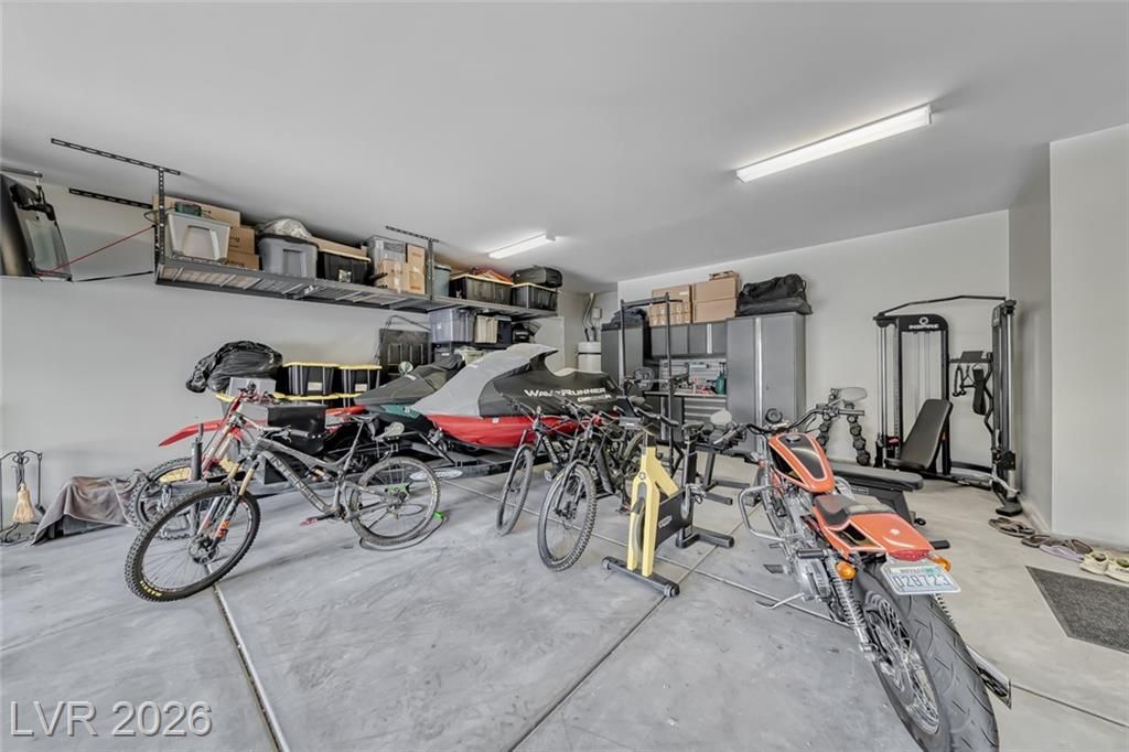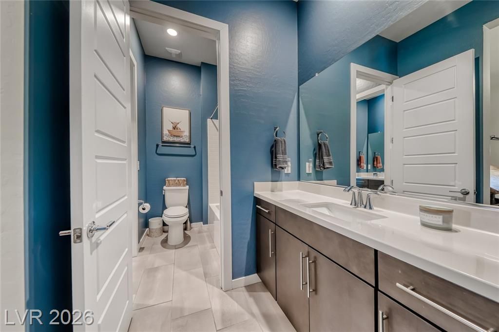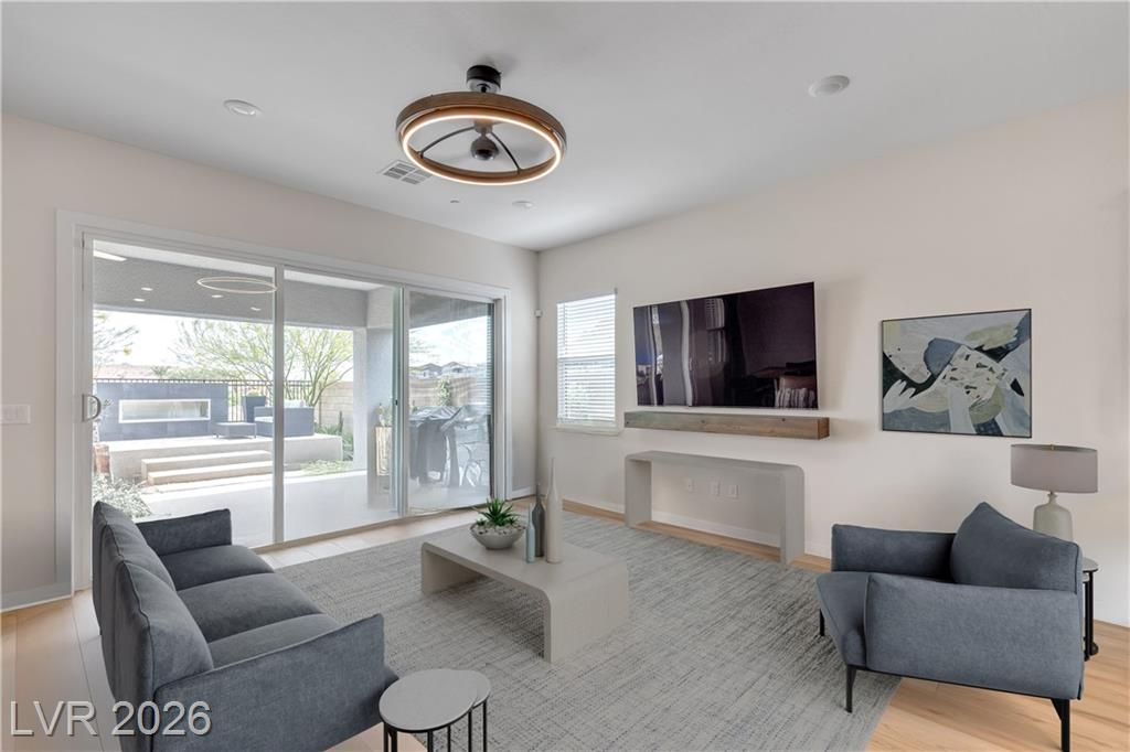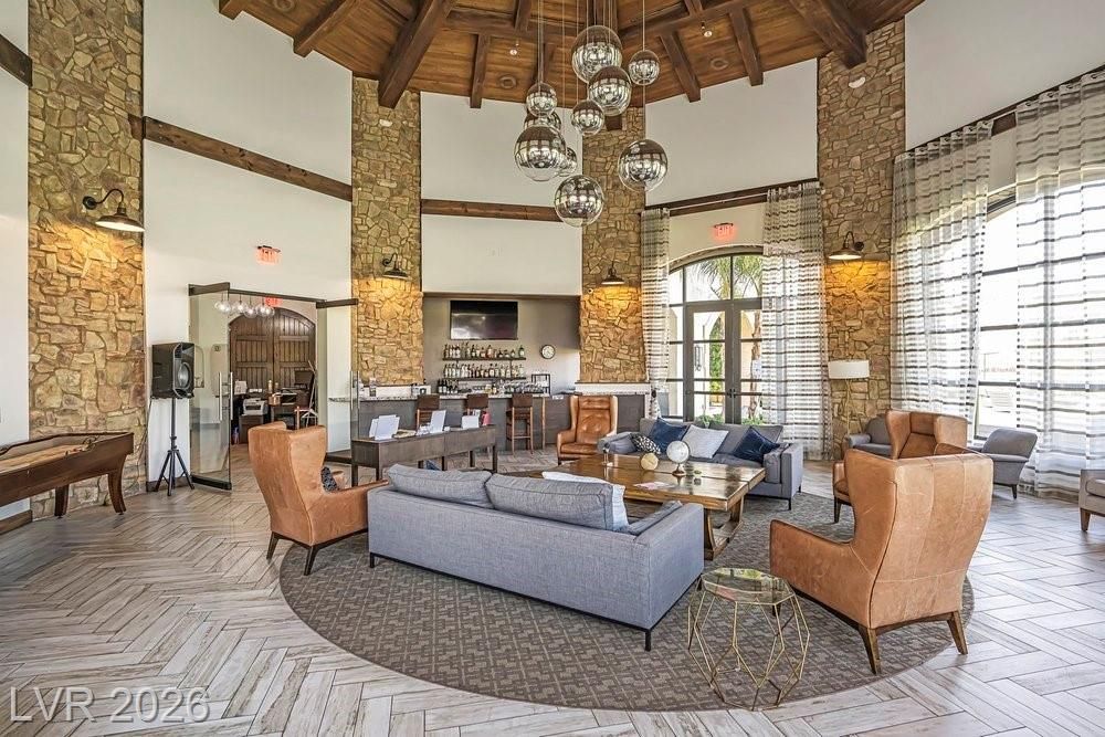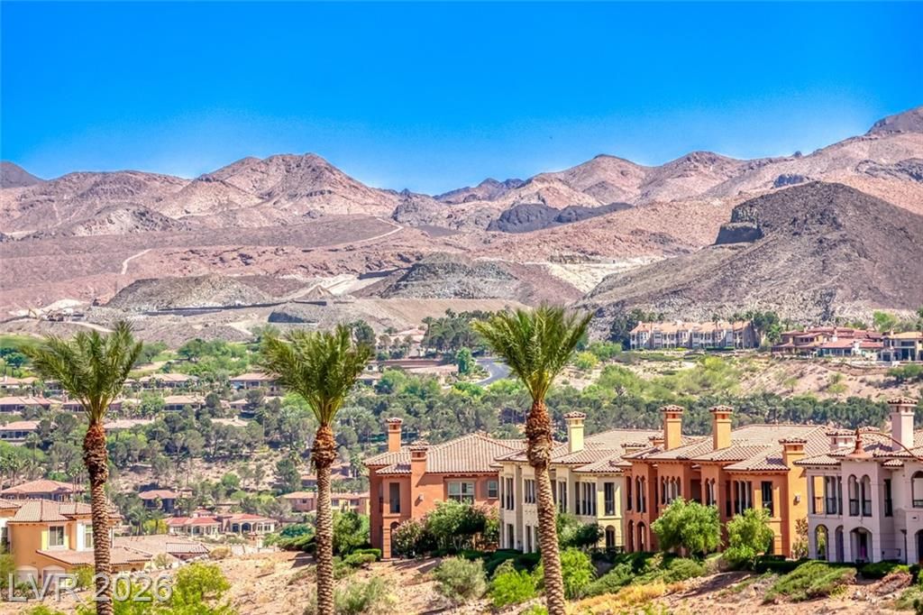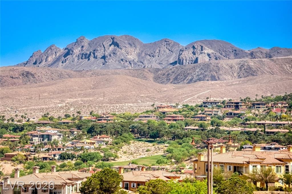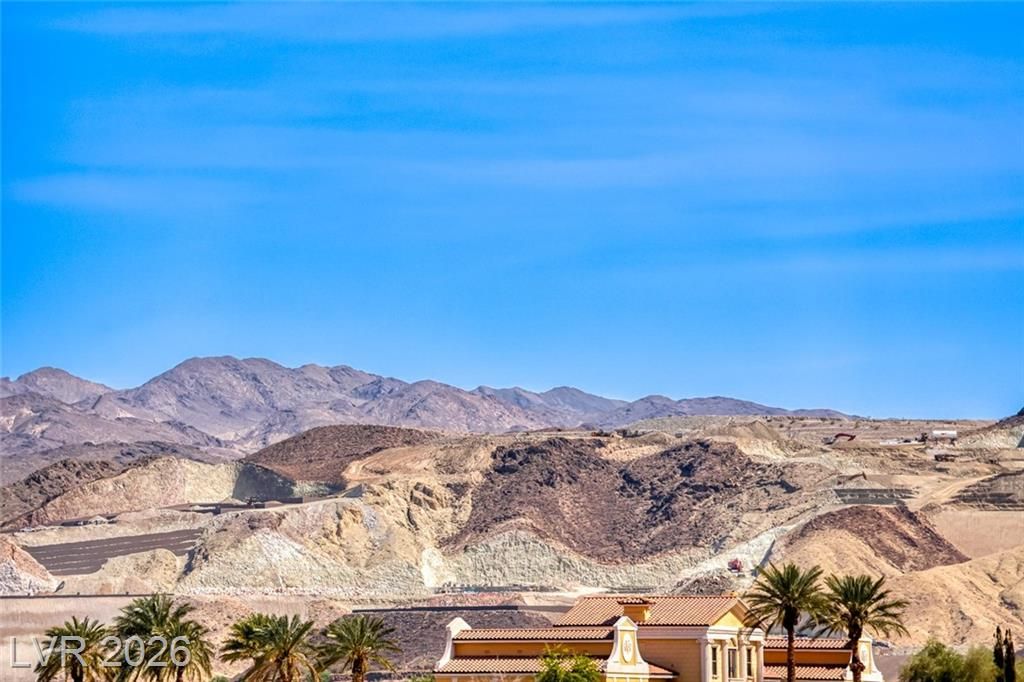 Elevated corner view lot in the gated community of Reverie at Lake LV offers over 2,500sqft of stylish modern living space. This unique 4-bay recreational garage has high ceilings, ideal for parking your toys. The open-concept layout features luxury Beachwood vinyl plank flooring & 10-foot ceilings. A second dining area is large enough for a billiards table. The kitchen inc Cambria Quartz countertops, a huge center island, a custom backsplash & GE stainless steel appliances, featuring a 5-burner convection range & a large walk-in pantry. The great room has 12-foot slider doors that flow seamlessly to a spacious covered patio. An elevated view deck w/ a linear fireplace offers sweeping mountain & village views. The backyard has a tranquil water fountain & a pergola with a Bullfrog spa for eight people. Seller offering to pay on behalf of buyer at COE the Lake Las Vegas Sports Club initiation fee of $25,000 and two years of dues of $5,640, making this an exceptional value for buyers.