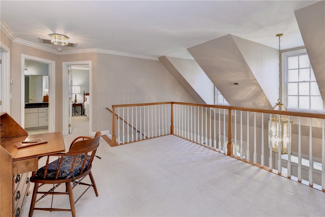 This beautifully maintained Ford’s Colony home delivers 3,445 square feet of well-designed living space and exceptional room sizes. The floor plan offers great flexibility with three bedrooms, 3.5 baths, a spacious loft and a large bonus room. A welcoming two-story foyer leads to a living room or study with built-ins and French doors opening to the family room. The family room features a handsome fireplace with enhanced moldings, hardwood floors, abundant natural light and access to the screened porch. The expansive dining room includes crown and chair rail moldings. The kitchen offers cherry-stained cabinetry, granite, tile backsplash, gas cooking, a center island, walk-in pantry and a bright breakfast area. The first-floor primary suite has new carpet, two walk-in closets, dual vanities and a dressing area. Upstairs are two spacious bedrooms, a loft, a large bonus room and walk-in attic storage. Additional highlights include a first-floor laundry room with utility sink, 2024 HVAC replacement for the first floor, and outdoor living with both a screened porch and deck. Ideally located near walking paths and convenient to a gate.