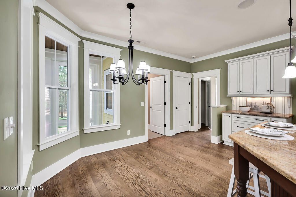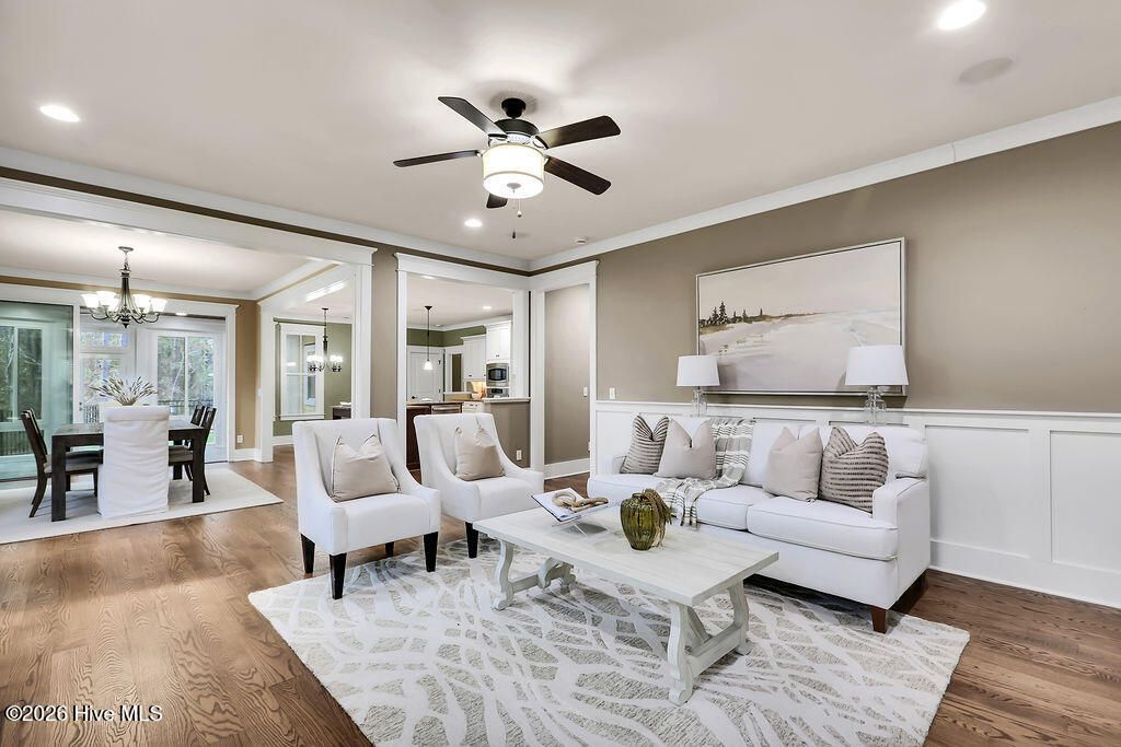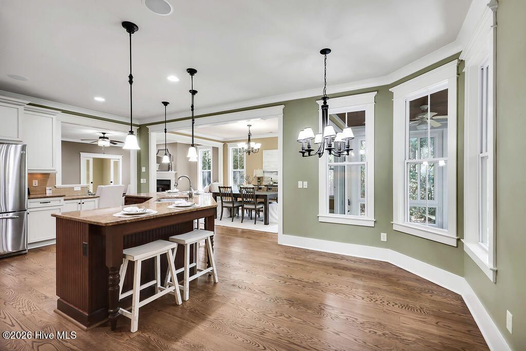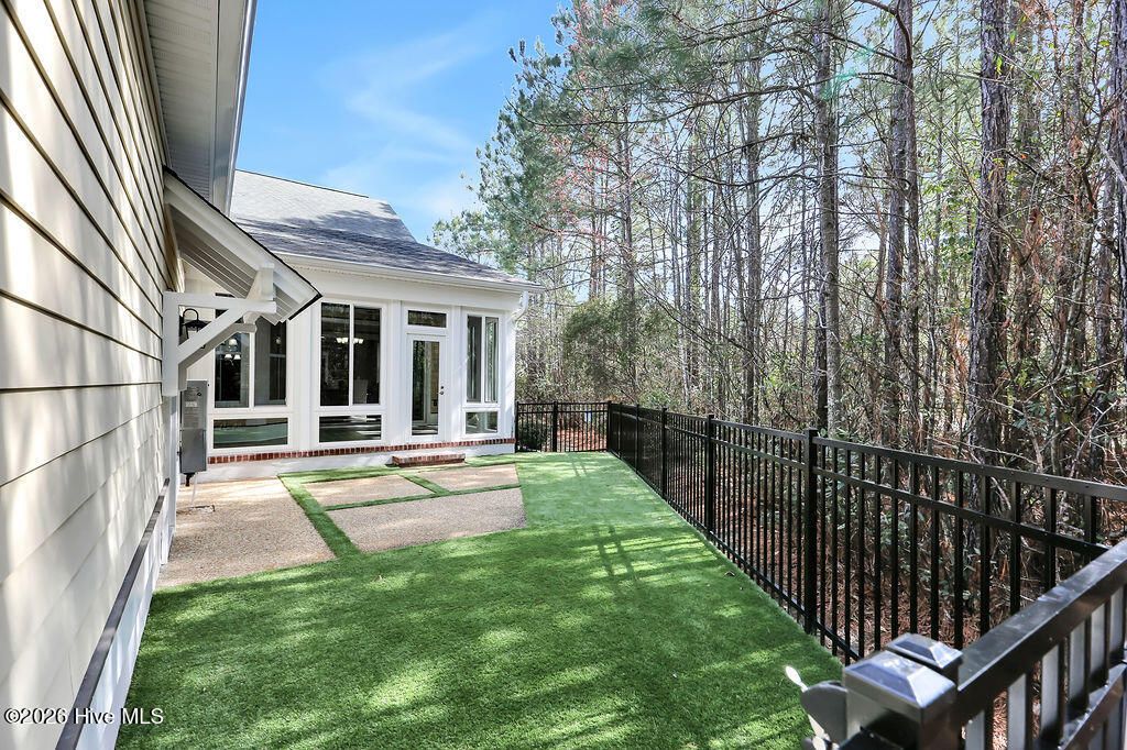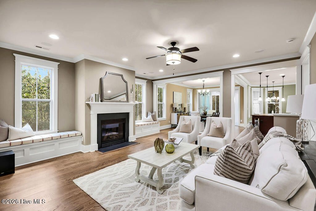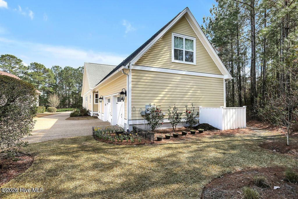 Welcome to this charming home with an inviting, rocking chair-ready front porch, built by PBC Design & Build and located in the desirable Evangeline neighborhood of Brunswick Forest. The home offers 3 bedrooms, 3 full bathrooms, office, and bonus room. The open floor plan allows for an easy flow when entertaining! Focal point of the living room is the natural gas fireplace and window seats with storage. The adjacent dining room has telescoping doors that lead into the glassed-in porch then out to the fenced-in yard with patio and artificial turf. The well-equipped kitchen includes granite countertops, counter height island, off white cabinetry, natural gas range with hood, plenty of cabinet space and a breakfast area. The laundry room, with washer and dryer, is conveniently located off the kitchen. A pocket door allows entry from the kitchen to the drop zone that consists of a walk-in pantry, built-in desk, cabinets, and access door to the driveway. The first floor is comprised of the primary suite, 2nd bedroom, and office. Upstairs is the 3rd bedroom, bonus room, and bathroom with access to the floored attic space. The oversized side-entry garage has two utility doors, shelving, and utility sink. Additional features include whole home surge protector, Rinnai Tankless water heater, independent well for irrigation, hardwood and LVP flooring, Leaf Filter gutters, Craftsman style moldings, and wainscoting. Lawn care is included with the HOA. A one-year 2-10 Buyers Home Warranty is being offered for peace of mind. Features of Brunswick Forest include: 3 outdoor & 1 indoor pool, hot-tub, Fitness & Wellness Center, 2 cardio/weight rooms, tennis/pickleball/basketball courts, Hammock Lake, walking trails, parks, playground, dog park, and meeting rooms. Cape Fear National Golf Course on site; membership required. The Villages of Brunswick Forest is a commercial area with restaurants, shopping, and medical facilities. Only a short ride to downtown Wilmington or area beaches.