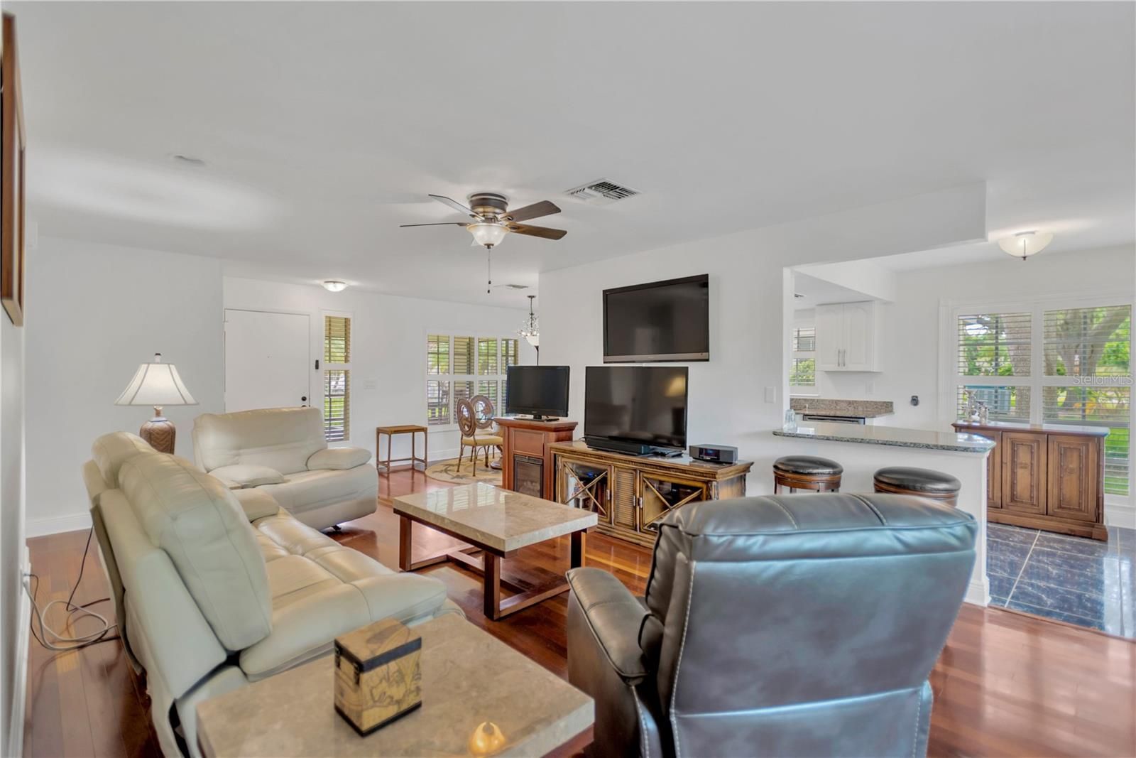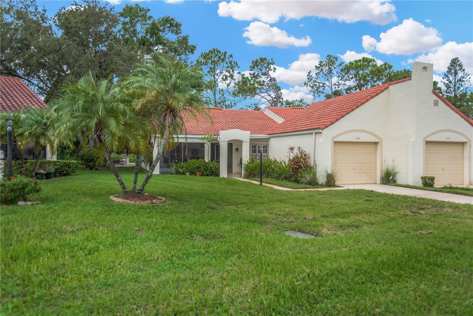 This magnificent 2-bedroom,2-bathroom villa, complete with a 1-car garage, is situated within the highly desirable 55+ community of Highland Lakes. The property features a newer kitchen equipped with stainless steel appliance, an elegantly updated master bathroom boasting a walk-in shower, and a beautifully refreshed guest bathroom with tub. The rear view overlooks the 6th tee, providing breathtaking sunset views. The front covered screened-in lanai offers a tranquil setting for relaxation or socializing with family and friends. Community amenities are plentiful, including three private golf courses, a heated pool and spa, tennis courts, pickleball courts, secure RV parking and boat parking, art studios, and an array of entertainment and social events. The Lake Tarpon Lodge amenities include heated pool, picnic and party facilities, a fishing pier and community pontoon boats. Additionally, it is worth noting that Golf Villas features its own community pool, conveniently located across the street within walking distance. If golfing, swimming and social activities are your passion, and you'd rather not deal with lawn upkeep or flood zone issues, then this is the home for you.