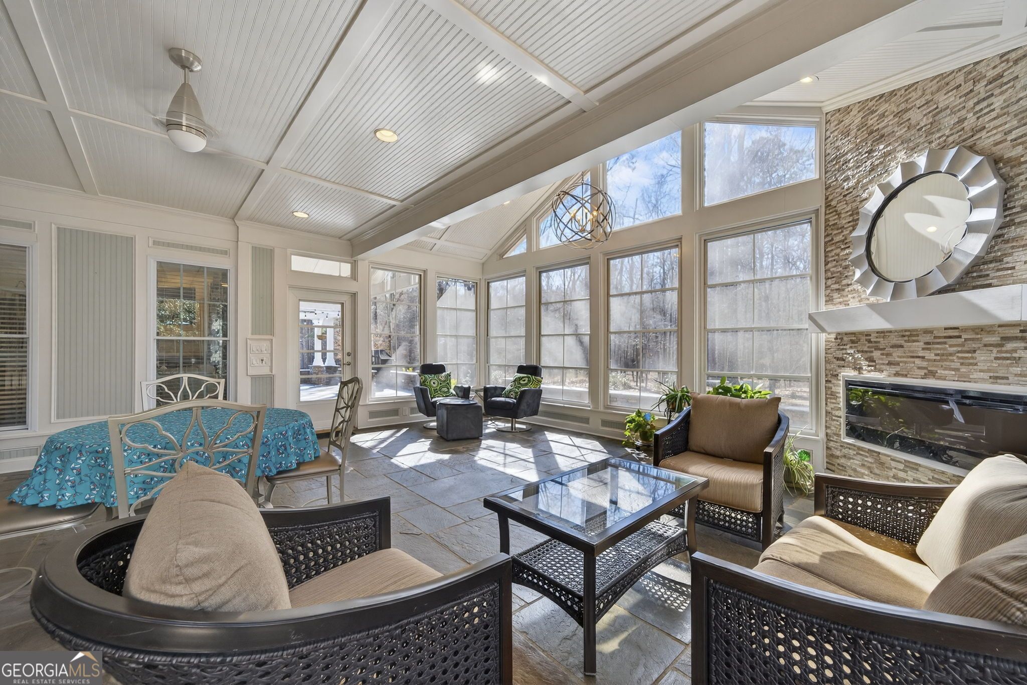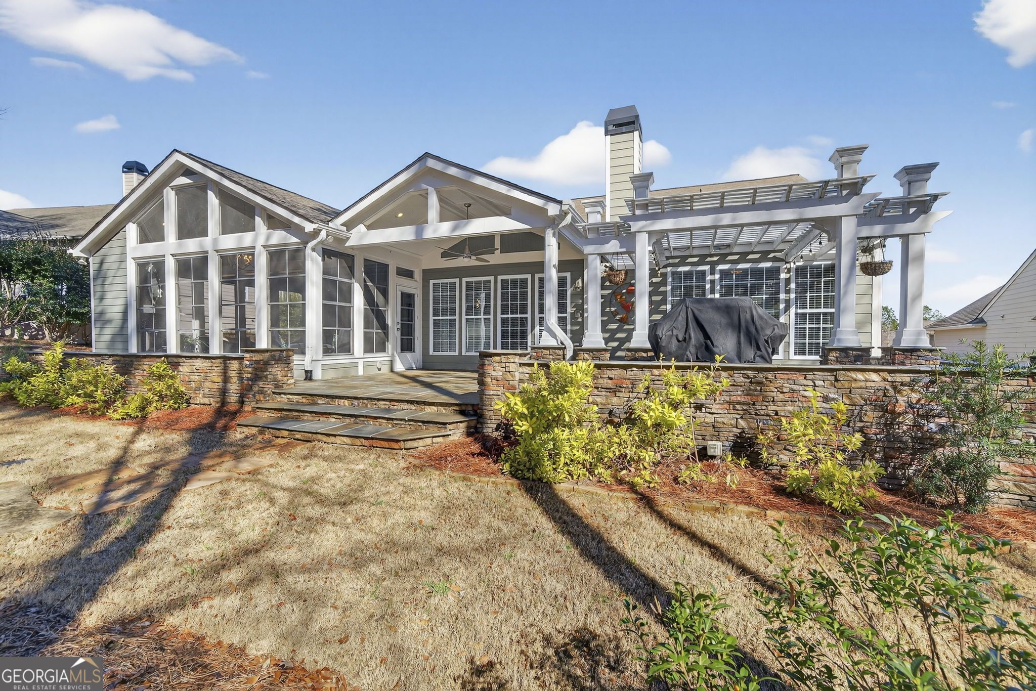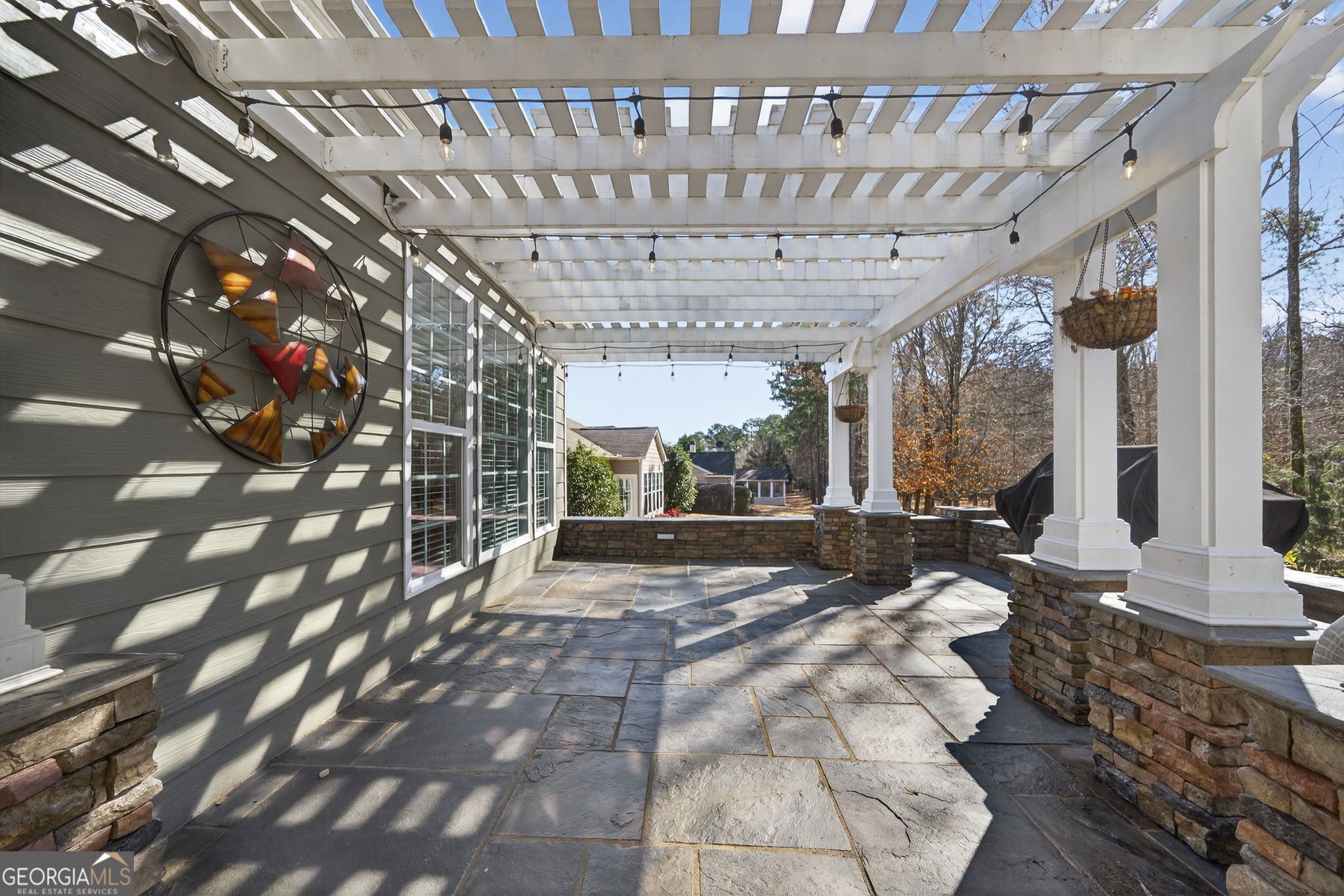 Beautifully updated 3-bedroom, 2.5-bath home with an incredible all-seasons sunroom and expansive outdoor living spaces, located in the highly sought-after Del Webb Lake Oconee community. Backing to peaceful greenspace and within walking distance to the lake and pavilion, this home blends privacy, thoughtful upgrades, and easy access to the resort-style amenities Del Webb is known for. One of the standout features is the impressive 500 sq ft all-seasons sunroom, designed for year-round enjoyment. This inviting space features floor-to-ceiling Eze-Breeze windows, a vaulted ceiling, contemporary lighting, electric fireplace, ceiling fan, mini-split climate control system, custom cabinetry with solid surface counters, and a beautifully coated bluestone floor. Outdoor living continues with an expansive 630 sq ft patio retreat, complete with pergola-covered seating area, a vaulted covered section with ceiling fan and lighting, coated bluestone floors and walls, and steps leading to the backyard-perfect for relaxing or entertaining. Inside, the home features professionally refinished and painted kitchen cabinetry, new high-quality carpet throughout, contemporary energy-efficient lighting, a new hot water heater, and a brand-new HVAC system, offering comfort and peace of mind. Additional improvements include a freshly painted garage with epoxy/polyaspartic coated flooring with mosaic flecking and excellent storage with full stairway access to attic space complete with flooring and lighting. The professionally landscaped yard includes thoughtful stormwater management with backyard catch basins and drainage diversions, along with prepaid landscaping improvements including topdressing, overseeding, organic fertilizing, and tree thinning. With upgraded finishes, generous indoor and outdoor living spaces, and close proximity to the lake and pavilion, this home offers a wonderful opportunity to enjoy the Del Webb Lake Oconee active adult lifestyle and amenities.