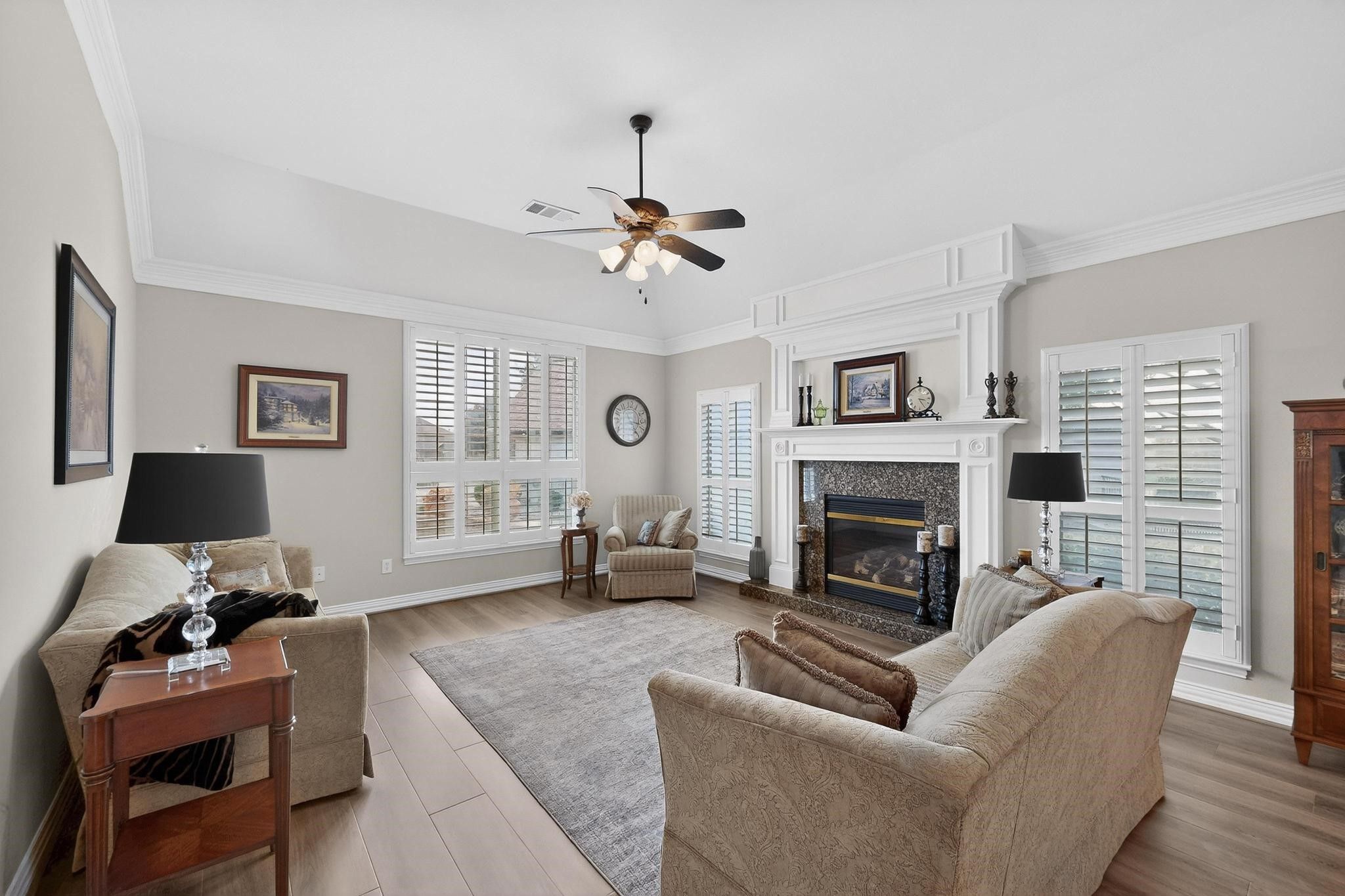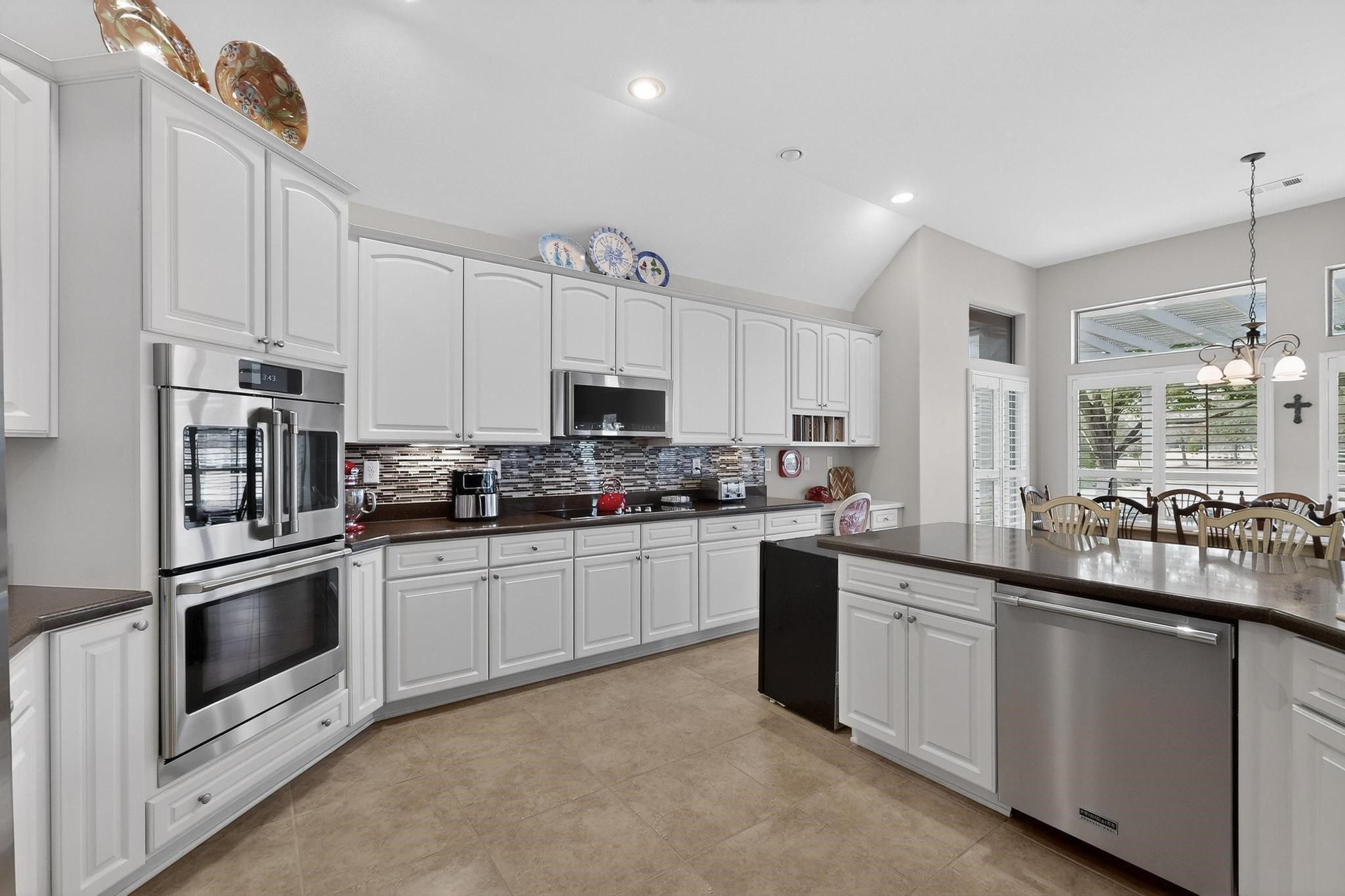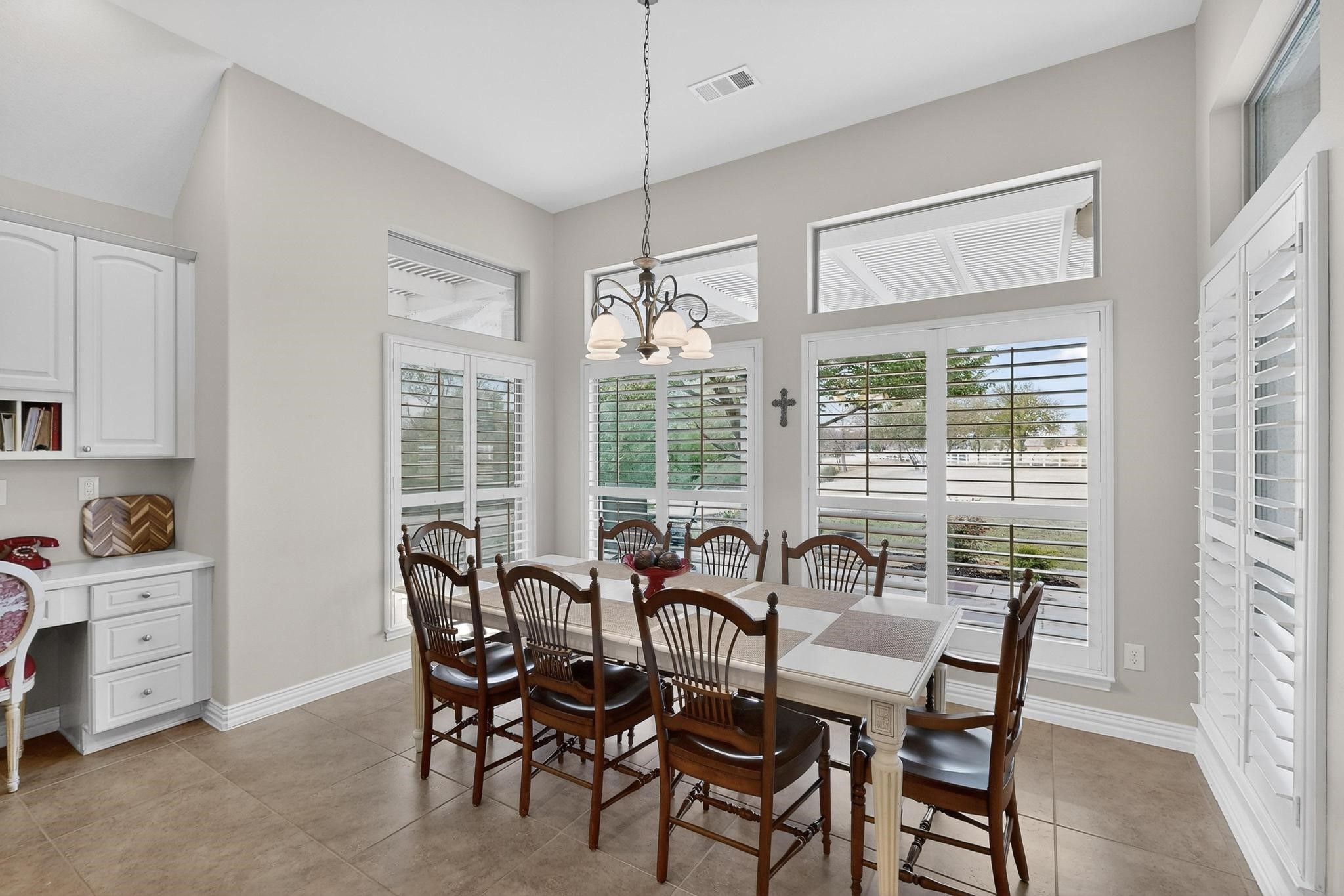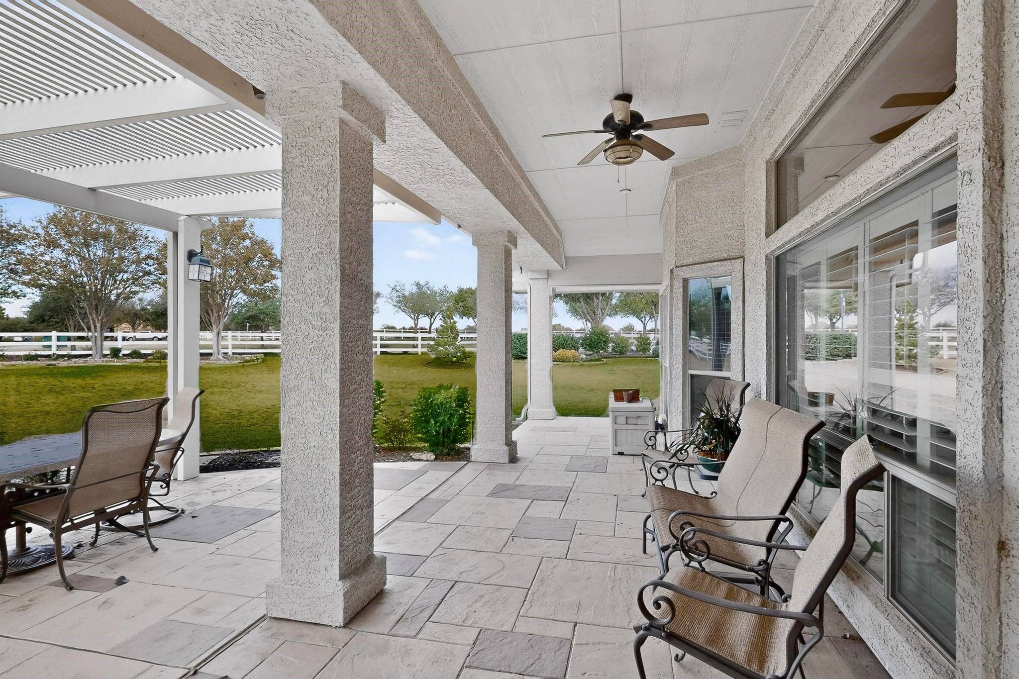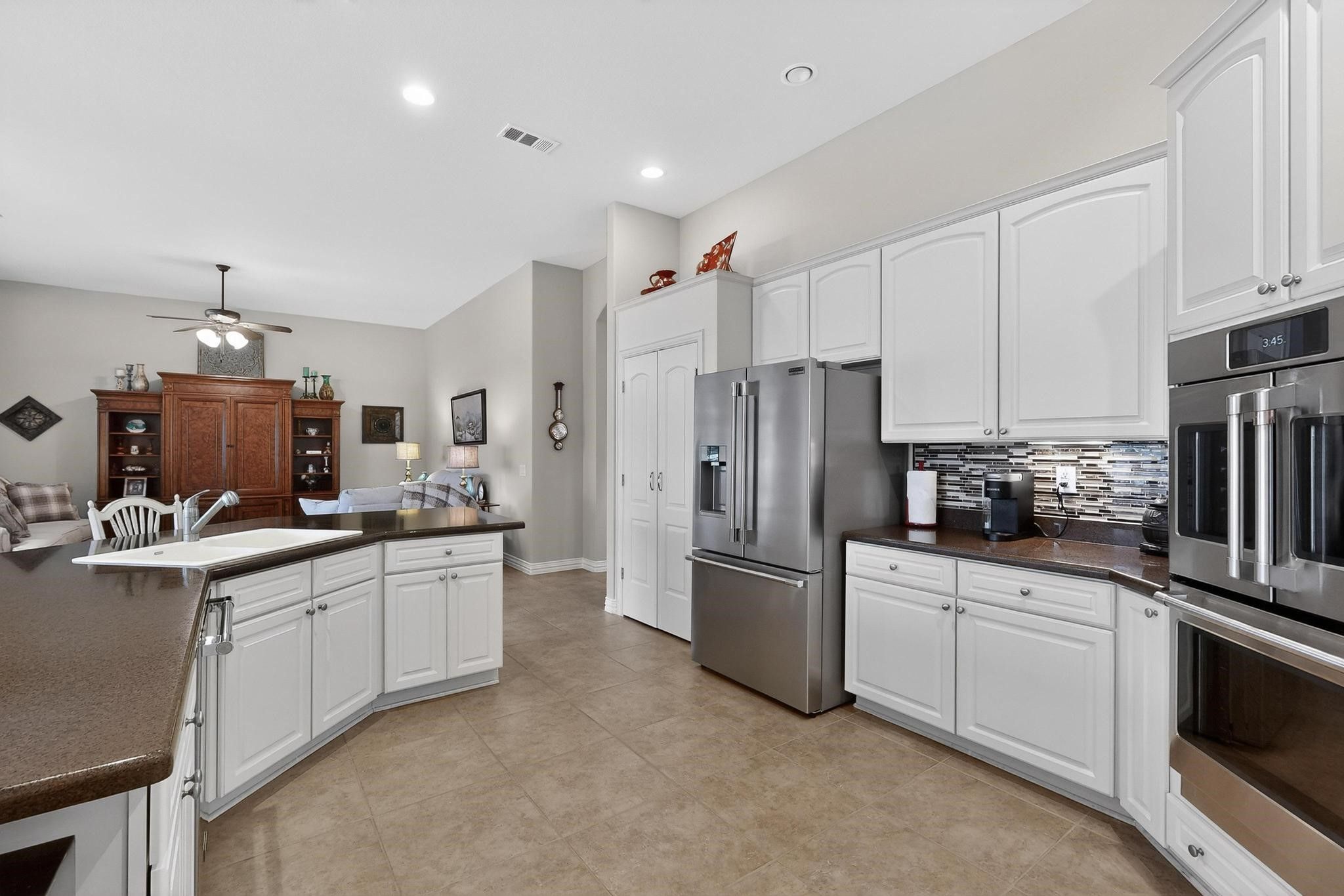 $50K Price reduction. Don't let this home pass you by. There is plenty of space in the refreshed 2-story, 3-bedroom Marbella home. Three full-car garage with storage cabinets. The back patio has been extended and has a stamped concrete floor, a pergola, and two fans. It abuts a wide greenbelt. This home is full of natural light. Enter the front foyer, with high ceilings and 3 statement chandeliers. The LVP flooring was installed in June 2025. The interior was painted in July 2025. Plantation shutters throughout most of the home. The formal living room has a gas fireplace, fan, and crown molding. It is open to the dining room, which will fit a large table and chairs. Perfect for holiday entertaining. The kitchen is spacious with lots of cabinet space and a secretary desk. The island will seat many guests for casual conversations. New appliances in June 2025. The double Café ovens will make cooking a dream. There is a tiled backsplash. The breakfast room has been extended for easy seating. The kitchen is open to the family room, both rooms have transom windows for extra light. The primary bedroom has a bay window, double tray ceiling, and a fan. The bath has a soaking tub, separate shower, double sinks, makeup vanity seating, medicine chests, and a large walk-in closet. The office has a fan. There are two spacious bedrooms on the second floor with large closets and fans. There is also a full bathroom. The laundry room has upper and lower cabinets and a sink. The attic is floored. This home shows beautifully.