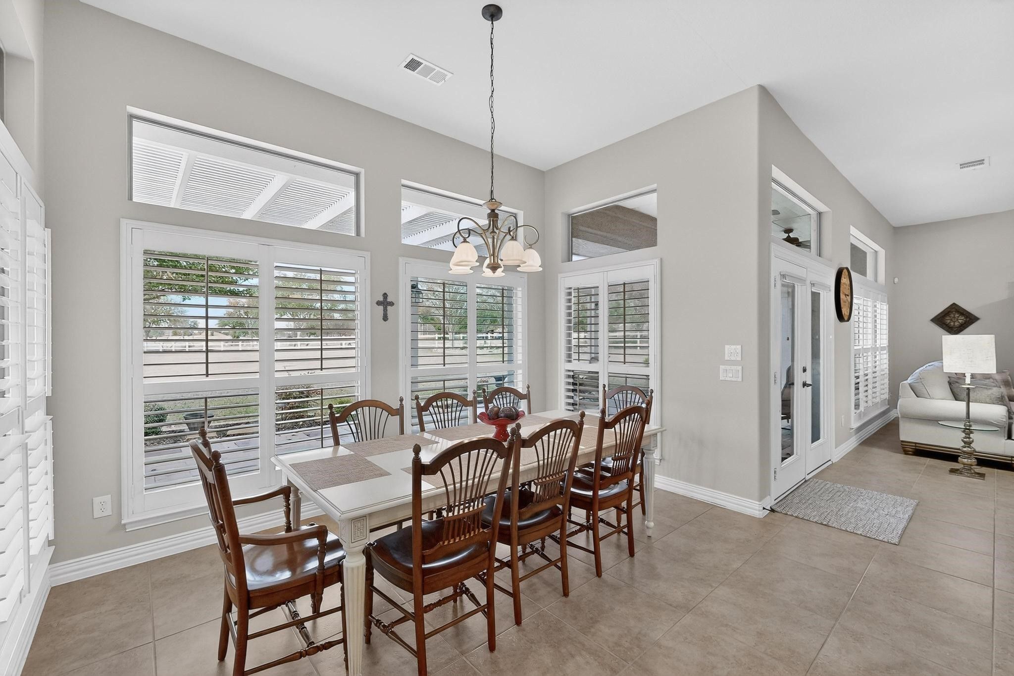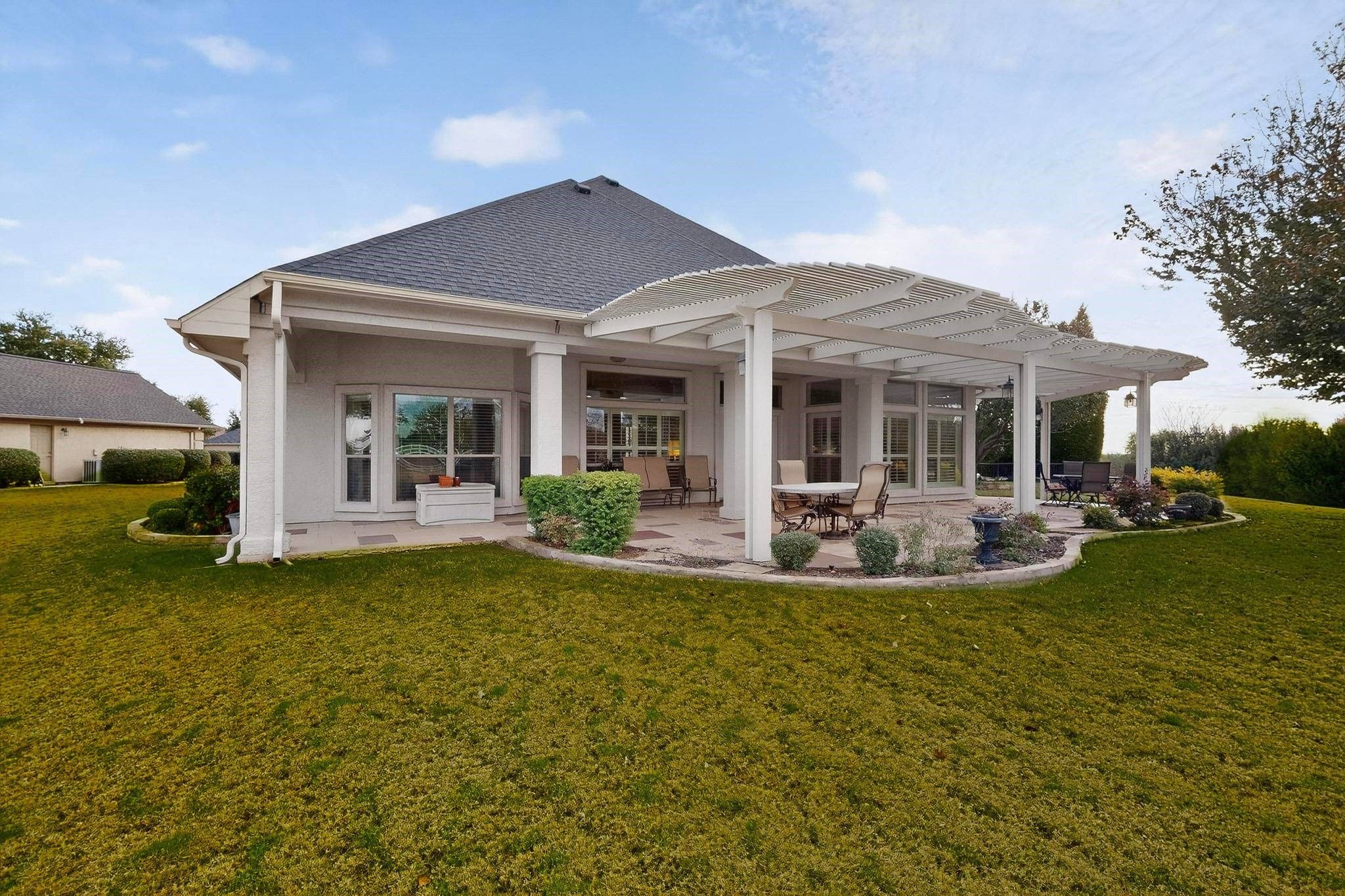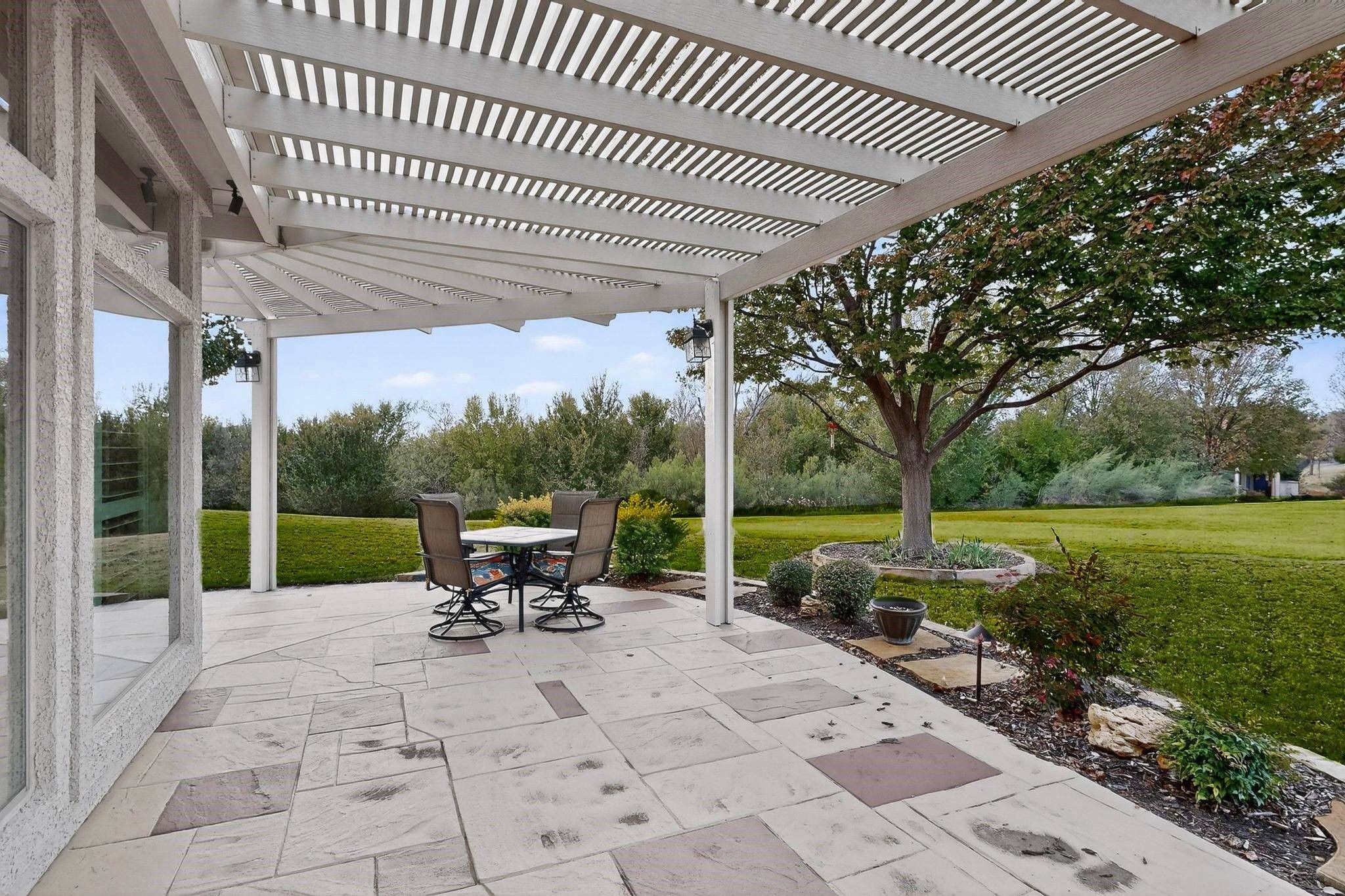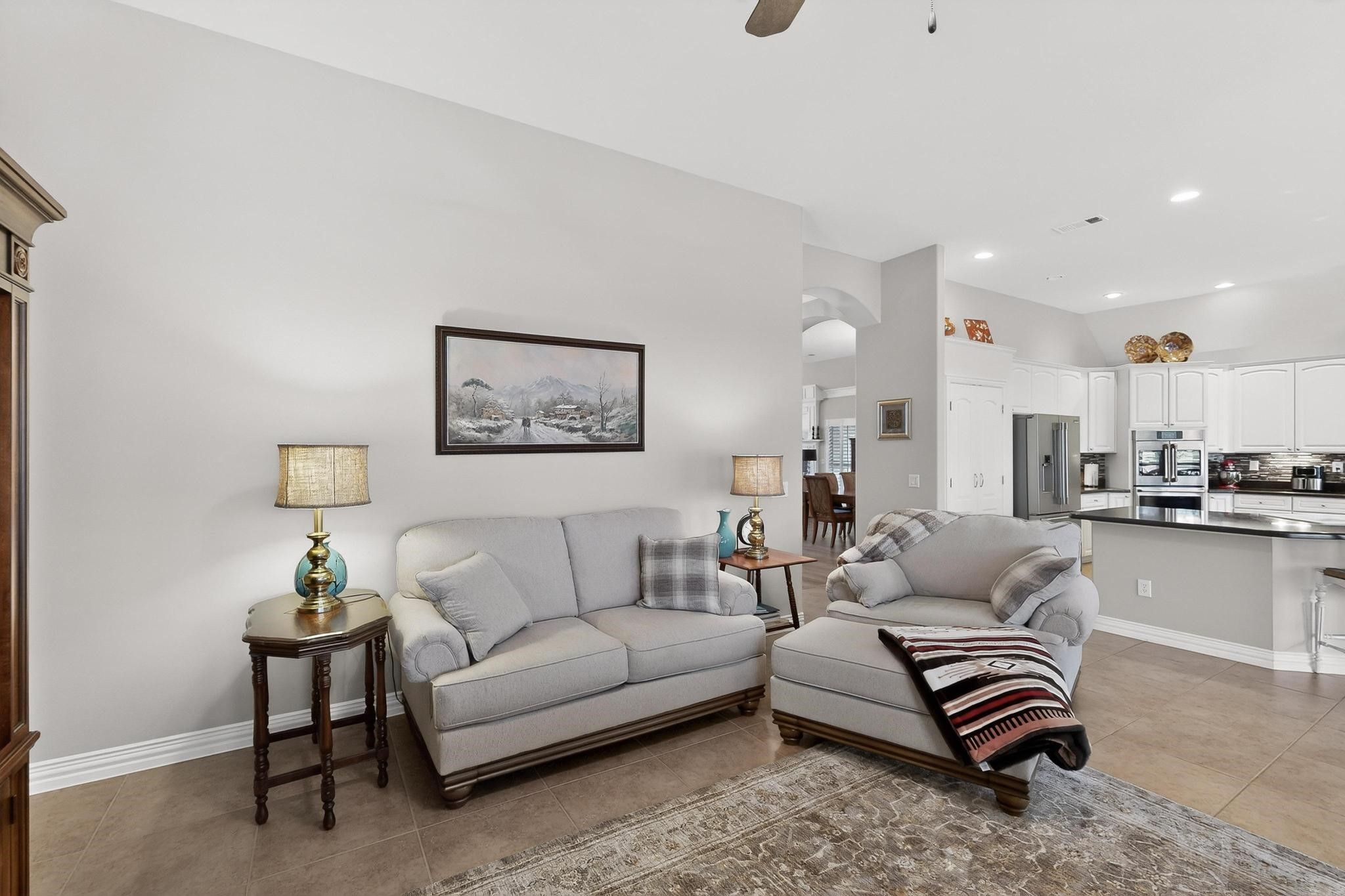 $50K Price reduction. Don't let this home pass you by. There is plenty of space in the refreshed 2-story, 3-bedroom Marbella home. Three full-car garage with storage cabinets. The back patio has been extended and has a stamped concrete floor, a pergola, and two fans. It abuts a wide greenbelt. This home is full of natural light. Enter the front foyer, with high ceilings and 3 statement chandeliers. The LVP flooring was installed in June 2025. The interior was painted in July 2025. Plantation shutters throughout most of the home. The formal living room has a gas fireplace, fan, and crown molding. It is open to the dining room, which will fit a large table and chairs. Perfect for holiday entertaining. The kitchen is spacious with lots of cabinet space and a secretary desk. The island will seat many guests for casual conversations. New appliances in June 2025. The double Café ovens will make cooking a dream. There is a tiled backsplash. The breakfast room has been extended for easy seating. The kitchen is open to the family room, both rooms have transom windows for extra light. The primary bedroom has a bay window, double tray ceiling, and a fan. The bath has a soaking tub, separate shower, double sinks, makeup vanity seating, medicine chests, and a large walk-in closet. The office has a fan. There are two spacious bedrooms on the second floor with large closets and fans. There is also a full bathroom. The laundry room has upper and lower cabinets and a sink. The attic is floored. This home shows beautifully.