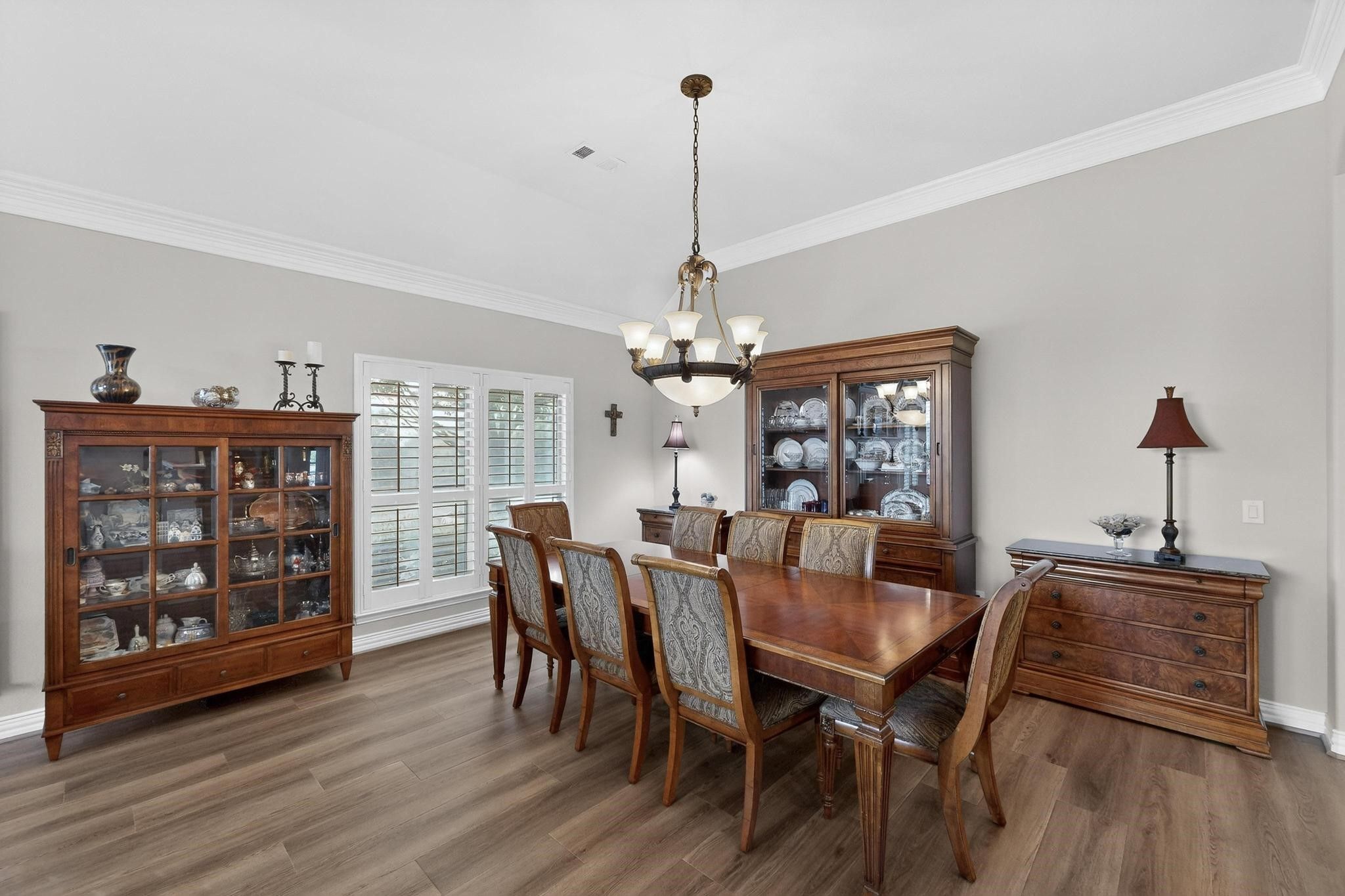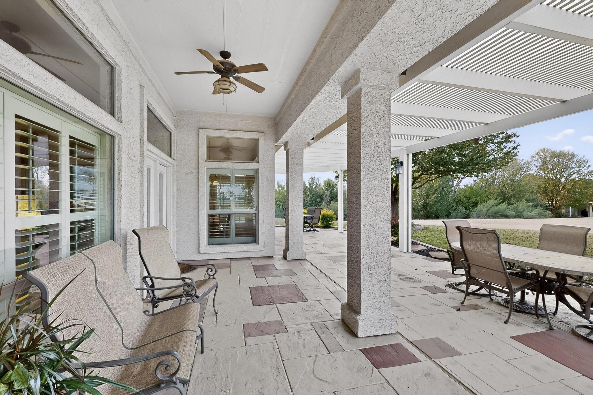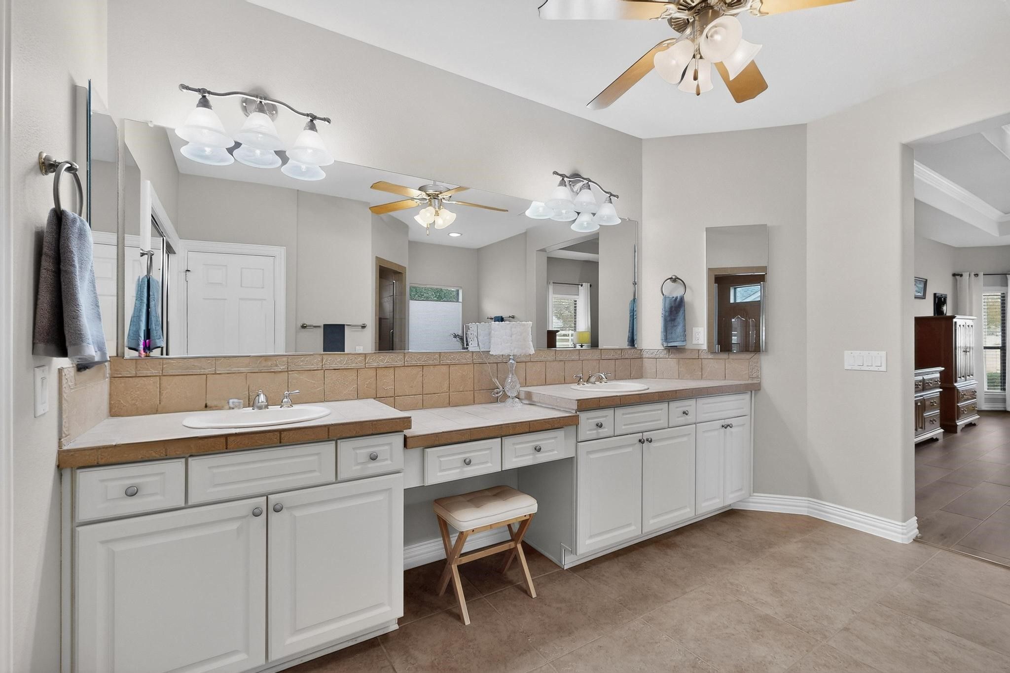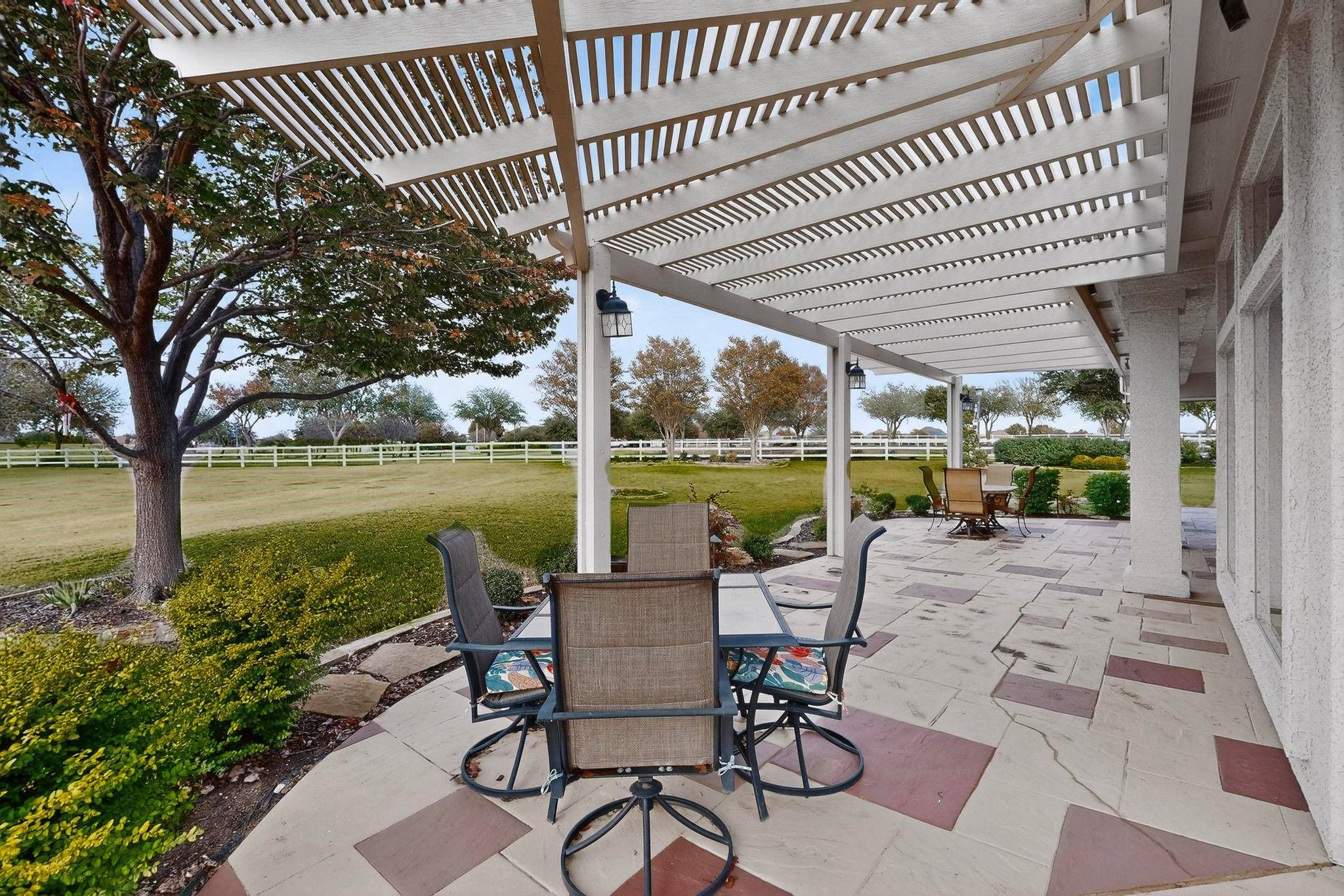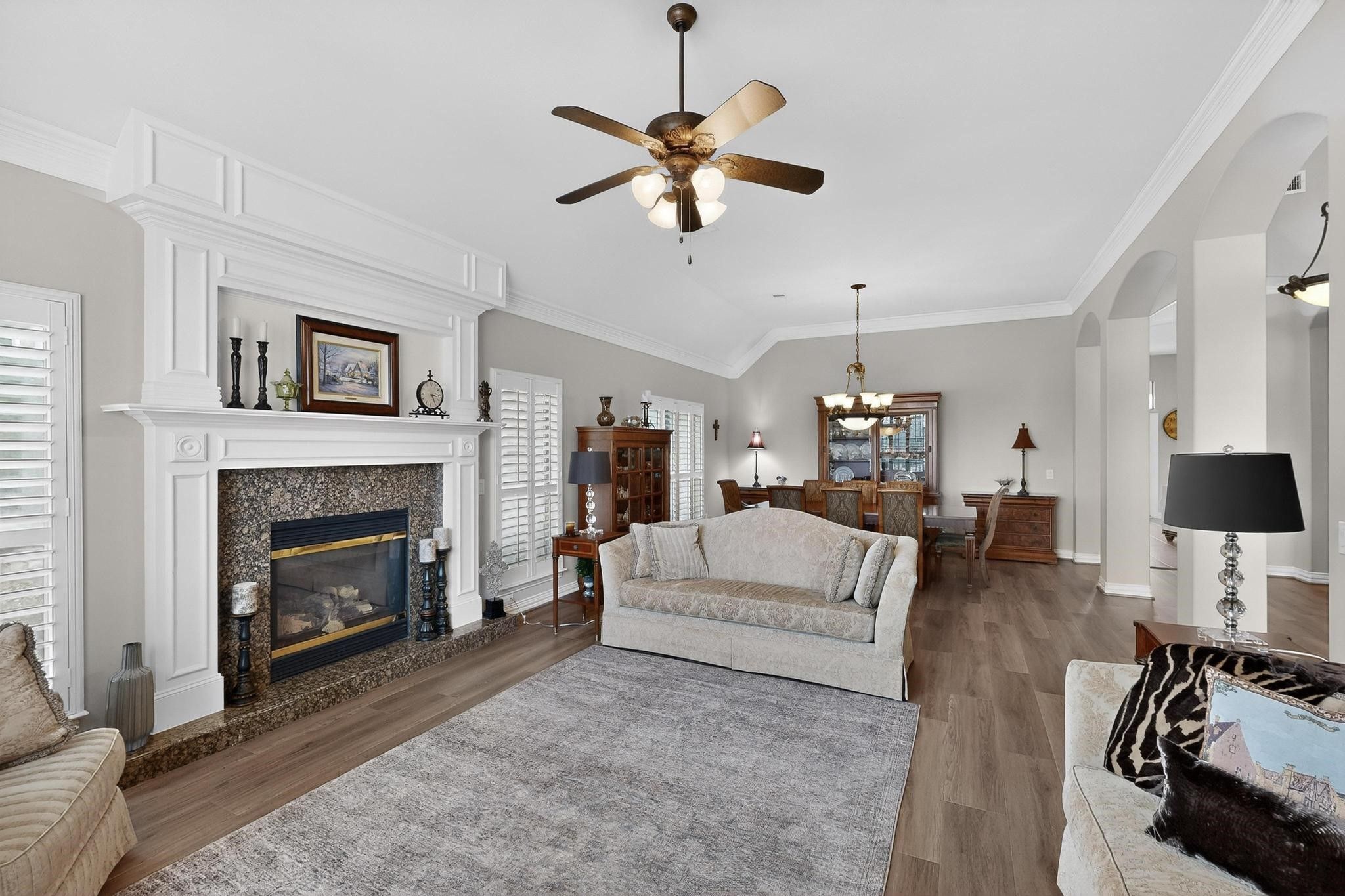 $50K Price reduction. Don't let this home pass you by. There is plenty of space in the refreshed 2-story, 3-bedroom Marbella home. Three full-car garage with storage cabinets. The back patio has been extended and has a stamped concrete floor, a pergola, and two fans. It abuts a wide greenbelt. This home is full of natural light. Enter the front foyer, with high ceilings and 3 statement chandeliers. The LVP flooring was installed in June 2025. The interior was painted in July 2025. Plantation shutters throughout most of the home. The formal living room has a gas fireplace, fan, and crown molding. It is open to the dining room, which will fit a large table and chairs. Perfect for holiday entertaining. The kitchen is spacious with lots of cabinet space and a secretary desk. The island will seat many guests for casual conversations. New appliances in June 2025. The double Café ovens will make cooking a dream. There is a tiled backsplash. The breakfast room has been extended for easy seating. The kitchen is open to the family room, both rooms have transom windows for extra light. The primary bedroom has a bay window, double tray ceiling, and a fan. The bath has a soaking tub, separate shower, double sinks, makeup vanity seating, medicine chests, and a large walk-in closet. The office has a fan. There are two spacious bedrooms on the second floor with large closets and fans. There is also a full bathroom. The laundry room has upper and lower cabinets and a sink. The attic is floored. This home shows beautifully.