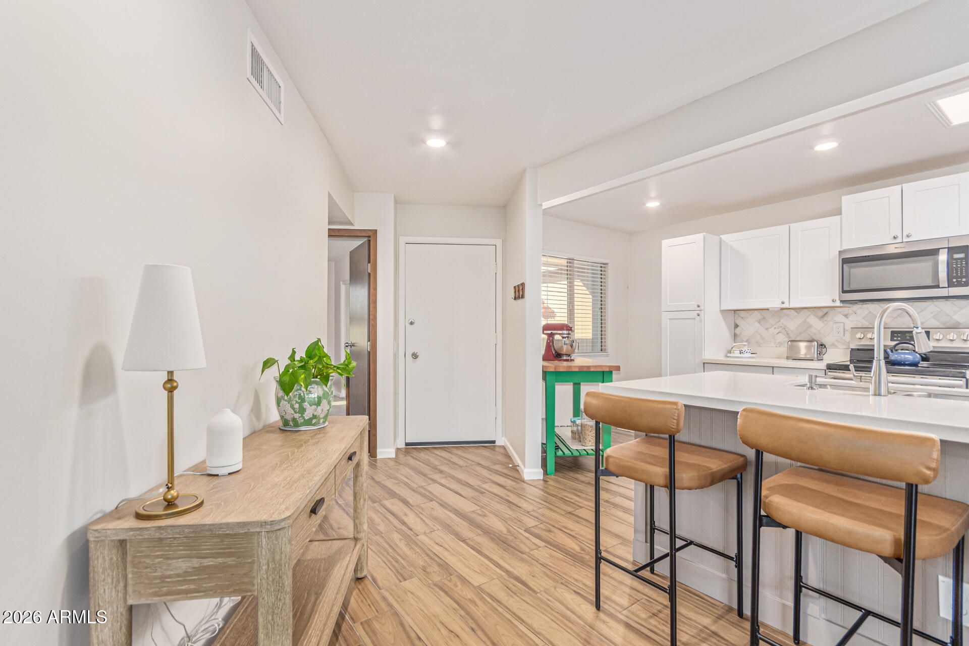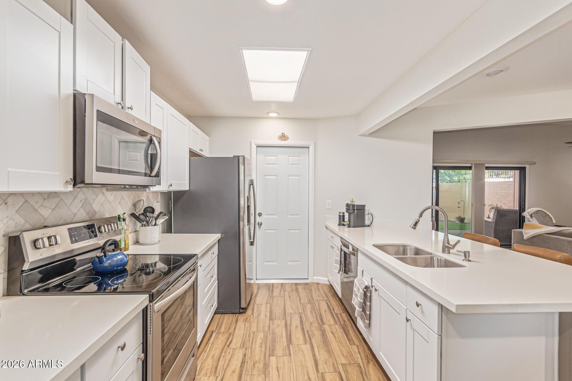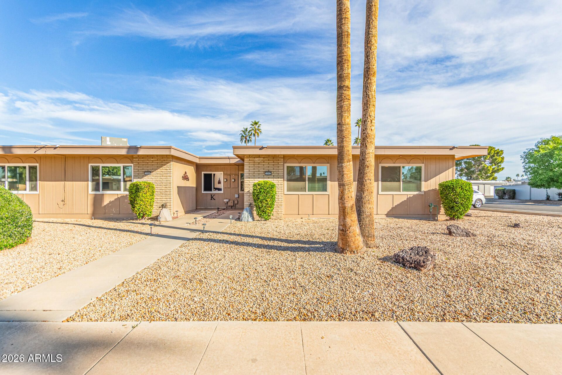 Welcome to this beautifully updated single-level end-unit townhouse in the desirable adult community of Sun City, offering added privacy with neighbors on only one side. This move-in-ready home features two spacious bedrooms, 1.75 baths, and a bright, open living area ideal for everyday living or entertaining. Wood-look tile flooring accents the main living spaces, with cozy carpeting in the bedrooms. The updated kitchen showcases quartz countertops, stainless steel appliances, and contemporary cabinetry with ample storage. Enjoy a private, low-maintenance patio with pavers and turf, plus an attached one-car garage with built-in cabinets.