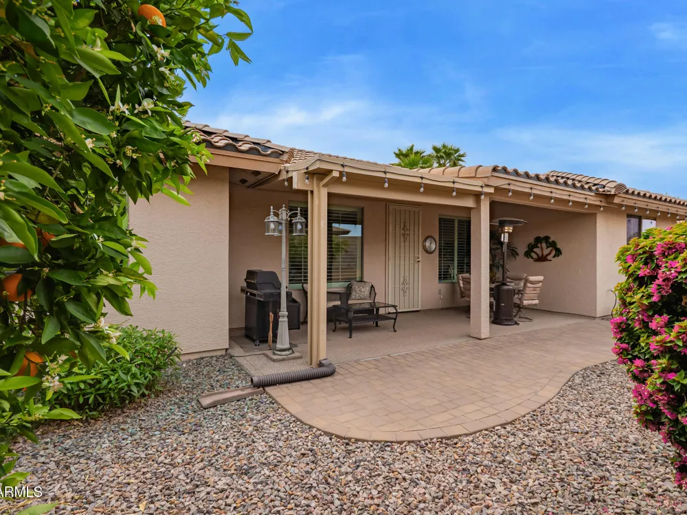 Ready to live in a sought-after 55+ Community? This beautiful fully furnished 2-bedroom + DEN w/2c+golf cart garage home is for you! Immaculate interior boasting plantation shutters, tile flooring in all wet areas, open common areas, and a double-door den ideal for an office space. The eat-in kitchen has a center island, recessed lighting, a breakfast bar, wood cabinets w/crown moulding, granite counters, a large walk-in pantry, and black built-in appliances. Oversized main bedroom offers two walk-in closets for added ease and a lavish bathroom with two vanities and a glass block walk in shower. Private and peaceful backyard features a covered patio, lovely pavers, fragrant citrus trees, and colorful desert plantings. Make it yours NOW!!