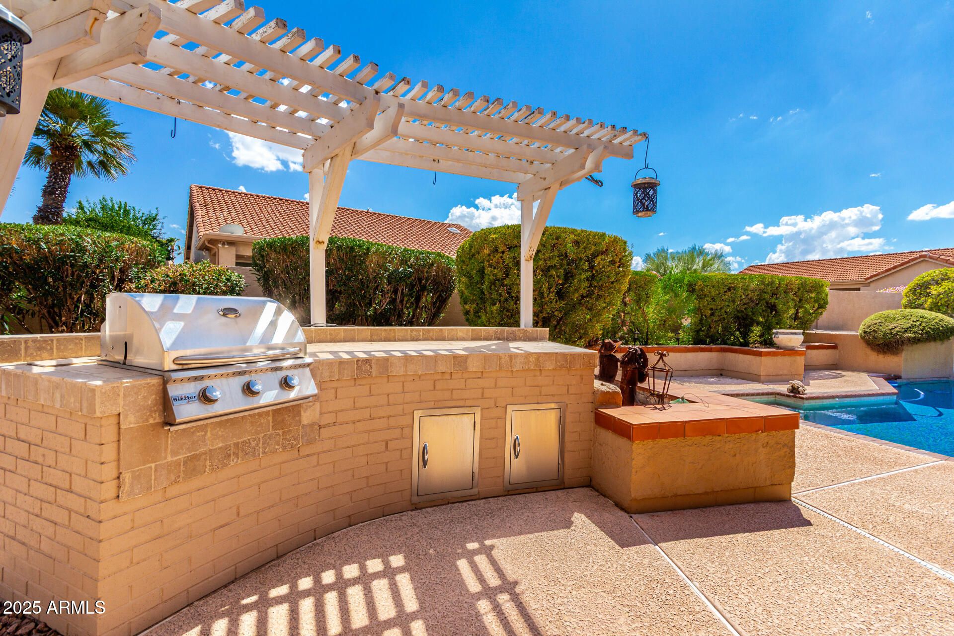 Discover your dream home in the highly desirable Palo Verde community of Sun Lakes. This spacious 2,843 sq ft residence offers 2 bedrooms, a den/office, and 2 bathrooms. Inside, enjoy vaulted ceilings, plantation shutters, soft colors, and a large kitchen and family room with and beautiful view of your private backyard paradise. The backyard is an entertainer's dream, featuring a sparkling pool, covered patio, attached BBQ, perfect for relaxing or hosting gatherings. The main bedroom includes a walk-in closet and a private exit to the pool area. The home also offers a 2 ½-car garage with built-in storage cabinets. Enjoy resort-style living with nearby golf, tennis, pickleball, fitness, and dining options. Furniture available to make your move easier.