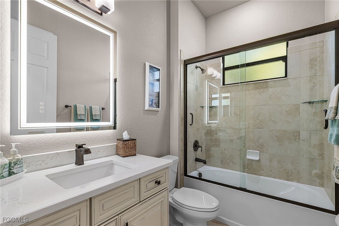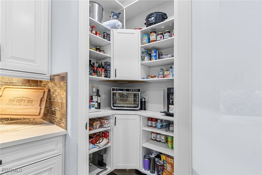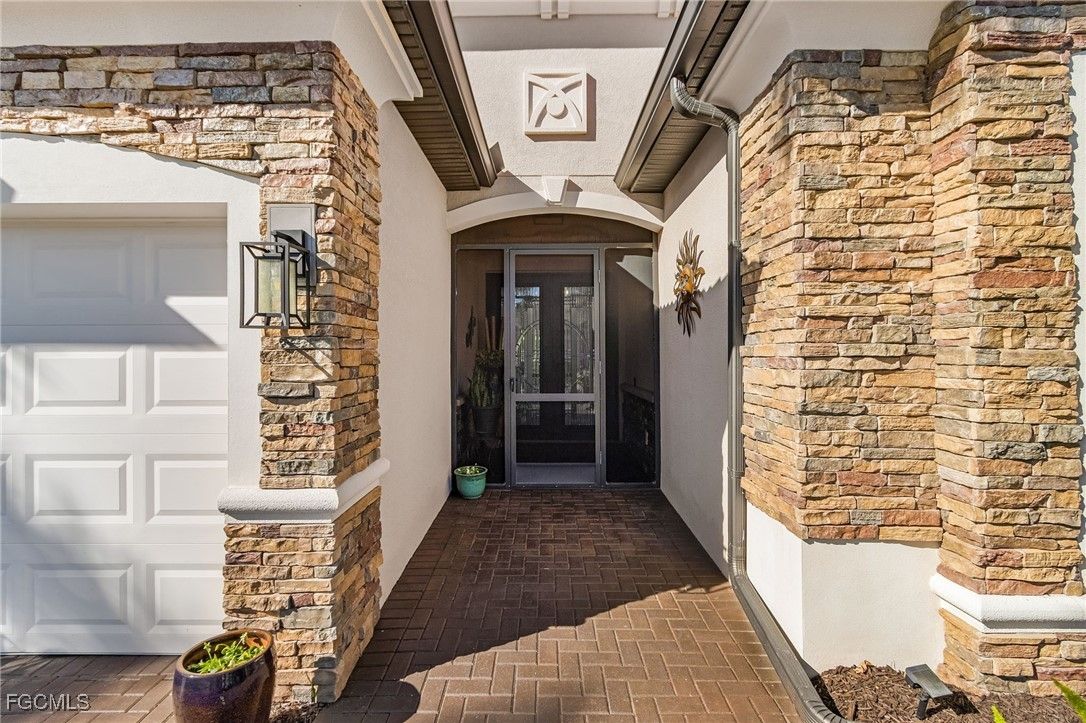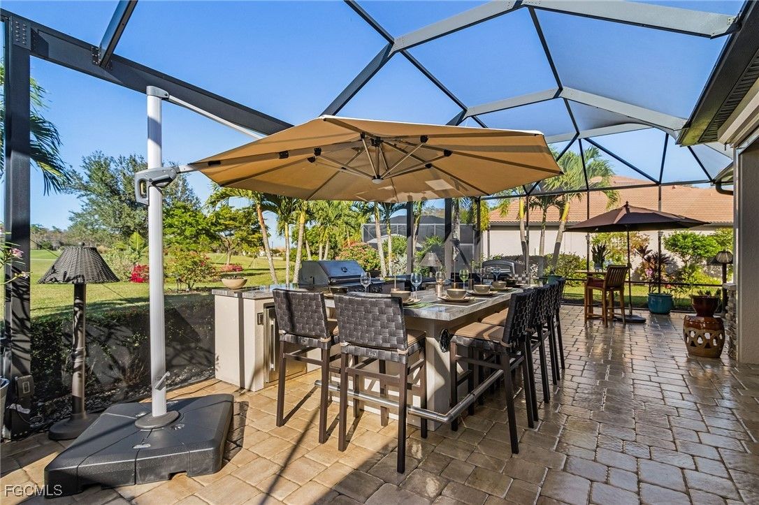 An entertainers dream home situated on a 1/3 acre lot with views of the golf course, preserve and located on the cul-del-sac section of Pistoia Drive with an enclave of 17 homes. This Summerville II luxury home is 2445 sq ft with 3 bedrooms, 3 baths, den and 3 car garage with extensive upgrades throughout. The large extended lanai is the centerpiece for entertainment with an additional 1000+ sq ft of space with an outdoor kitchen/bar and a covered lanai with a tongue and groove wood ceiling and stacked stone accent wall. Enter the home through two beautiful designer glass doors to a large foyer leading to the open main living area with Living/Dining and Kitchen for inside entertaining. The Kitchen, with large island has quartz countertops, upgraded backsplash, lighting, newer LG refrigerator and Bosch dishwasher and custom designed walk-in pantry to include quartz countertop and additional electric for appliances. The Living Rm has a custom built wall unit with stacked stone, shelving and accent lighting, plus a tongue and groove wood trey ceiling, chandelier and custom window coverings. The Dining area also has custom window coverings and upgraded lighting. The Primary Bedroom includes upgraded lighting, window coverings and trey ceiling that leads to the large Primary Bath with lighted mirrors, quartz countertops, new sinks, faucets and showerhead. Additionally, there are two separate walk-in closets, designed by California Closets. The Guest Bedrooms and Den have plantation shutters and both Guest Baths have quartz countertops, lighted mirrors and new sinks, faucets and glass enclosures for tub/shower. Other home features: Crown molding, Smart Home technology, StormSmart on the covered lanai, all impact windows, whole home surge protector, whole home water filtration system and electric hook-up for a generator. The exterior features stacked stone on the front and rear of the home with extensive landscaping around the property to include 15 large palm trees with accent lighting. Furnishings are available in a separate bill of sale. Items that convey with the home: All wall mounted TV’s, Sono’s system, Firepit with 4 chairs and a generator. Pelican Preserve is a nationally recognized active adult 55+ community with endless amenities including the Flip Flops outdoor restaurant, 3 pools, Tennis, Pickleball, Bocce, Softball, Fitness, Movie Theater, Billiards, Hobby Rooms, Amphitheater, Destinations indoor restaurant, plus many special events throughout the year. The Brokke Center includes a Library, Card Rooms and Coffee Center for socializing with friends. Pelican Preserve has a 27 hole Private Golf Club with optional memberships. Pelican Preserve is a short drive to RSW Airport and many shops and restaurants and the gulf coast beaches.