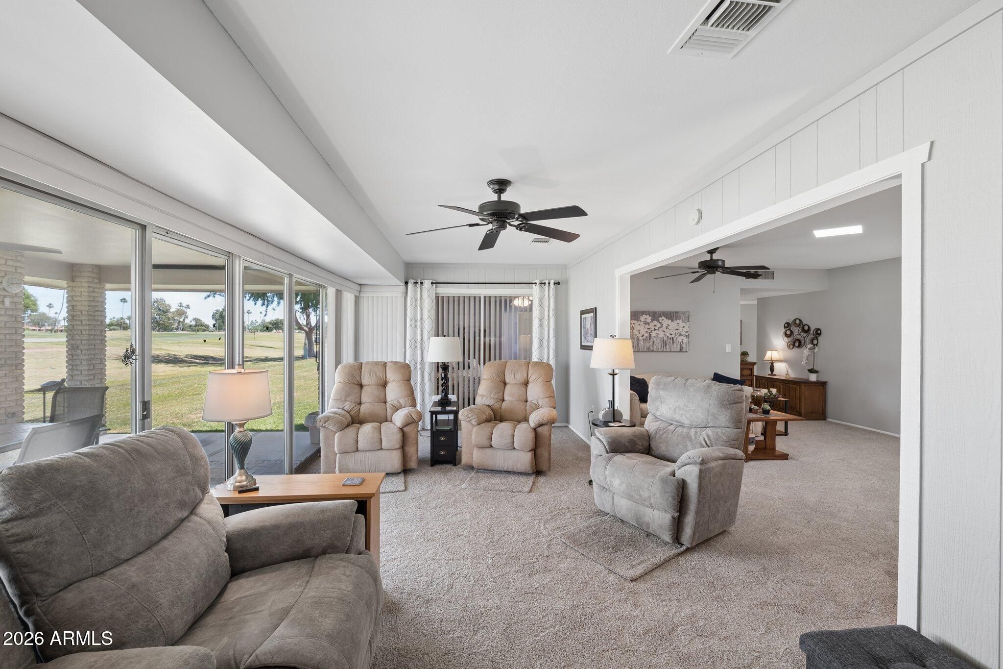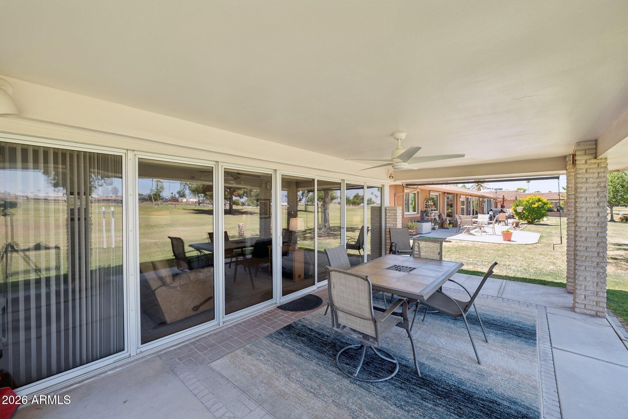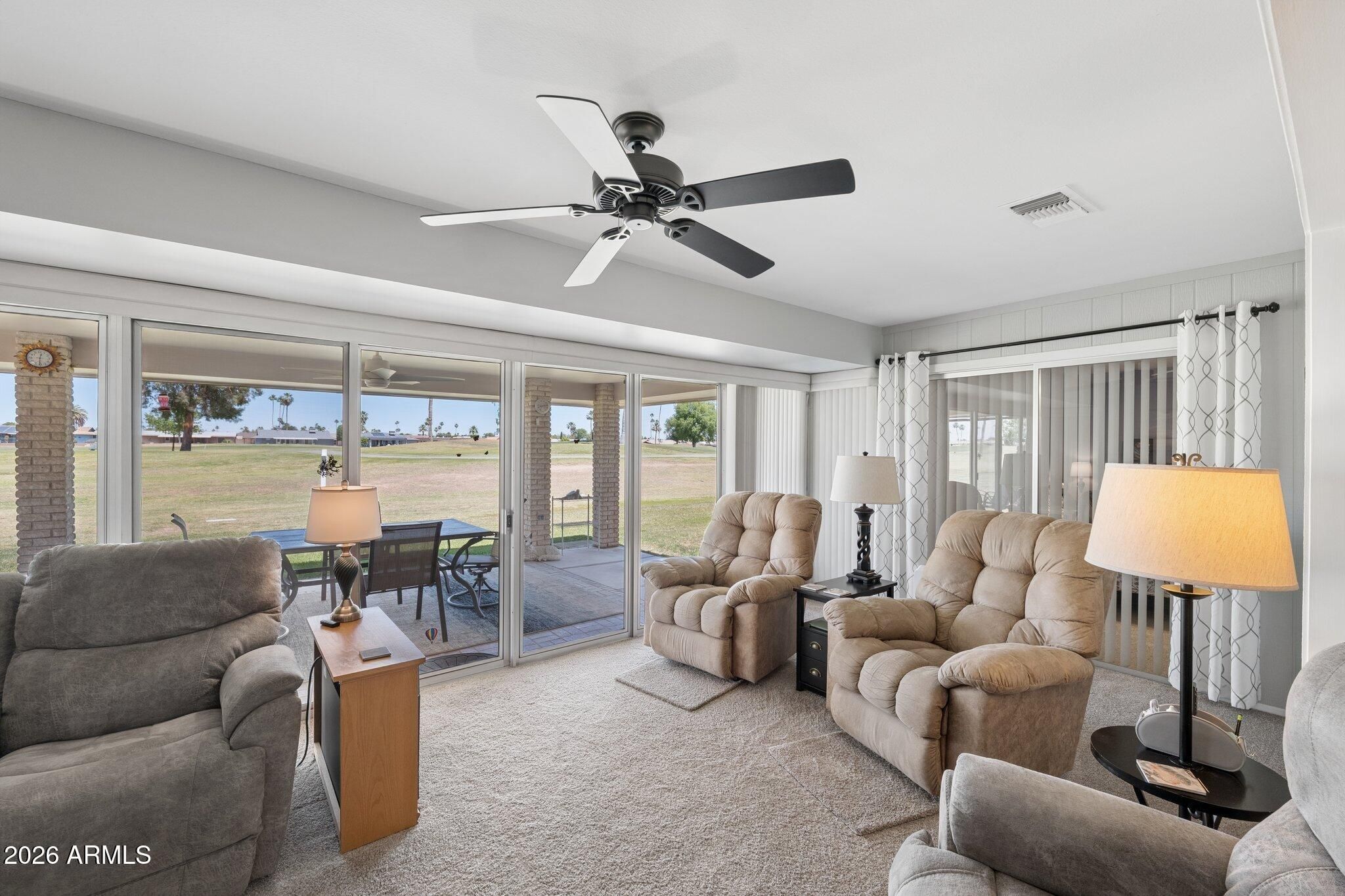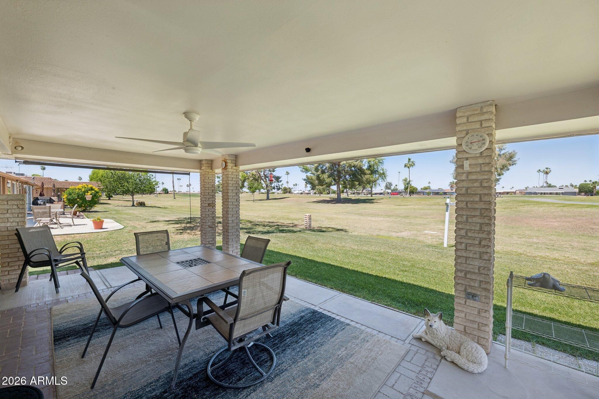 This beautifully maintained, airy, spacious and updated GOLF Course gem has a highly sought after floor plan. Enjoy you well appointed kitchen and meals on your north facing back patio with expansive 180° views from east to west. The home is located safely between the 4th green and 5th tee box of Lakes West Golf Course. This home is offered FULLY TURN KEY - furniture, kitchen cooking supplies, major and minor appliances, dishes, utensils, linens, towels, decor, etc. MOVE IN and immediately ENJOY a vibrant, social life in Sun City - the Original 55+ Active Community.