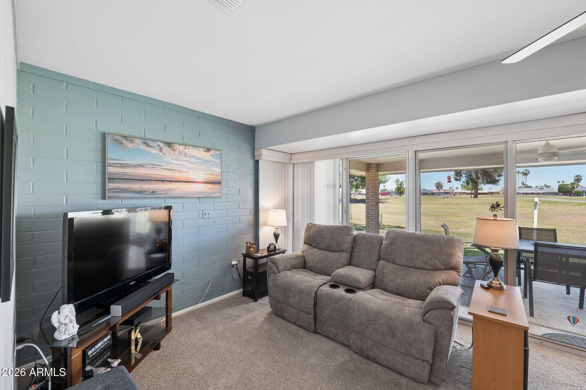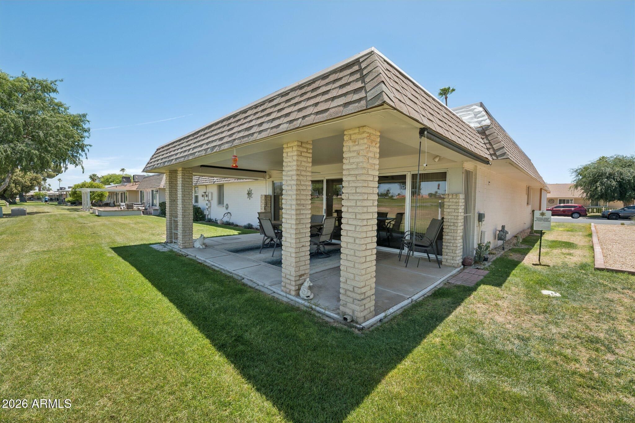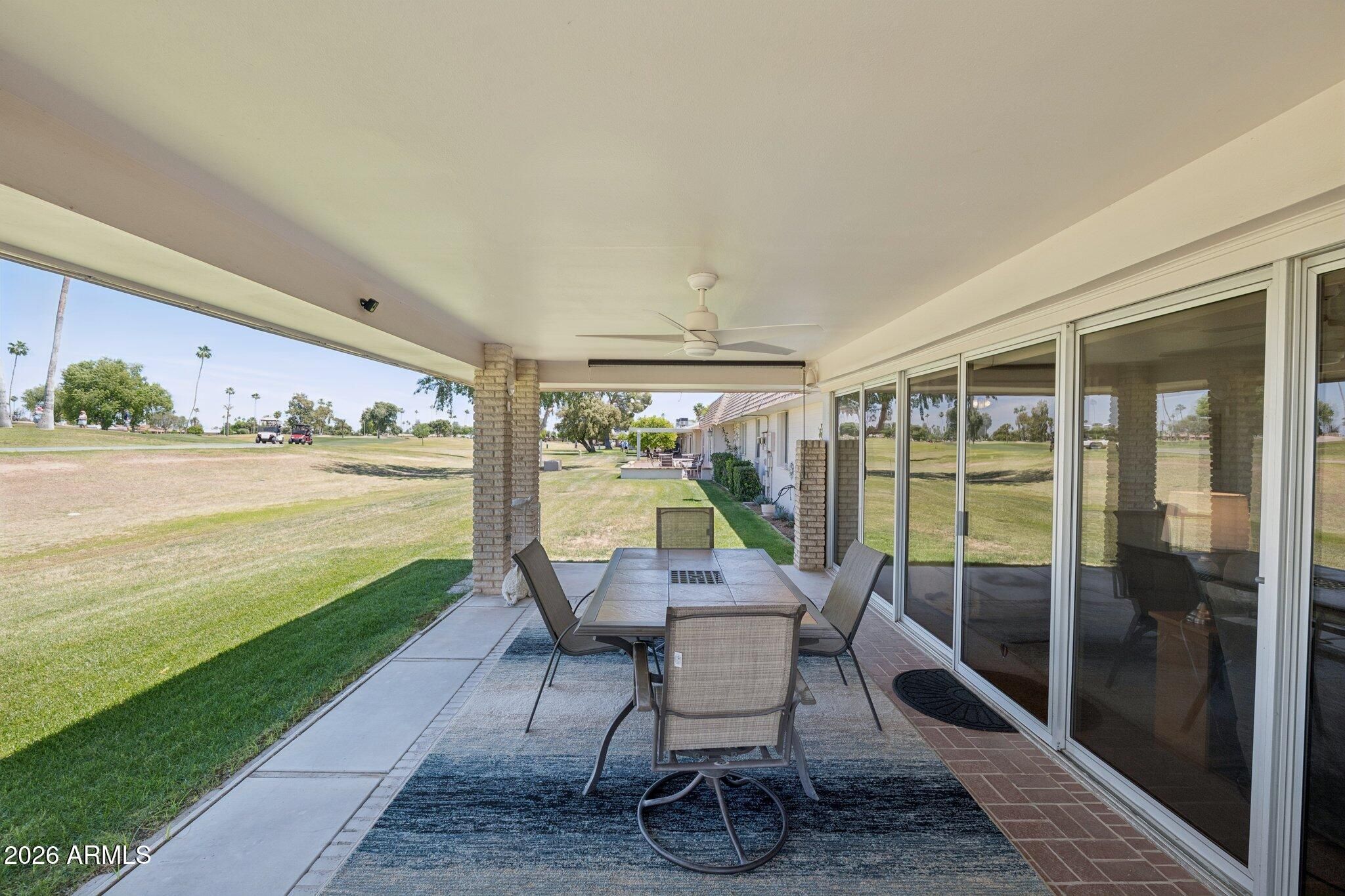 This beautifully maintained, airy, spacious and updated GOLF Course gem has a highly sought after floor plan. Enjoy you well appointed kitchen and meals on your north facing back patio with expansive 180° views from east to west. The home is located safely between the 4th green and 5th tee box of Lakes West Golf Course. This home is offered FULLY TURN KEY - furniture, kitchen cooking supplies, major and minor appliances, dishes, utensils, linens, towels, decor, etc. MOVE IN and immediately ENJOY a vibrant, social life in Sun City - the Original 55+ Active Community.
