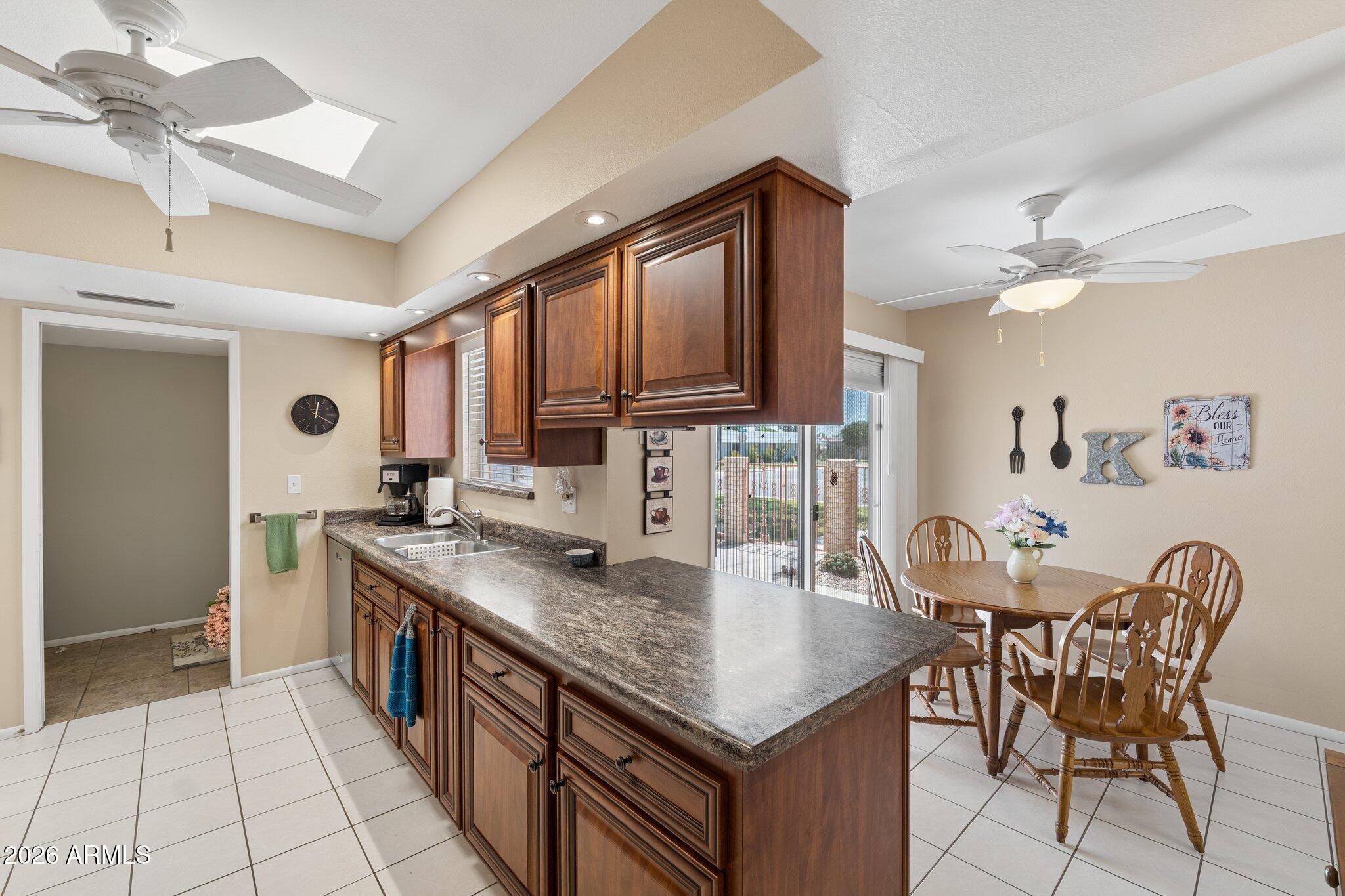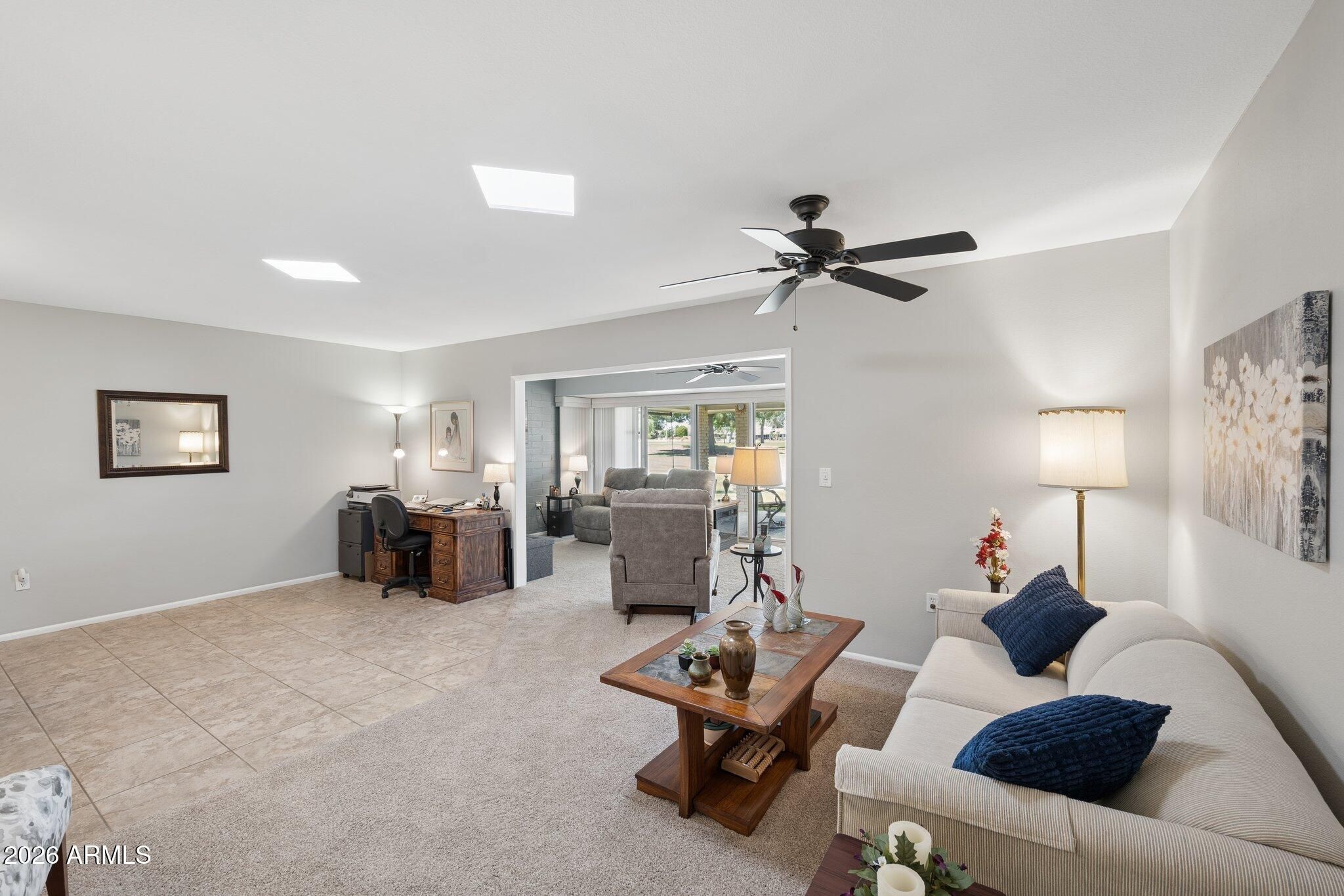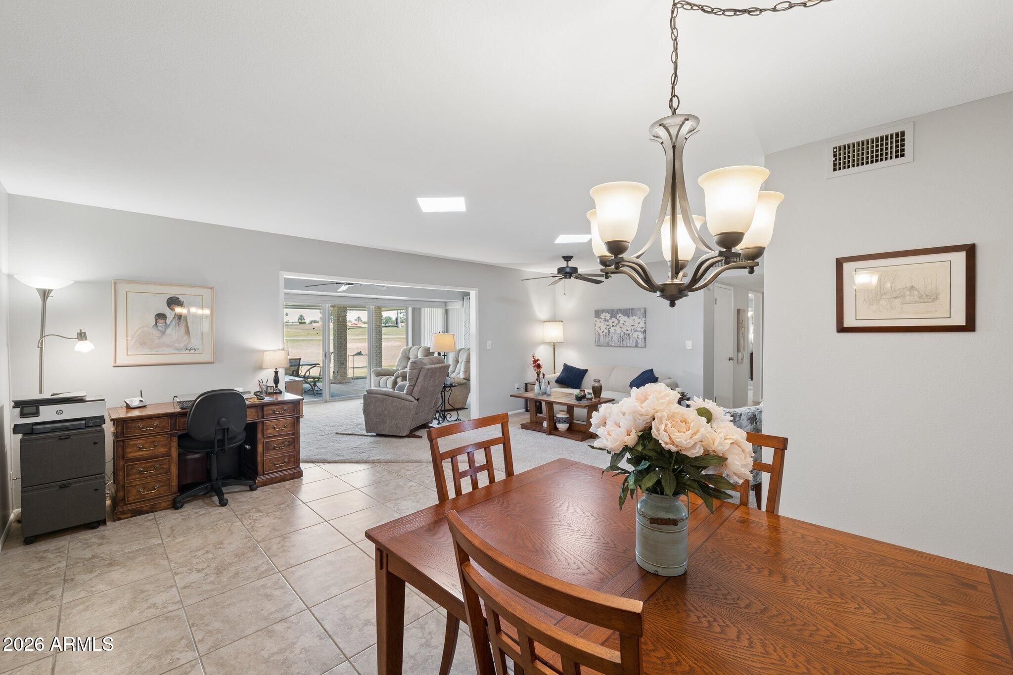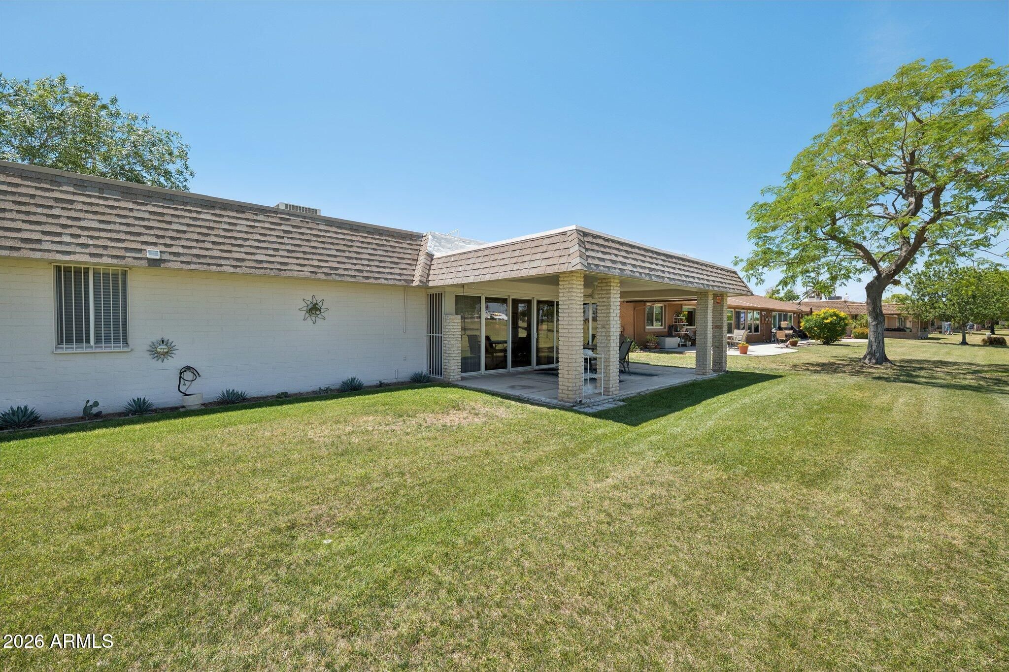 This beautifully maintained, airy, spacious and updated GOLF Course gem has a highly sought after floor plan. Enjoy you well appointed kitchen and meals on your north facing back patio with expansive 180° views from east to west. The home is located safely between the 4th green and 5th tee box of Lakes West Golf Course. This home is offered FULLY TURN KEY - furniture, kitchen cooking supplies, major and minor appliances, dishes, utensils, linens, towels, decor, etc. MOVE IN and immediately ENJOY a vibrant, social life in Sun City - the Original 55+ Active Community.