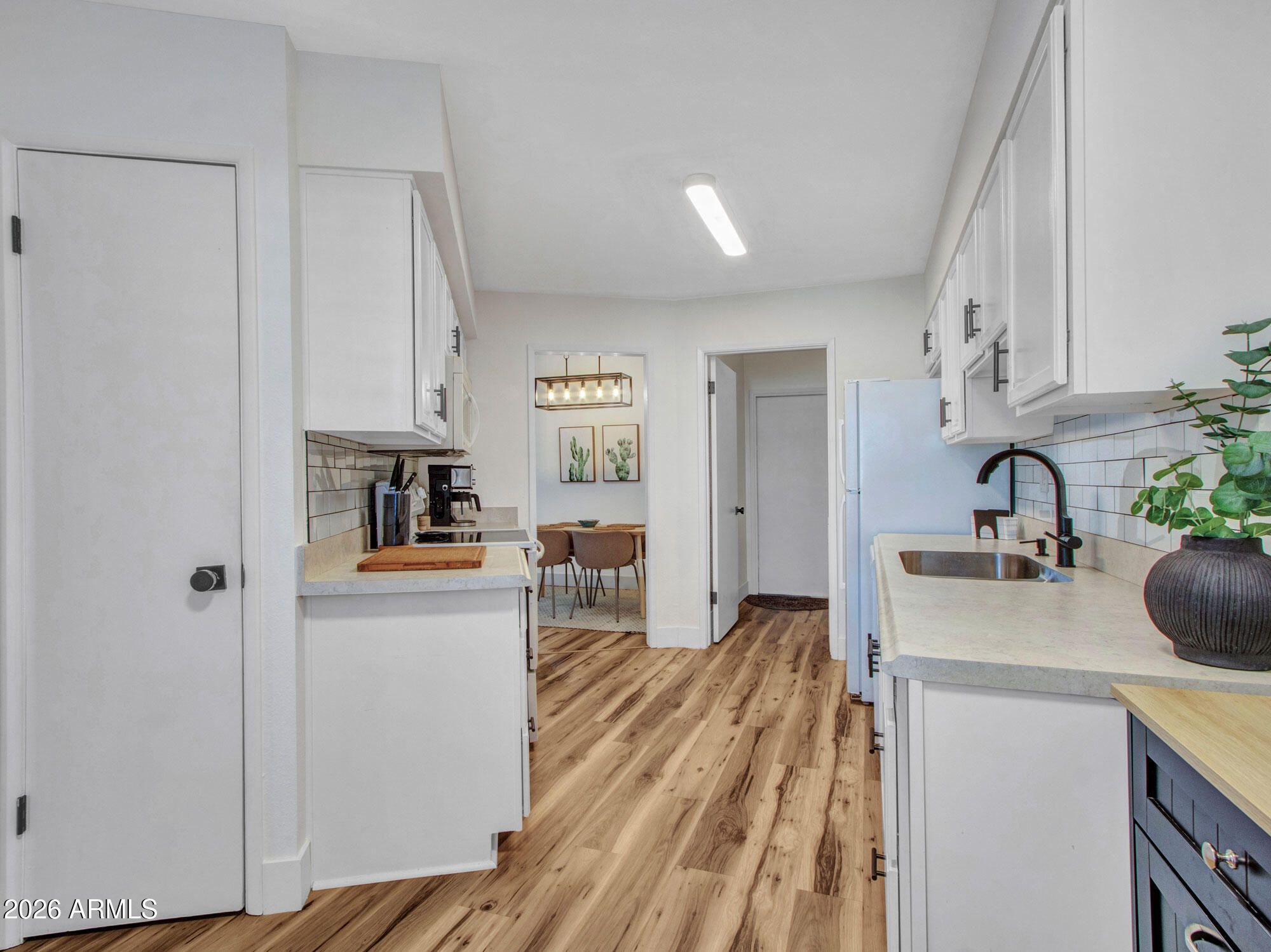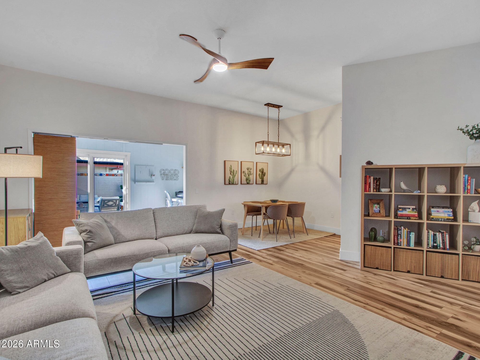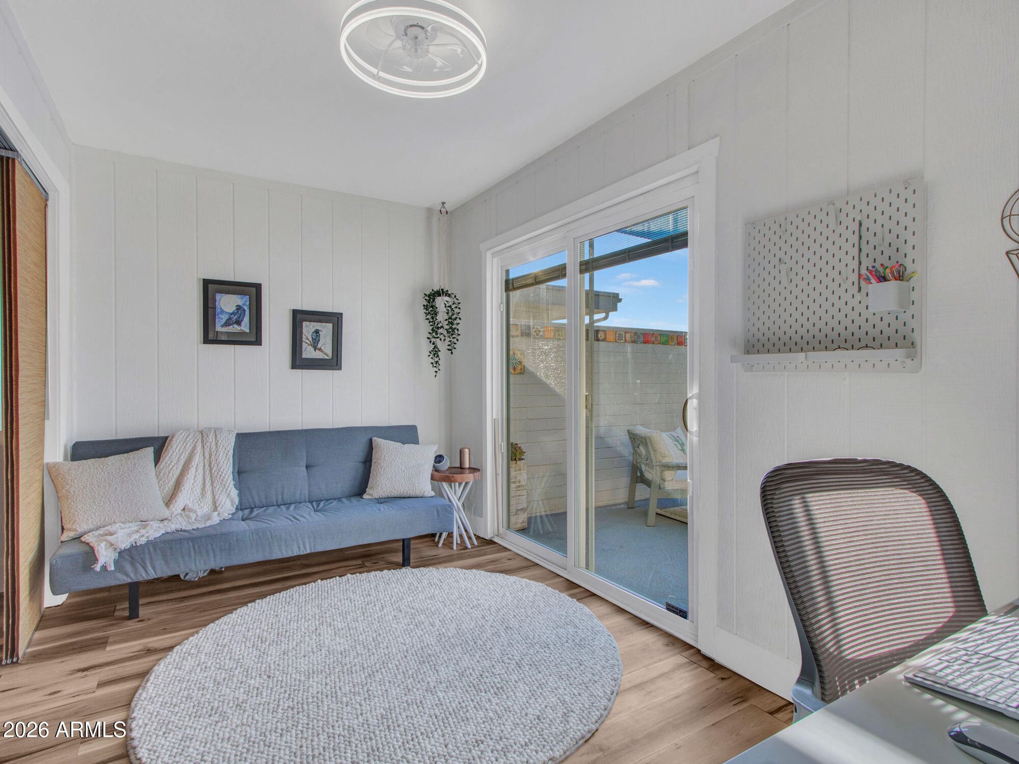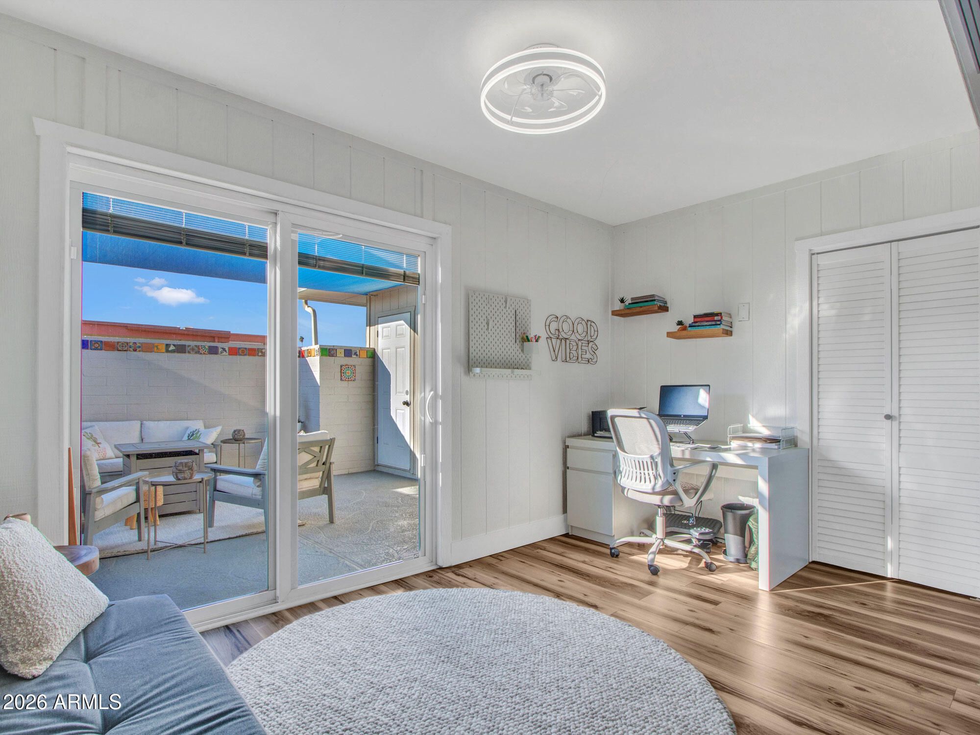 Beautifully Upgraded Home! This home is an end unit with high ceilings, Upgraded Laminate Wood Flooring Throughout Entire Home! Upgraded Light Fixtures in All Rooms*Bathroom has Upgraded White Vanity with Granite Countertops*White Cabinets with Upgraded Hardware, Faucet & Sink in Kitchen*White Appliances Included*Washer/Dryer Included*Morning Dining Area and Family Dining Area with Upgraded Modern Lighting*Bonus Room/Den off Living Room & Patio is Perfect for a Hobby Room, Office or Guests. Sliders take you to the Enclosed Patio with Sun Sail for Shade & Fantastic for Small Pets! This Cool Tone Modern Home is Bright, Airy and Surely to Impress!