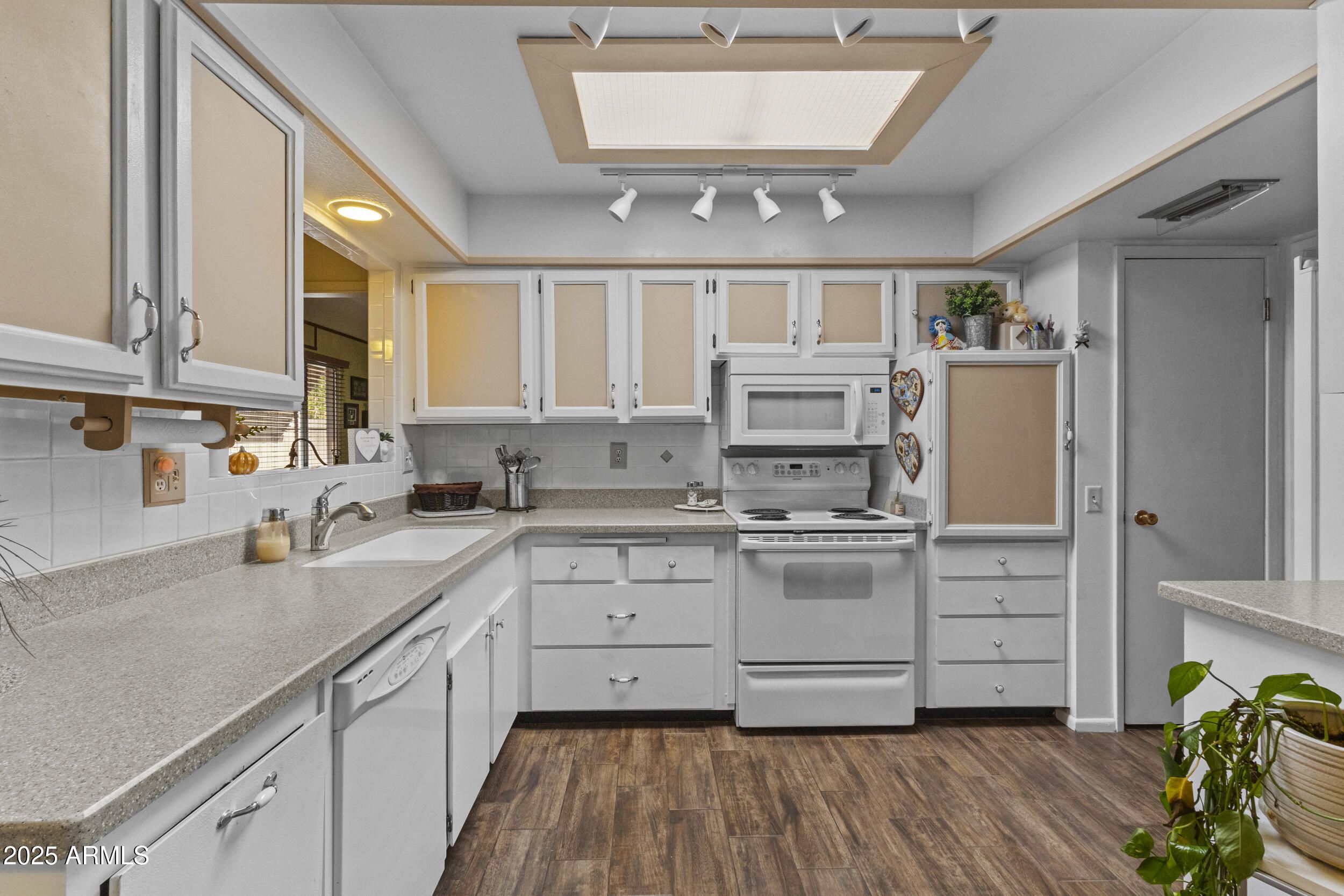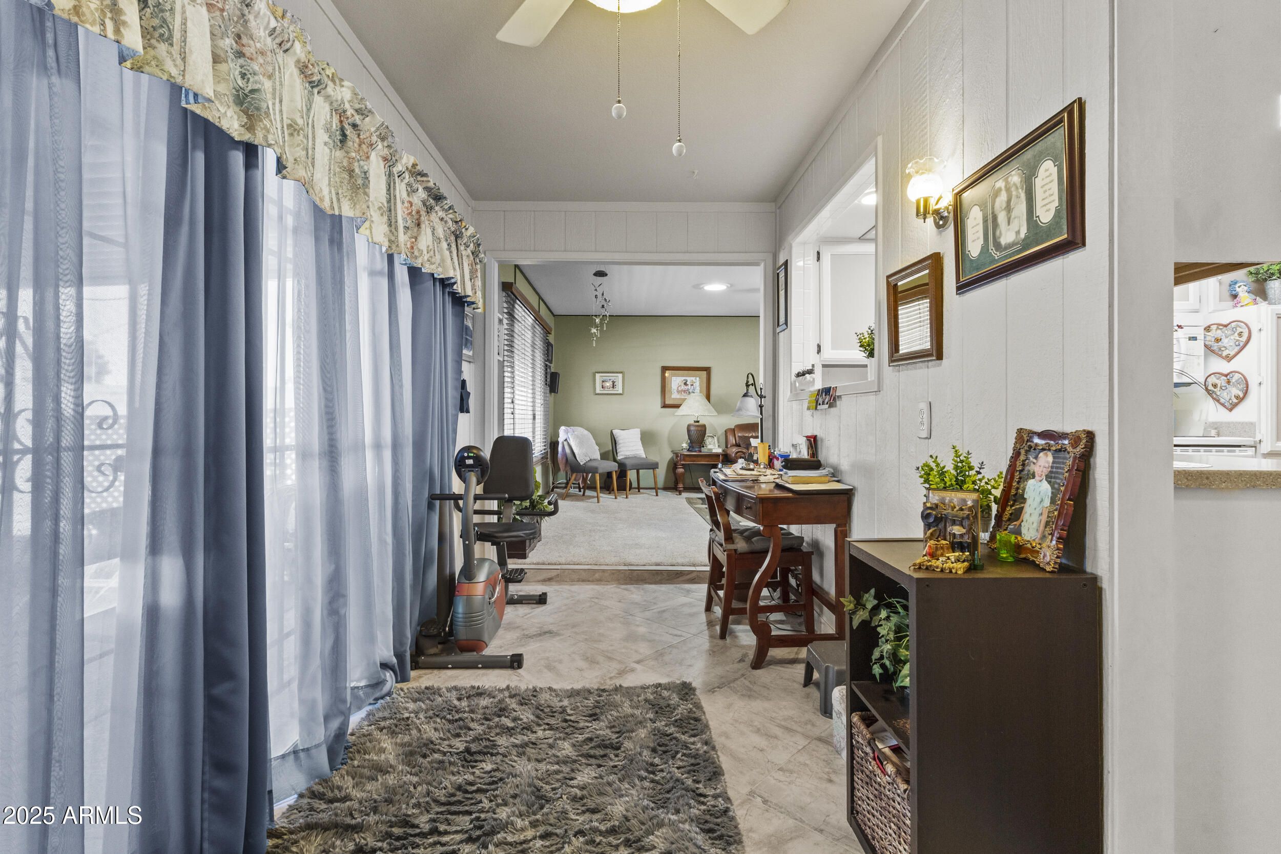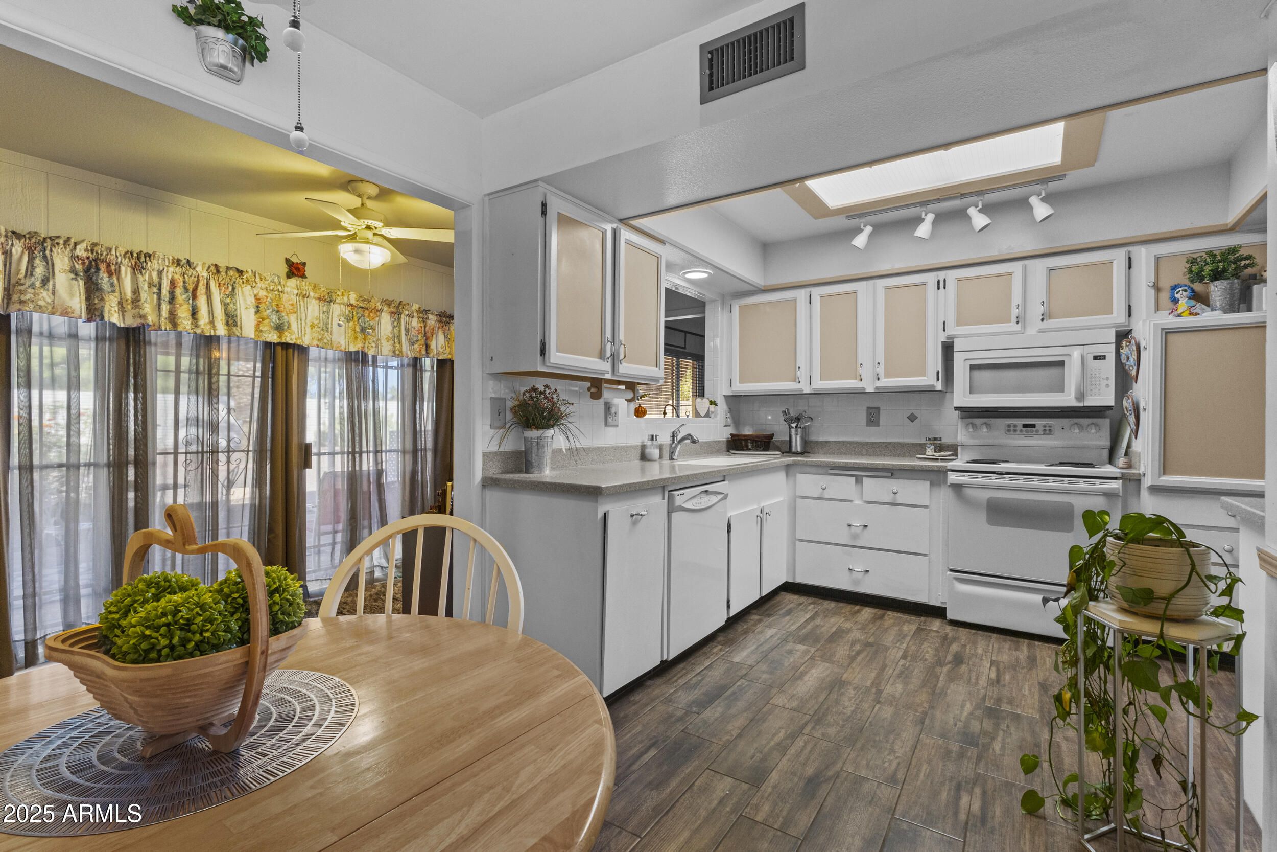 This FANTASTIC and FUNCTIONAL floorplan has a LARGE GREAT ROOM as you enter, a FLEX ROOM, currently used as a dining room, an EXTENSION at the ENCLOSED PORCH area, and a BONUS ROOM/DEN with ENCLOSED LAUNDRY ROOM*Your KITCHEN has UPDATED COUNTERS, white appliances, and a PANTRY*OWNER SUITE has vanity, WALK-IN CLOSET, and SHOWER at bath*Secondary bedroom has LARGE WALK-IN closet*You have flooring of WOOD-LIKE TILE and carpet*NEWER ROOF*Enclosed TWO-CAR GARAGE*EXTERIOR has EXTENDED COVERED BACK PATIO and EASY CARE DESERT LANDSCAPE at the expansive yard*COME BY and see why YOU WILL WANT TO CALL THIS PLACE YOUR ''HOME''