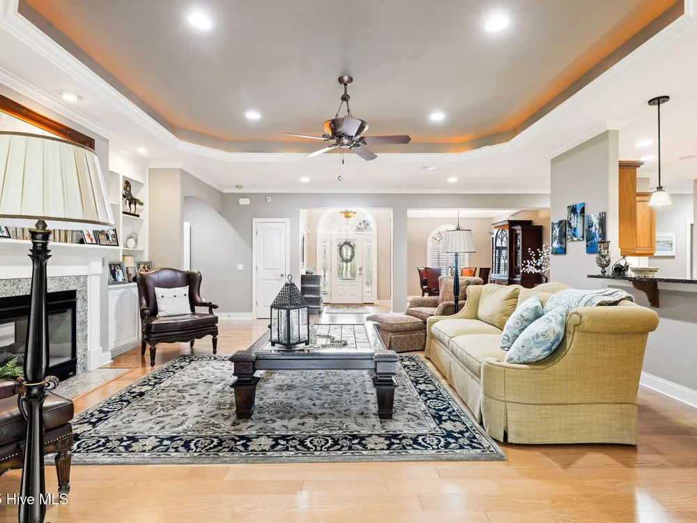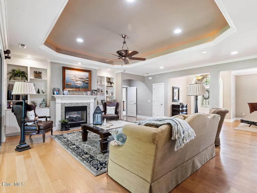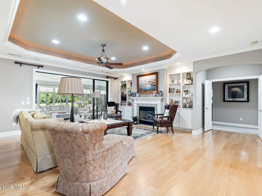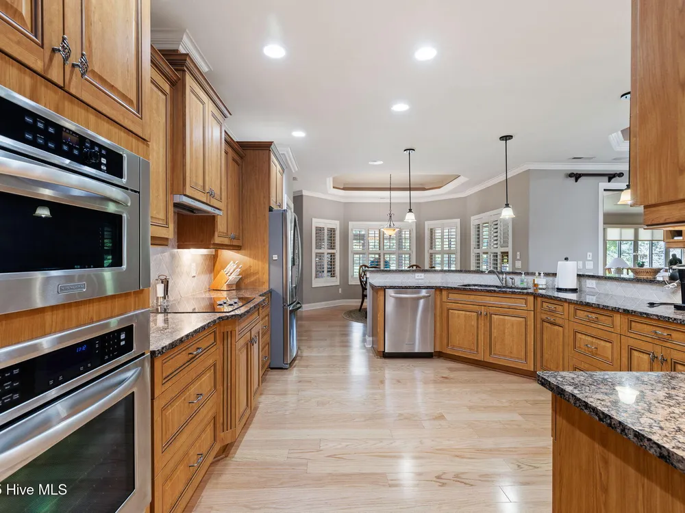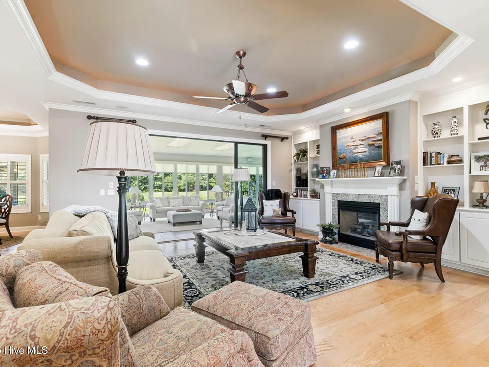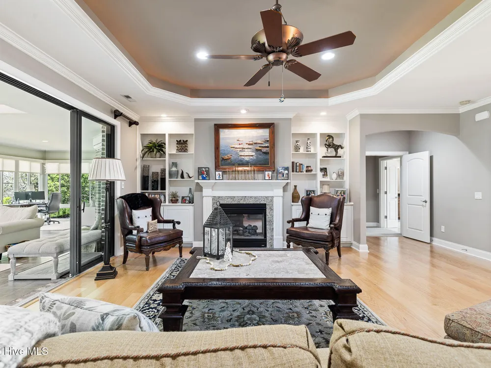 - Blinds/Shades, Sound System, Wet Bar, Walk-In Closet(s), Walk-in Shower, Tray Ceiling(s), Entrance Foyer, Pantry, Mud Room, Master Downstairs, Kitchen Island, High Ceilings, Gas Log, Ceiling Fan(s), Bookcases