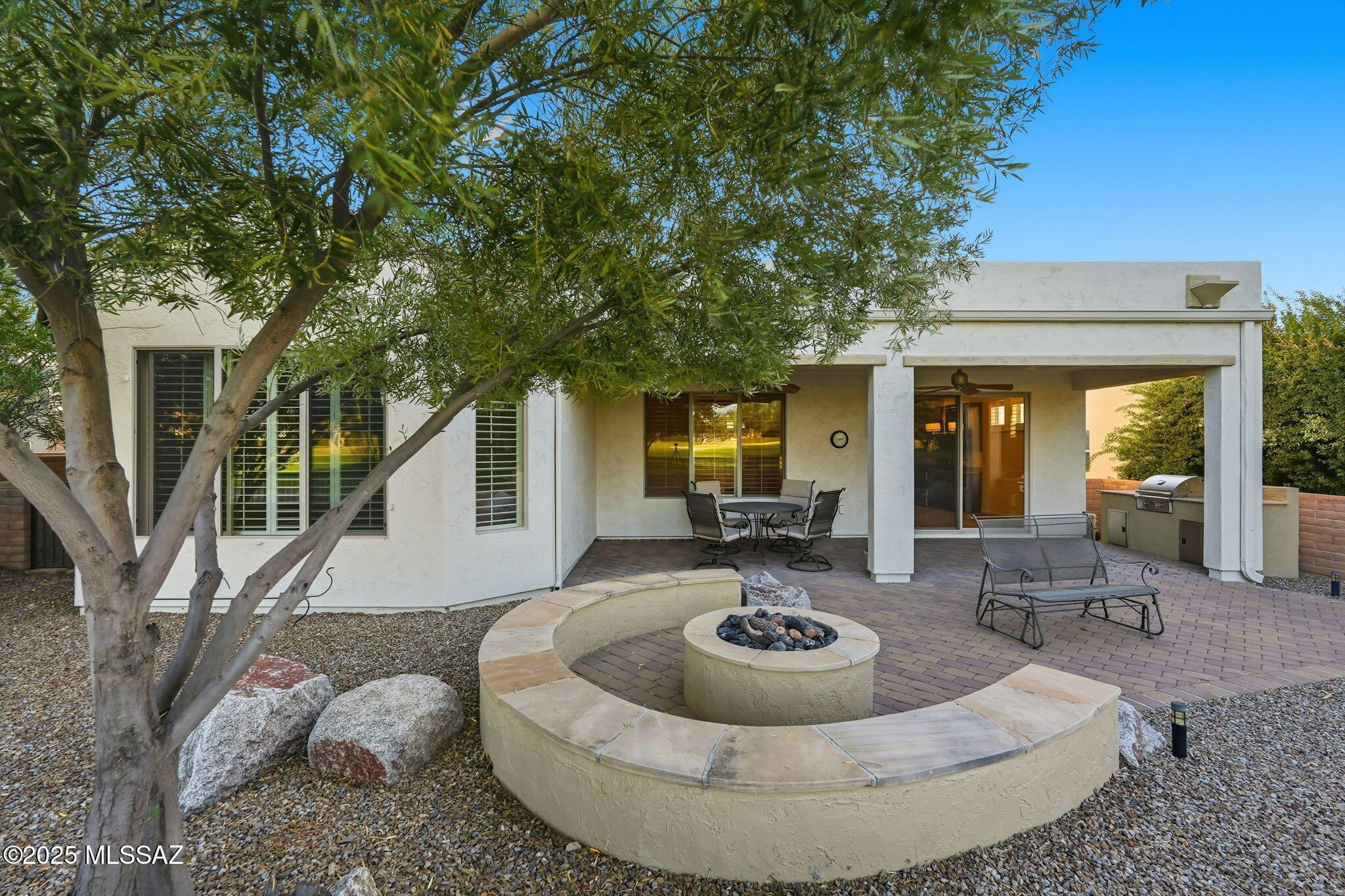 Welcome to this stunning GOLF VIEW home located in Quail Creek! This beautiful RIVA model offers a backyard designed for relaxation and entertainment, complete with a built-in barbecue, extended patio pavers and fire pit, perfect for enjoying a glass of wine under the stars.Inside, you'll find a split floor plan with lots of natural light. The kitchen features granite countertops, stainless steel appliances, and upgraded cabinetry with elegant plantation shutters. The new 2023 HVAC system ensures comfort and efficiency year round. The extended garage has plenty of storage with built-in cabinets and a water softener.