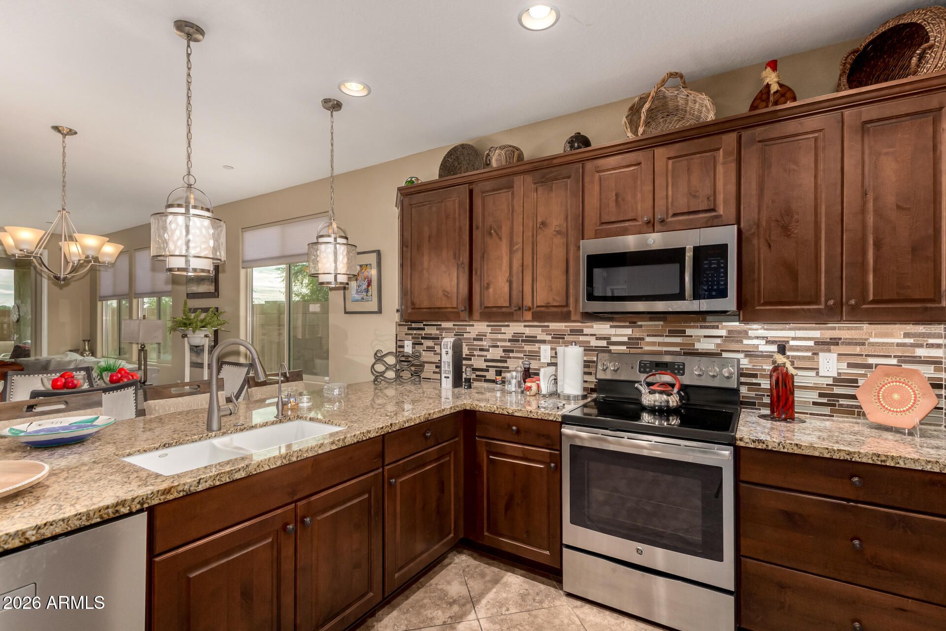 Built in 2017 and thoughtfully updated, this beautiful home offers both comfort and style in the heart of Sun City's premier active adult community. A paver driveway sets the tone for the home's quality. Inside a den w/ elegant glass doors perfect for a home office. The kitchen is a centerpiece, featuring rich wood cabinets, granite countertops, stainless steel appliances, and a walk-in pantry, the open design flows seamlessly into the great room. The primary suite offers access to the back patio, a dual vanity, walk-in shower, and generous walk-in closet. Roomy guest bedroom and nearby guest bath ensure comfort for visitors. Retractable doors from the great room lead to your private oasis w/ a paver patio and pergola-perfect for entertaining! Roll-down sun shades on the patio and pergola, plus electric shades for the great room, provide year-round comfort.This Sun City gem combines modern updates with timeless desert charmperfect for those seeking an active, vibrant lifestyle.