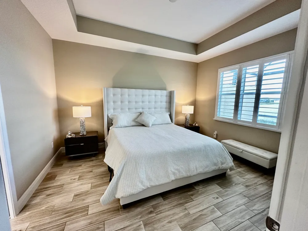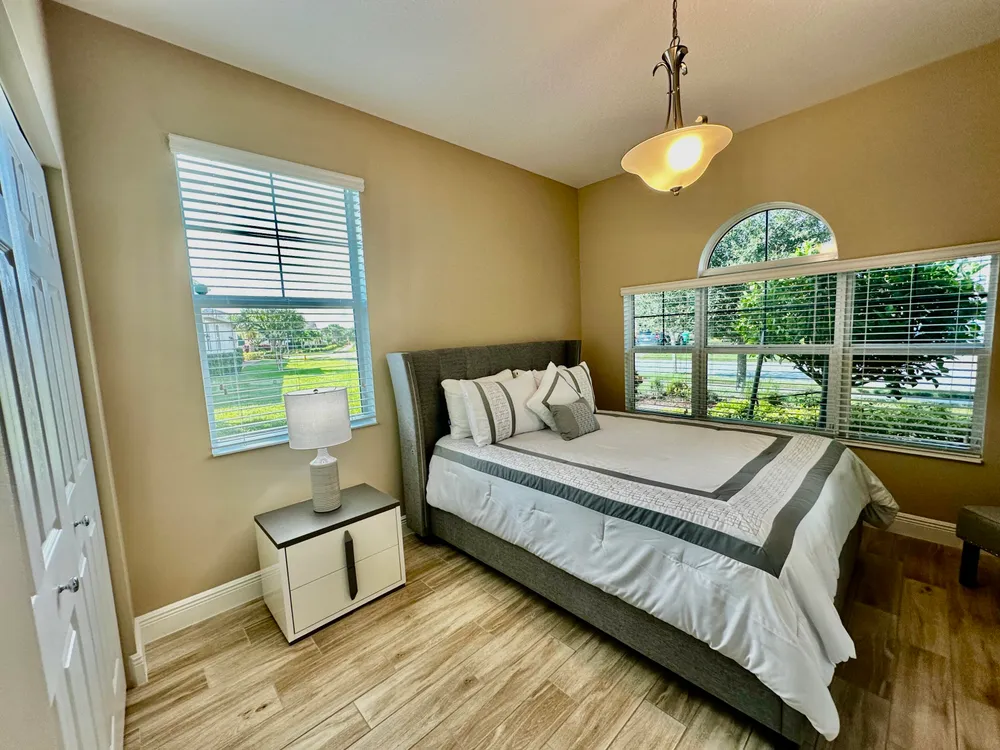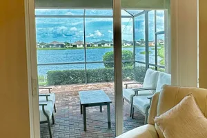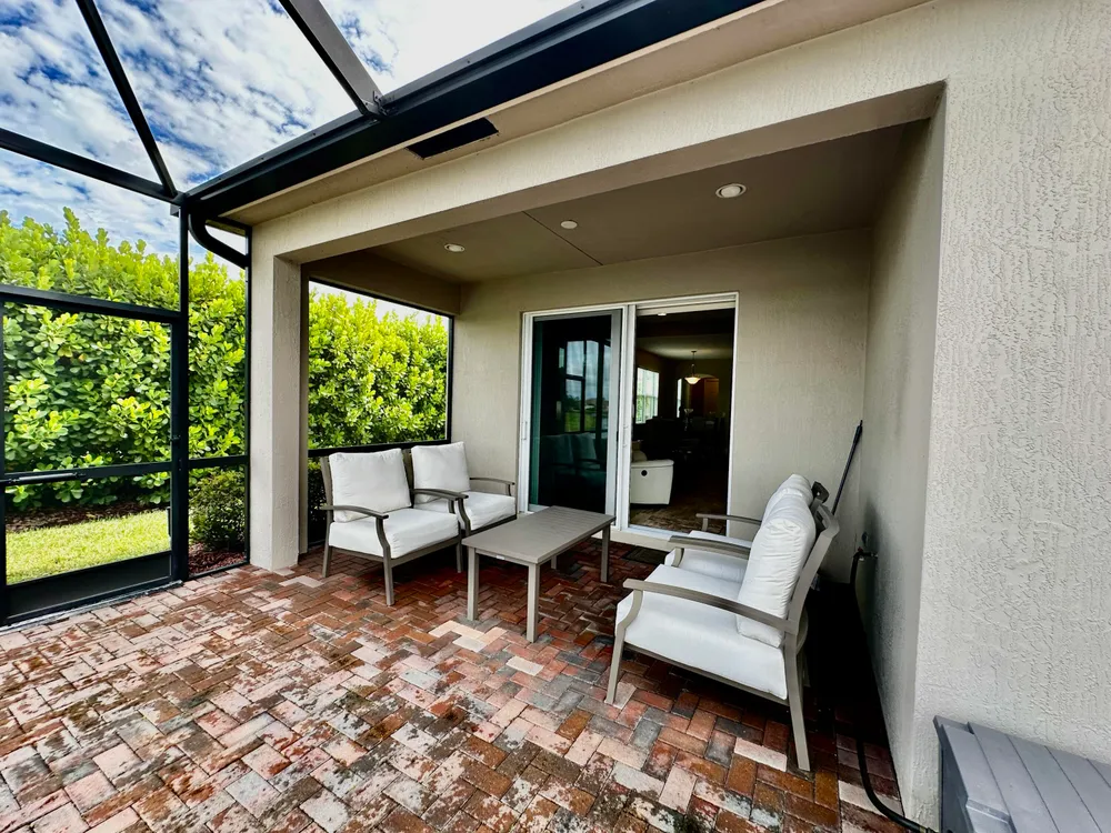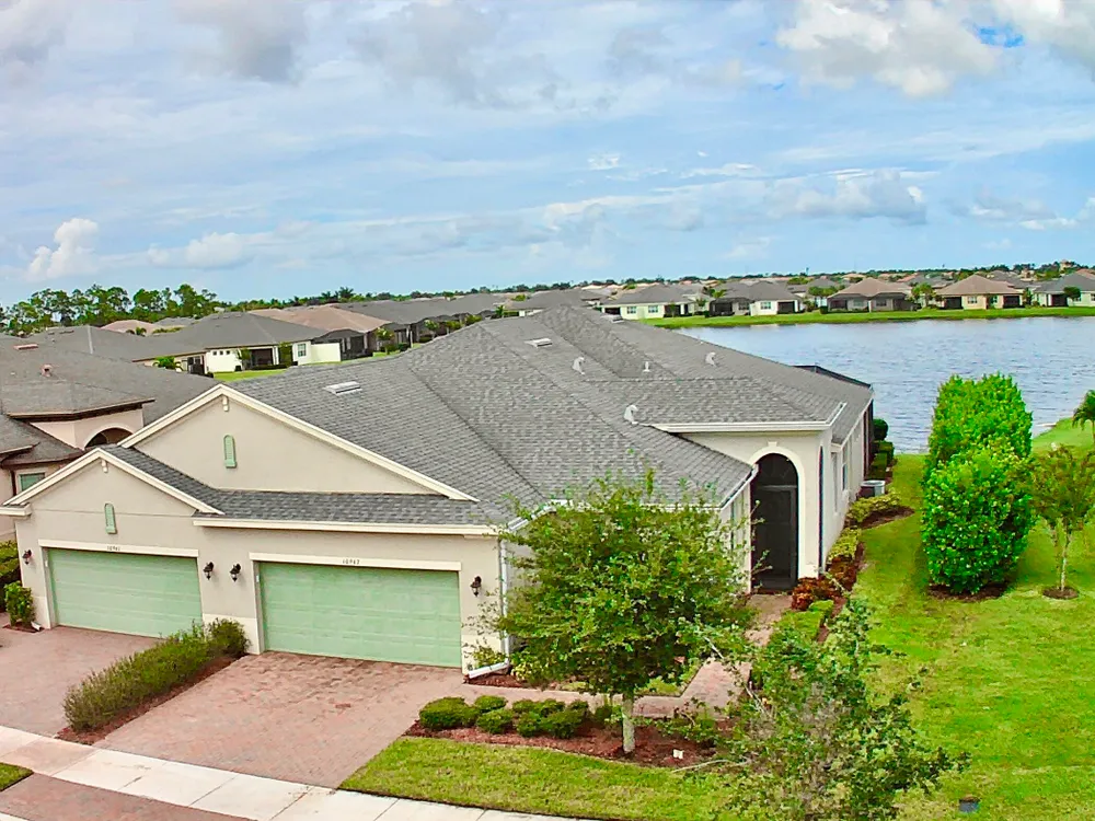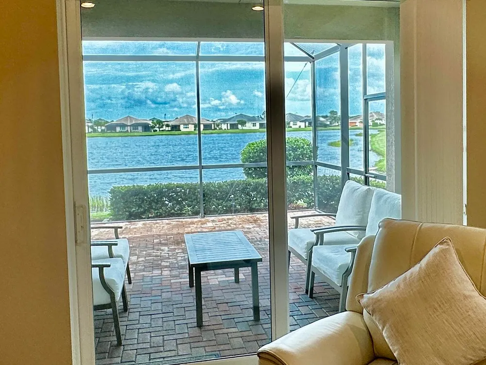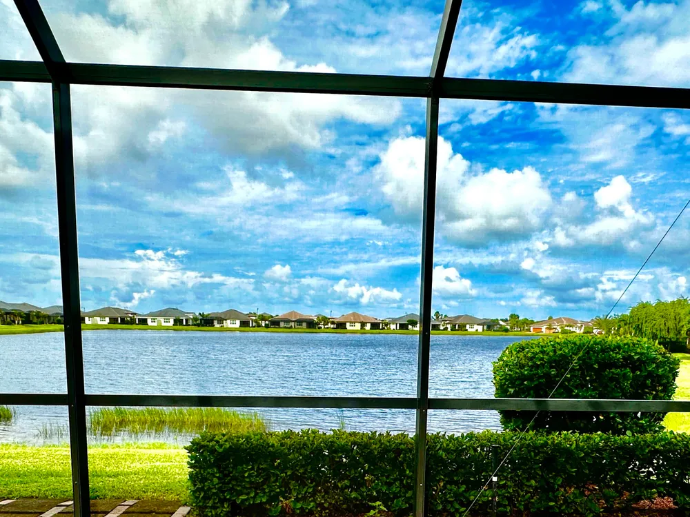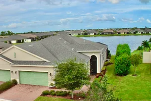 Enjoy serene lake views from this beautifully upgraded 2-bedroom plus den, 2-bathroom Villa in the sought-after 55+ community of LakePark at Tradition. This home features elegant wood-style tile flooring throughout, plantation shutters in the owner's suite, and hurricane impact windows and slider. Recent upgrades include a new washer and dryer, Moen garbage disposal, and a fresh coat of paint throughout the interior. The air conditioning unit is regularly maintained and equipped with a UV light for added efficiency. Smart home features include a new Ring camera/doorbell and Sensi thermostat, both app-controlled. Custom vertical blinds adorn the living room, while the open-concept kitchen showcases stainless steel appliances, quartz countertops, modern white cabinetry, New dishwasher and