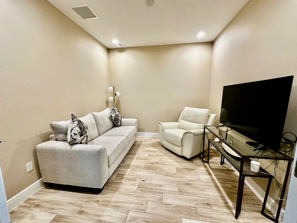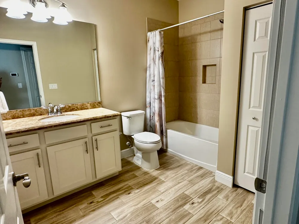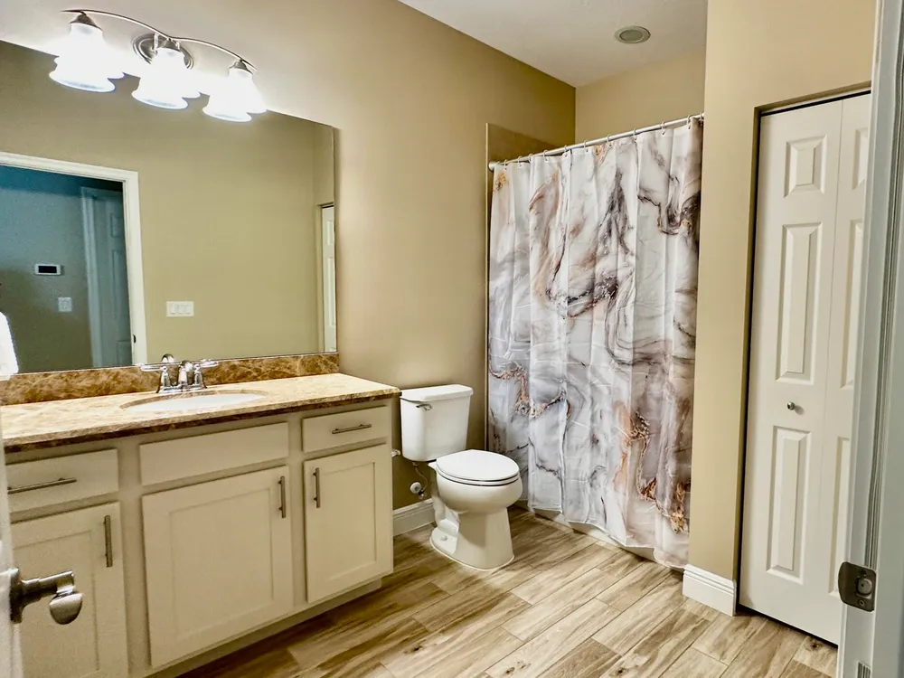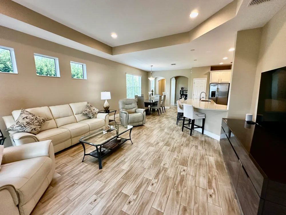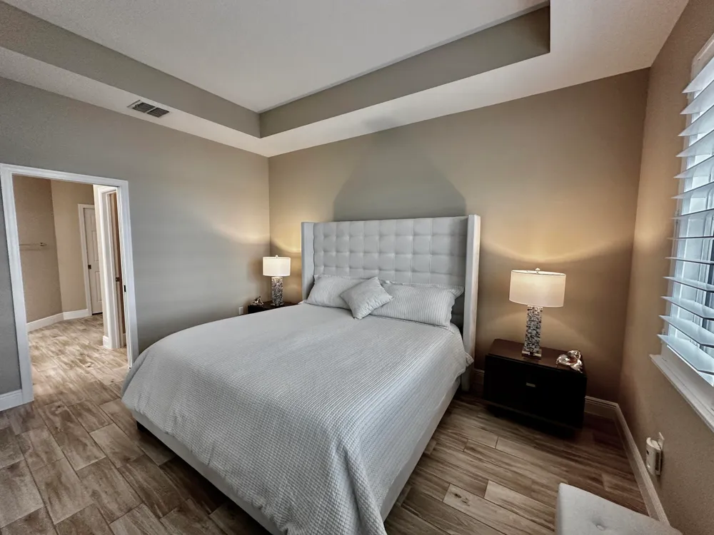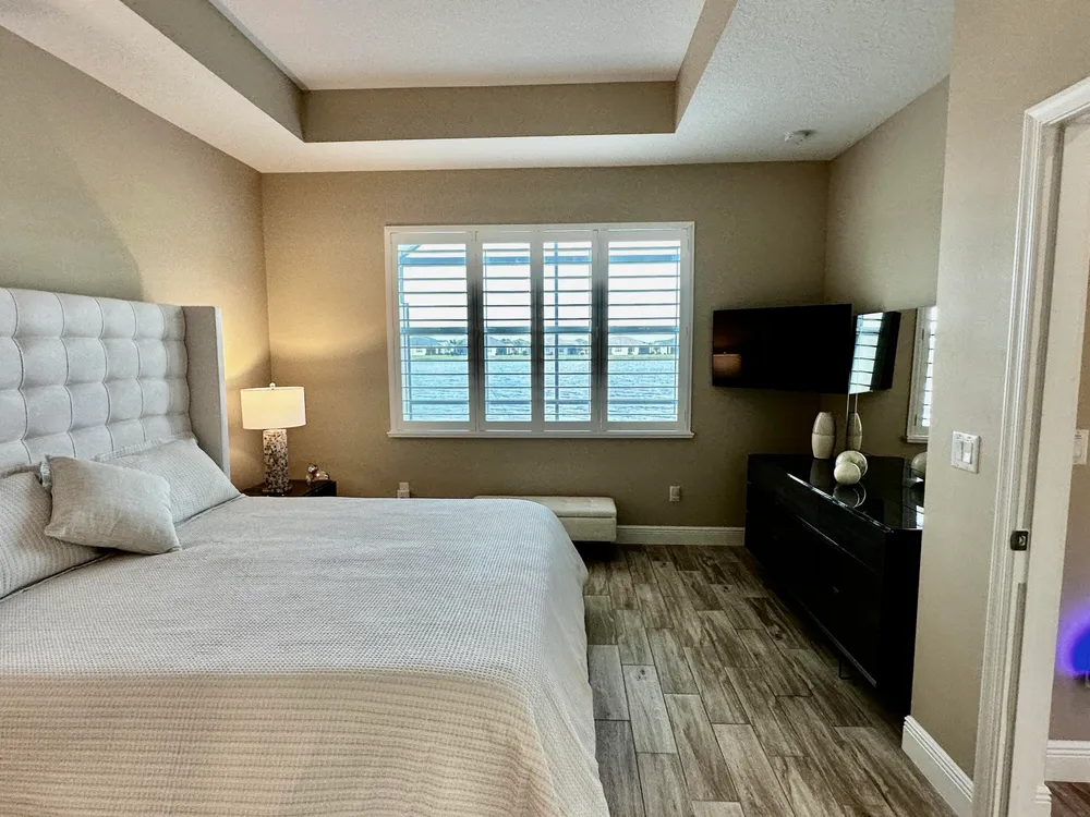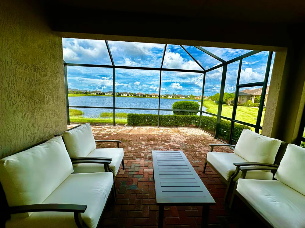 Enjoy serene lake views from this beautifully upgraded 2-bedroom plus den, 2-bathroom Villa in the sought-after 55+ community of LakePark at Tradition. This home features elegant wood-style tile flooring throughout, plantation shutters in the owner's suite, and hurricane impact windows and slider. Recent upgrades include a new washer and dryer, Moen garbage disposal, and a fresh coat of paint throughout the interior. The air conditioning unit is regularly maintained and equipped with a UV light for added efficiency. Smart home features include a new Ring camera/doorbell and Sensi thermostat, both app-controlled. Custom vertical blinds adorn the living room, while the open-concept kitchen showcases stainless steel appliances, quartz countertops, modern white cabinetry, New dishwasher and