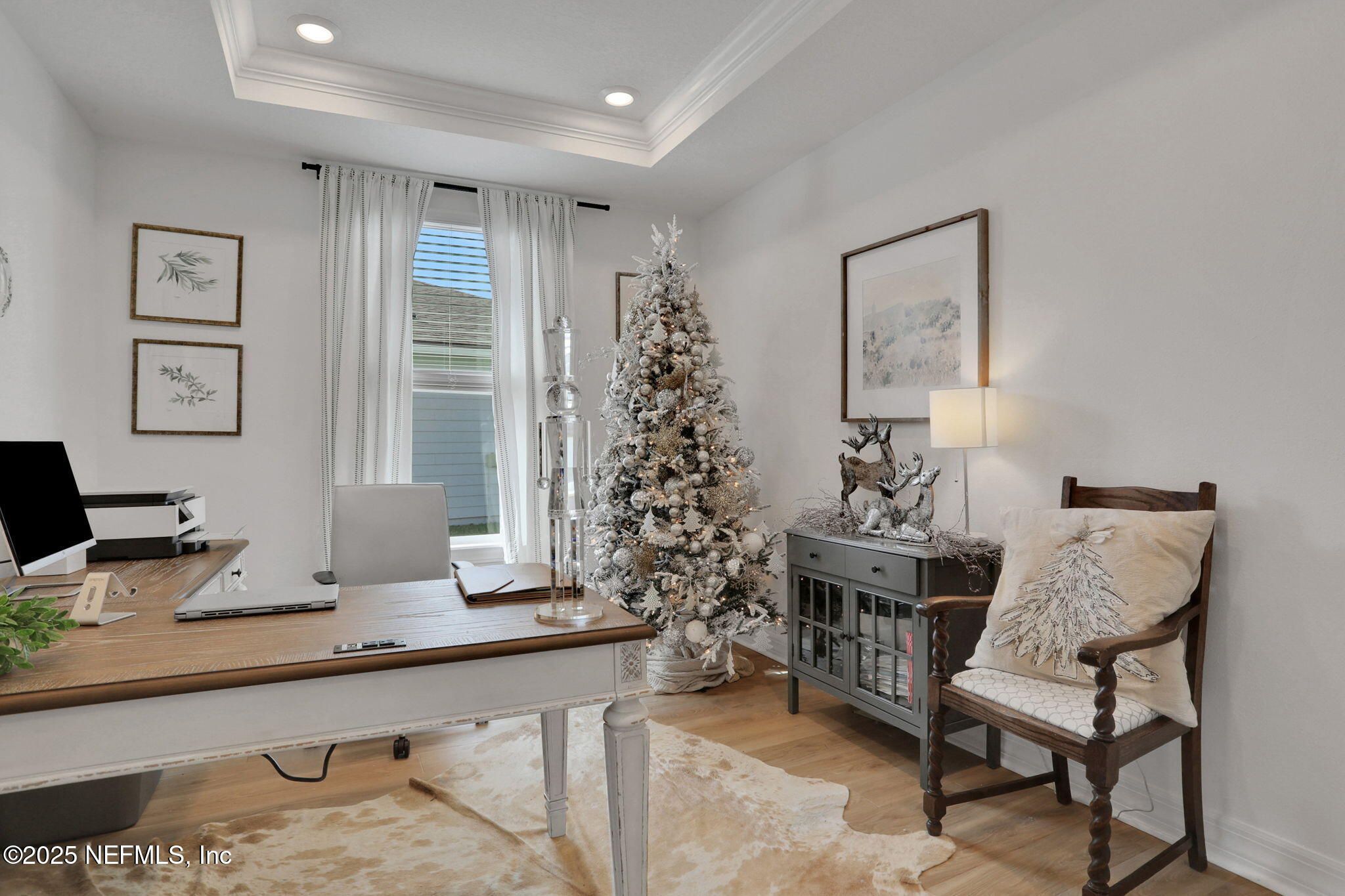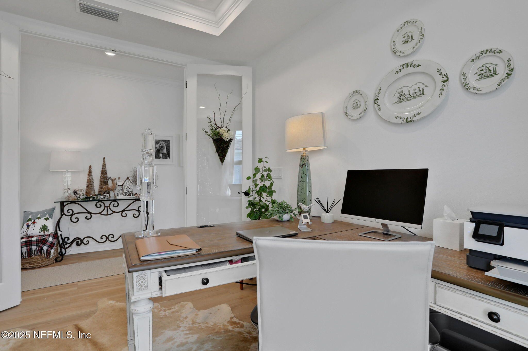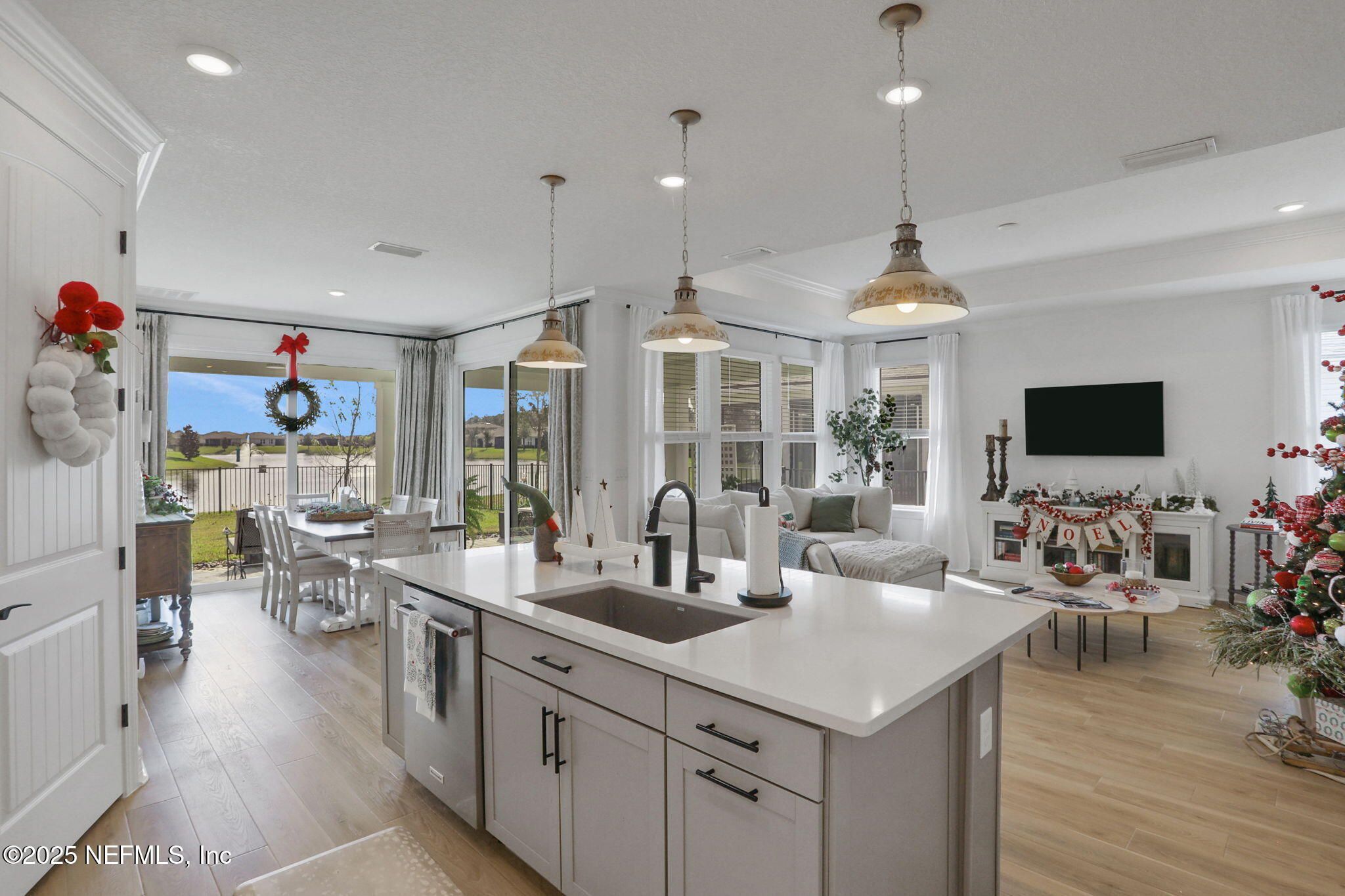 Welcome to this light-filled 1807 sq ft home in the sought-after 55+ Del Webb eTown community. Built in 2024, this beautifully designed 2BR/2BA residence includes a BONUS ROOM/DEDICATED OFFICE with French doors, high-end finishes, tray ceilings, crown molding, and expansive windows throughout. The gourmet kitchen features quartz countertops, a distinctive custom backsplash, gas cooktop, stainless steel appliances, and a custom vent hood. Enjoy serene lake views from the living room, dining room, kitchen, and primary suite. The primary bath offers a large walk-in shower with stunning tile and a double-sink vanity. Luxury vinyl plank flooring anchors the main living spaces while tile finishes the baths. An oversized covered pavered lanai invites outdoor living with southeast exposure and abundant wildlife. The home offers zero-entry convenience, a coated garage floor, a pavered driveway, and access to Del Webb's exclusive amenities, walking trails, and golf-cart-friendly lifestyle.