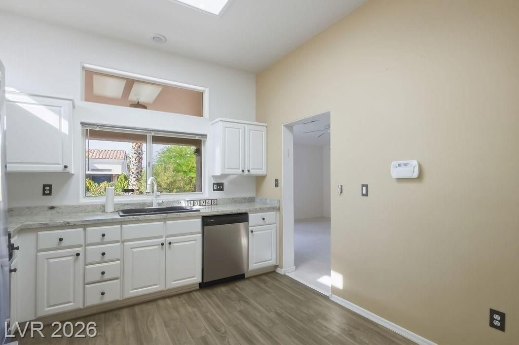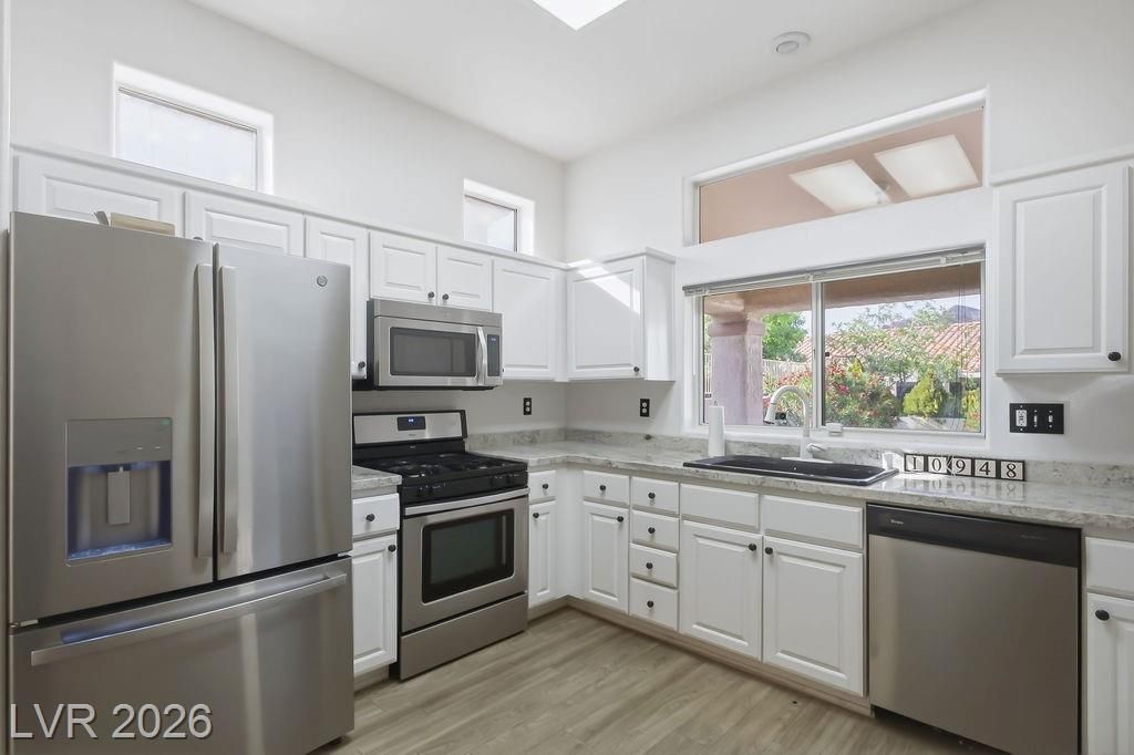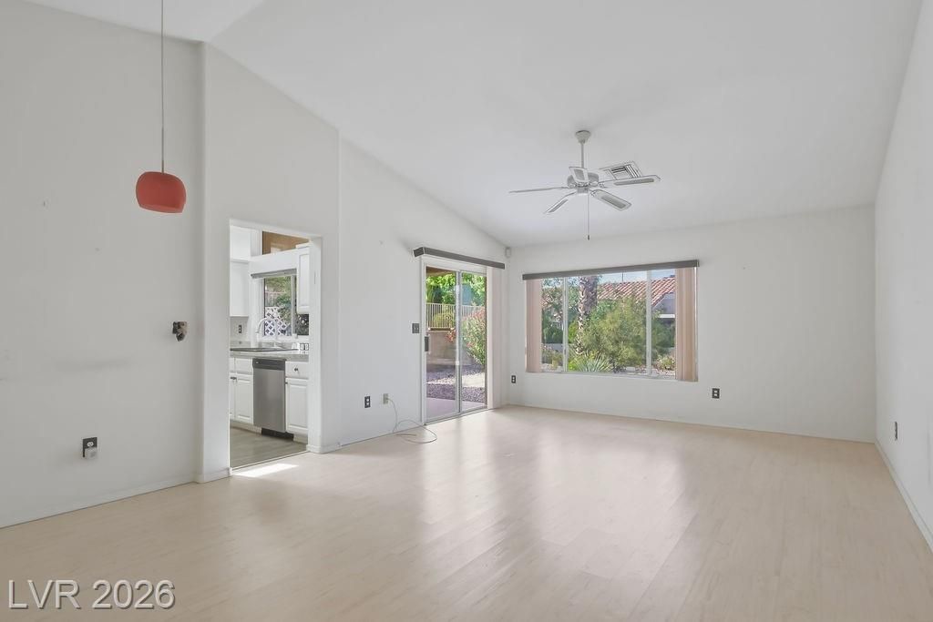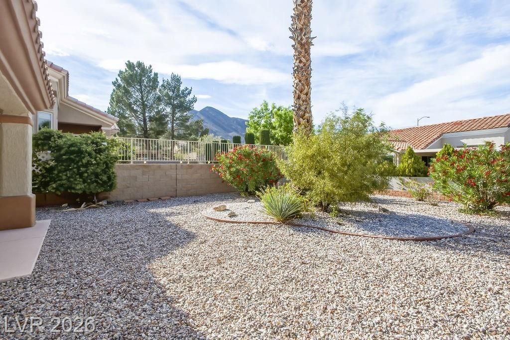 Popular 1,179 sq. ft. Elko model offering 2 bedrooms and 2 baths, ideally situated on a terraced lot in premier 55+ Sun City Summerlin. Enter through a custom courtyard with flagstone patio into a bright, airy interior featuring vaulted ceilings, well-placed windows, and hard surface flooring throughout. The flowing layout opens to a combined living/dining area. Updated kitchen includes quartz counters, refinished cabinetry, stainless steel appliances, and an eat-in nook that leads to a flexible den/office/craft space (laundry relocated to garage).Primary en-suite offers a walk-in closet, additional mirrored closet, and walk-in shower. Spacious second bedroom and updated full bath are just across the hall. Full-size 2-car garage with storage cabinets. Relax in the low-maintenance desert backyard under a generous covered patio. Enjoy Sun City Summerlin’s 3 golf courses, 4 clubhouses, 4 pools, fitness, clubs, entertainment, dining and endless amenities within the community.