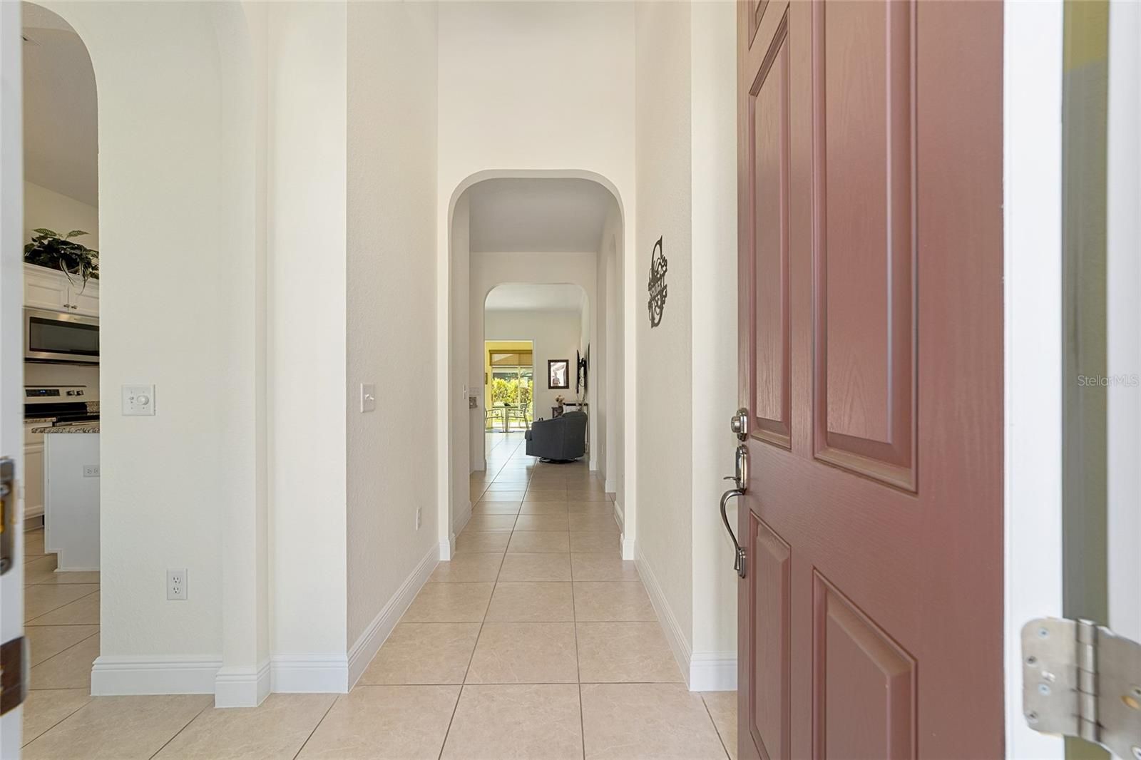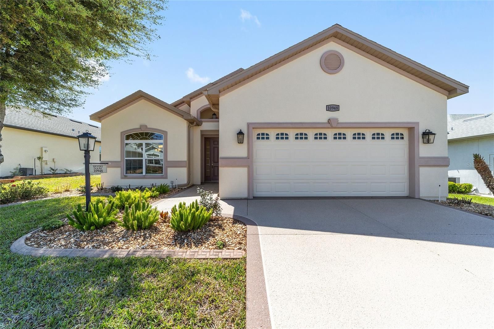 Welcome to this impeccably maintained Hickory model residence located in North Valley / Northern Oaks. Built in 2020, the home is in excellent condition, showing minimal signs of use. Offered as turnkey (partially furnished with limited exceptions) with kitchen items, some decor and linens; the property features a light-filled, pristine foyer upon entry. The dining room, situated to the left, is elegantly furnished and decorated. The spacious kitchen is equipped with gorgeous granite countertops, an island, stainless steel appliances, cabinetry with pull-out shelves, and a double-door pantry, providing an ideal environment for gatherings and entertainment. You will also find three (3) bedrooms, two (2) full bathrooms, a generously sized great room and a lovely sunroom - all beautifully decorated. Additional features include five-inch baseboards throughout, some crown moldings, ceiling fans, and a primary bathroom custom-built with a Roman shower - featuring no step or lip and grab bars for convenience. A connecting door links the primary bedroom to the third bedroom, while the front (second) bedroom currently serves as an office. The sizeable laundry room is conveniently located adjacent to the kitchen and features storage cabinets and a laundry sink. The lanai was built as a sunroom with glass windows, blinds, climate control, and leads to an outdoor patio suitable for morning coffee or evening refreshments. All concrete surfaces, including the driveway, sidewalk, and front porch, are finished with designer paint & texture, while the garage, sunroom, and back patio feature epoxy coatings. The HVAC system receives regular service every six months, and the home holds a termite bond. The stove and refrigerator are just two years new. This pet-free, smoke-free, and deep fry-free property is move-in ready. A golf cart with lithium battery is available for purchase separately. Stonecrest is a 55+ gated community located just east of The Villages, accessible by golf cart. Amenities include four heated saltwater pools (one indoor Olympic-sized), a clubhouse, fitness center, tennis and pickleball courts, dog park, numerous social clubs, community events, and an on-site restaurant. The community does not have any CDD or Bonds. The Villages offers nightly entertainment, dining, live music, and various shopping options such as Aldi, Walmart, Lowe’s, and BJ’s—all reachable by golf cart. We invite you to schedule a viewing of this outstanding home.