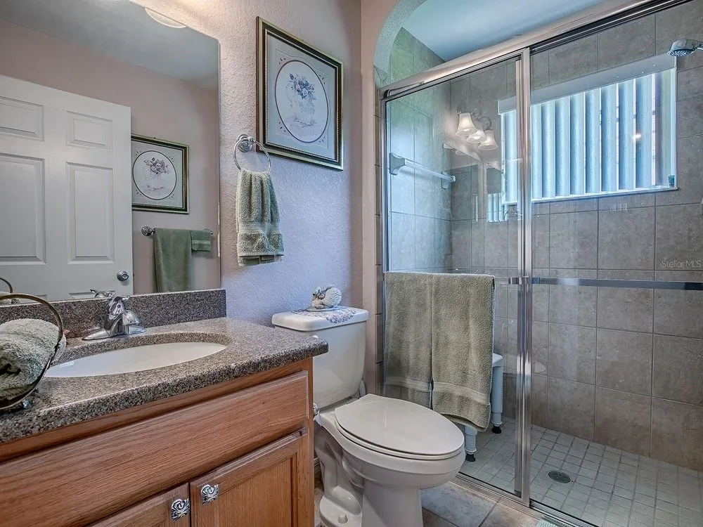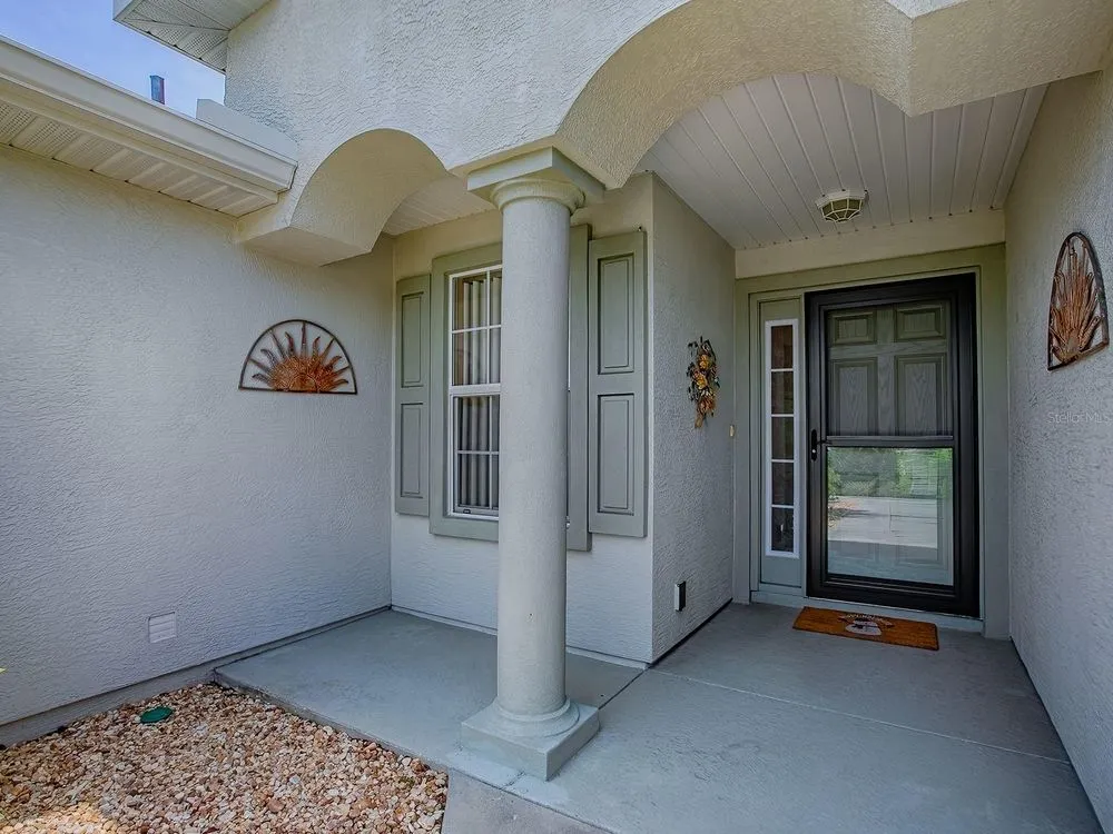 Where happiness blooms, Welcome to Stonecrest — Florida Living at Its Finest Discover the vibrant, resort-style lifestyle that makes Stonecrest a top choice for retirement. This gated 55+ community offers exceptional amenities designed to enjoy your golden years — including an 18-hole championship golf course, lighted pickleball courts, softball fields, pools, and state-of-the-art fitness centers. Whether you're unwinding in the indoor saltwater pool and spa or joining one of 90+ clubs, you'll find every day filled with opportunities to live your best life. At the heart of it all, the welcoming clubhouse features casual dining and a lively social scene. A Home That Brings Comfort, Style, and Efficiency As you arrive, you’ll immediately notice the beautifully landscaped yard and lush greenery — a preview of the thoughtful touches that continue inside. This home is equipped with PAID-FOR SOLAR PANELS, dramatically lowering your electric bills and adding eco-friendly appeal. The screened garage door offers pleasant airflow, making the space feel open and fresh. Step through the welcoming entryway and into a space designed for both elegance and functionality. Gorgeous flooring flows throughout, with tile in the wet areas and plush carpet in one of the bedrooms. The open-concept kitchen is a standout — featuring rich cabinetry, stone countertops, and a sun-filled window that adds warmth to the room. The living room boasts soaring ceilings, stylish laminate flooring, and expansive windows that frame peaceful backyard views. Graceful archways connect the main areas, creating a sense of flow and openness. Relaxation Meets Luxury in the Bedroom Suite. The primary bedroom is a bright, tranquil retreat, enhanced by natural light and a ceiling fan for year-round comfort. The en-suite bath feels like a spa getaway — complete with stone countertops, a garden tub, and a separate tiled shower with glass doors. Two additional bedrooms offer cozy sanctuaries with ample natural light, ceiling fans, and spacious closets. The second bathroom features floor-to-ceiling glass in the walk-in shower and a sunlit window for a refreshing feel. Tucked behind a pocket door, the laundry room offers quiet convenience with easy access to the garage. Outdoor Serenity Enjoy your mornings on the screened-in lanai, sipping coffee while soaking in the peaceful surroundings and leisurely pace of life that Stonecrest is known for. And don’t forget the solar panels, a fantastic bonus that keeps utility costs impressively low.