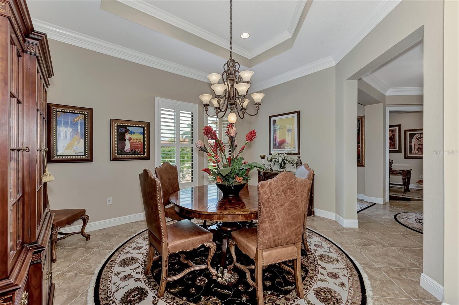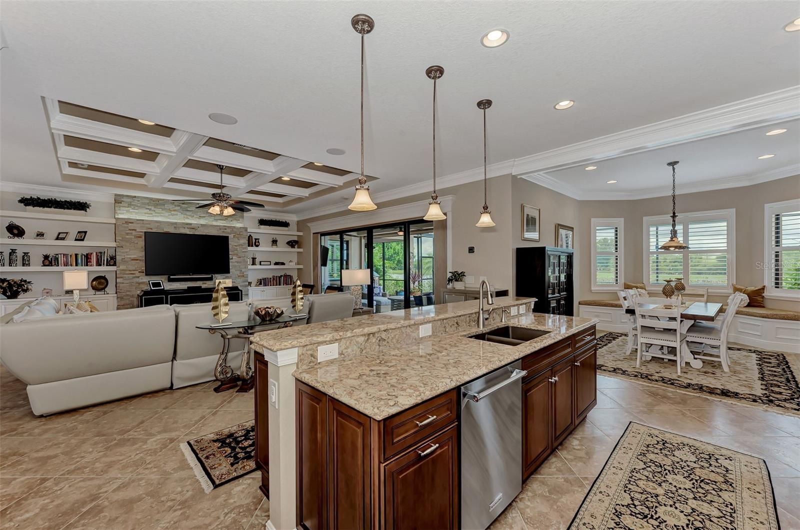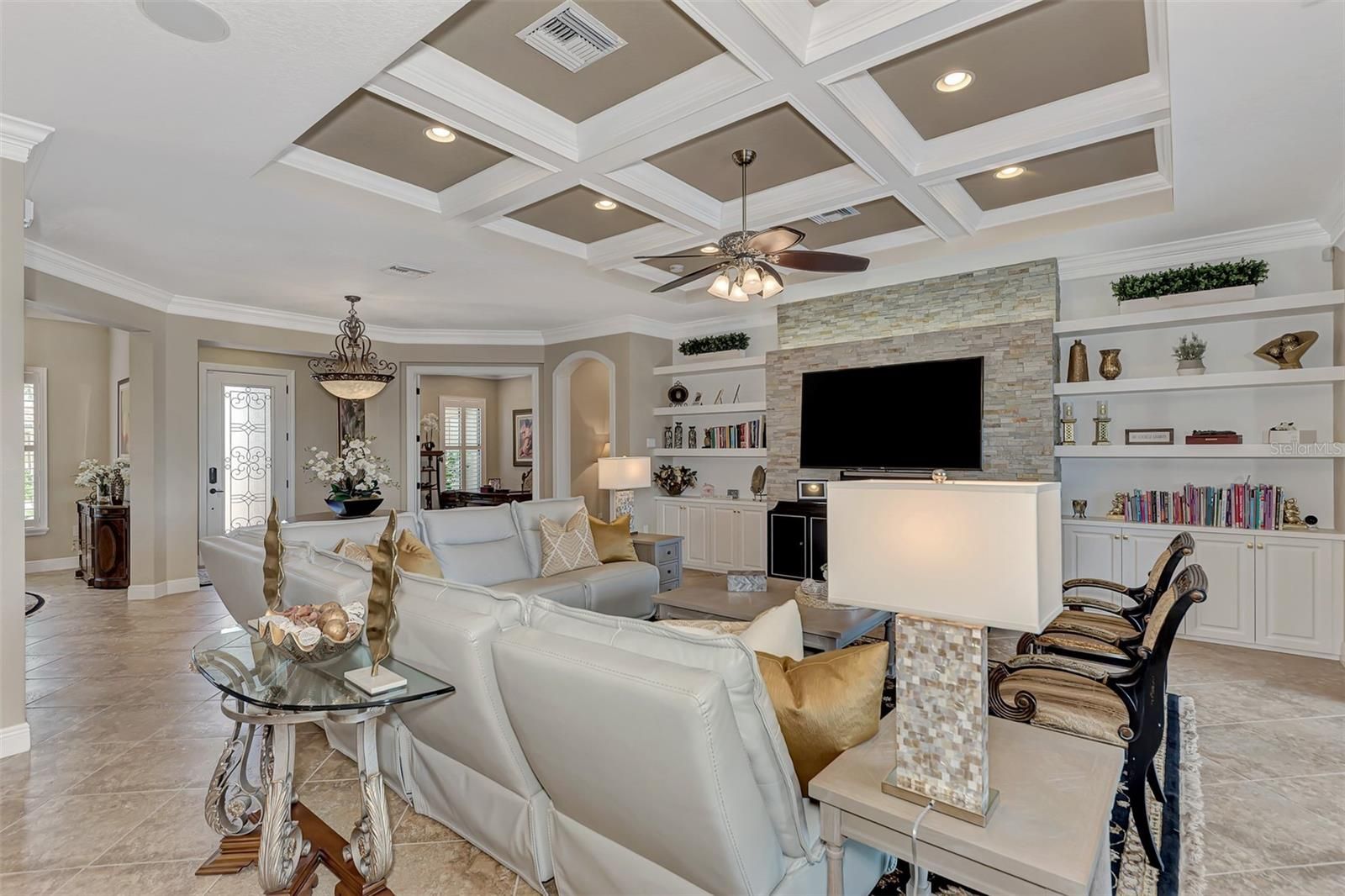 - Built-in Features, Cathedral Ceiling(s), Ceiling Fan(s), Chair Rail, Coffered Ceiling(s), Crown Molding, Dry Bar, Eat-in Kitchen, High Ceilings, In-Wall Pest Control, Kitchen/Family Room Combo, L-Shaped Dining Room, Open Floorplan, Main Level Primary, Solid-Wood Cabinets, Split Bedrooms, Stone Counters, Tray Ceiling(s), Walk-In Closet(s), Window Treatments