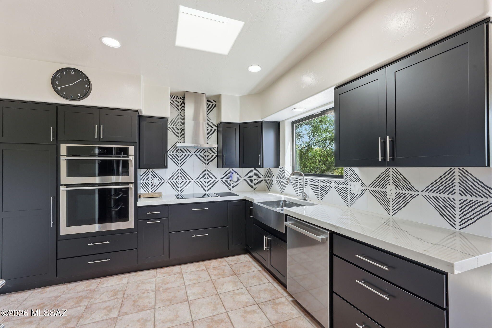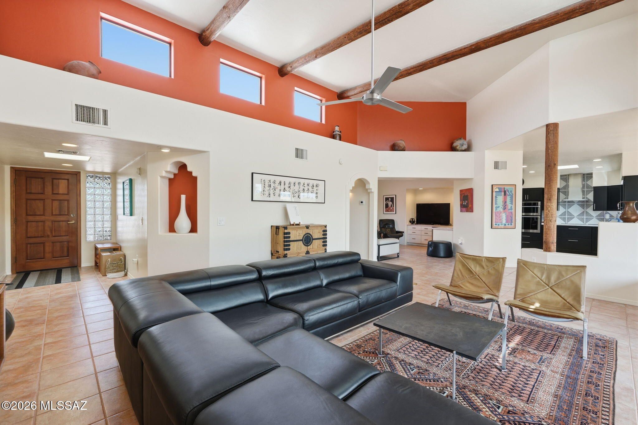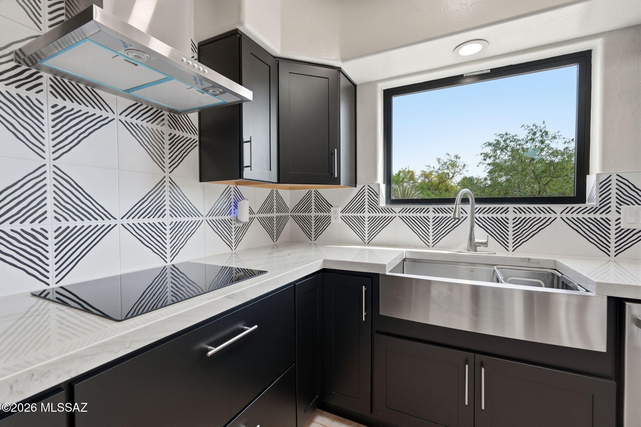 Nestled in the centrally located and peaceful community of Portillo Hills, this beautifully updated Santa Fe-style home offers the perfect blend of Southwest charm and modern comfort. Designed with an open, airy floor plan, the home features low maintenance flooring throughout. At the heart of the home, the fully renovated kitchen is a standout, showcasing sleek quartz countertops, stainless steel appliances, custom tile backsplash and a contemporary induction cooktop, set up for both everyday living and entertaining. The spacious living room impresses with soaring 12-foot ceilings and expansive windows that flood the space with natural light, seamlessly connecting indoor and outdoor living. Step outside and discover the professionally designed desert landscape ready for star-gazing.
