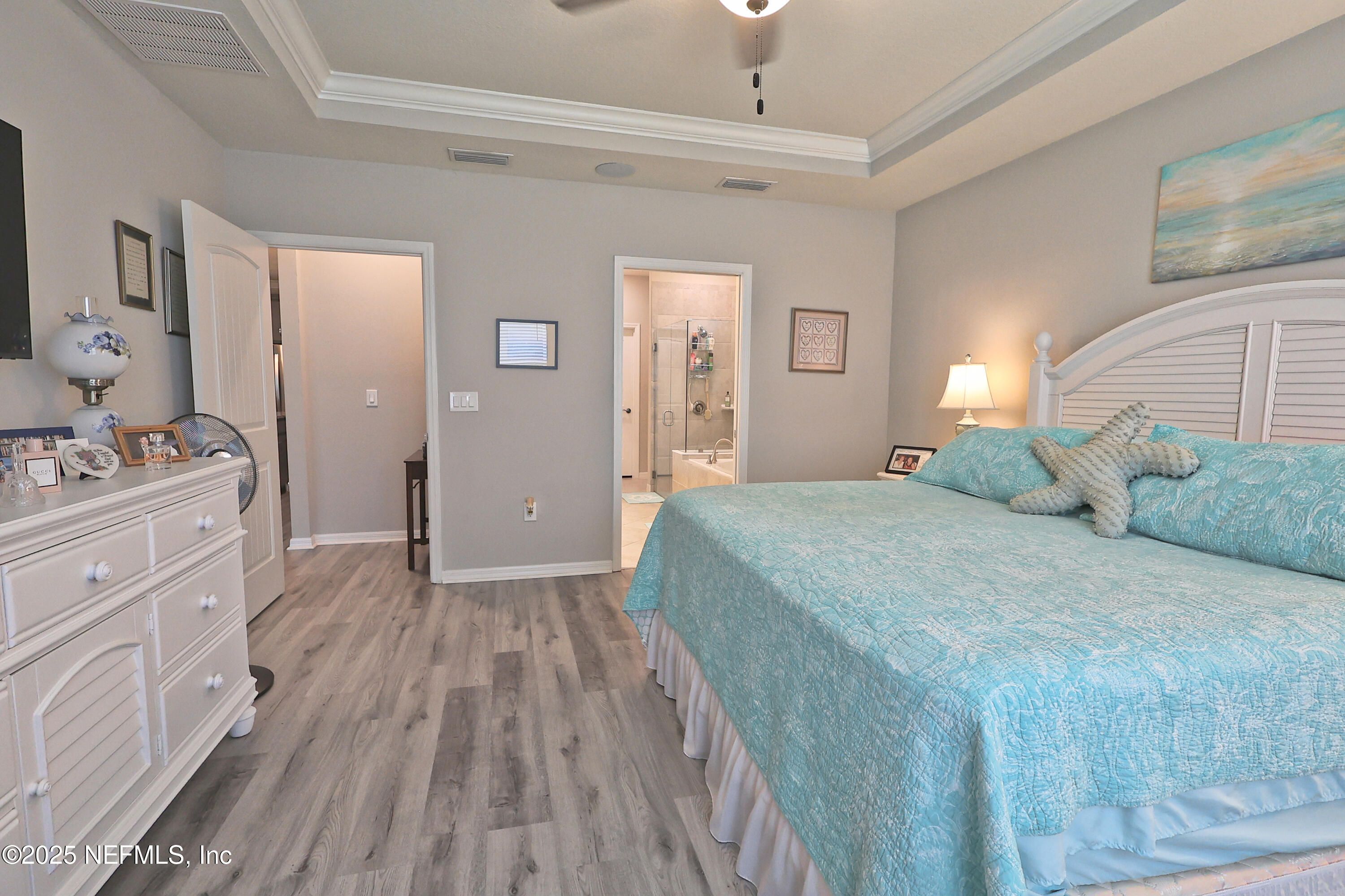 This stylish 3-bed, 2-bath home with a private office blends comfort, ease, and fun. Enjoy 8-foot doors, luxury vinyl plank flooring throughout, and a bright open layout perfect for relaxed living. The chef's kitchen wows with a natural gas stove, stainless steel appliances, and generous counter space—ideal for cooking or hosting friends. Step outside to your oversized screened rear lanai and fully fenced backyard for seamless indoor-outdoor living. The Del Webb lifestyle? It's second to none! Dive into a world of amenities: clubhouse, resort-style pool, fitness center, bar, fire pits, biking trails, bocce ball, pickleball, game room, and even a community garden. The spacious primary suite features a tile shower, garden tub, dual vanities, and a large walk-in closet. The garage has a sleek epoxy floor. Effortless living, endless fun