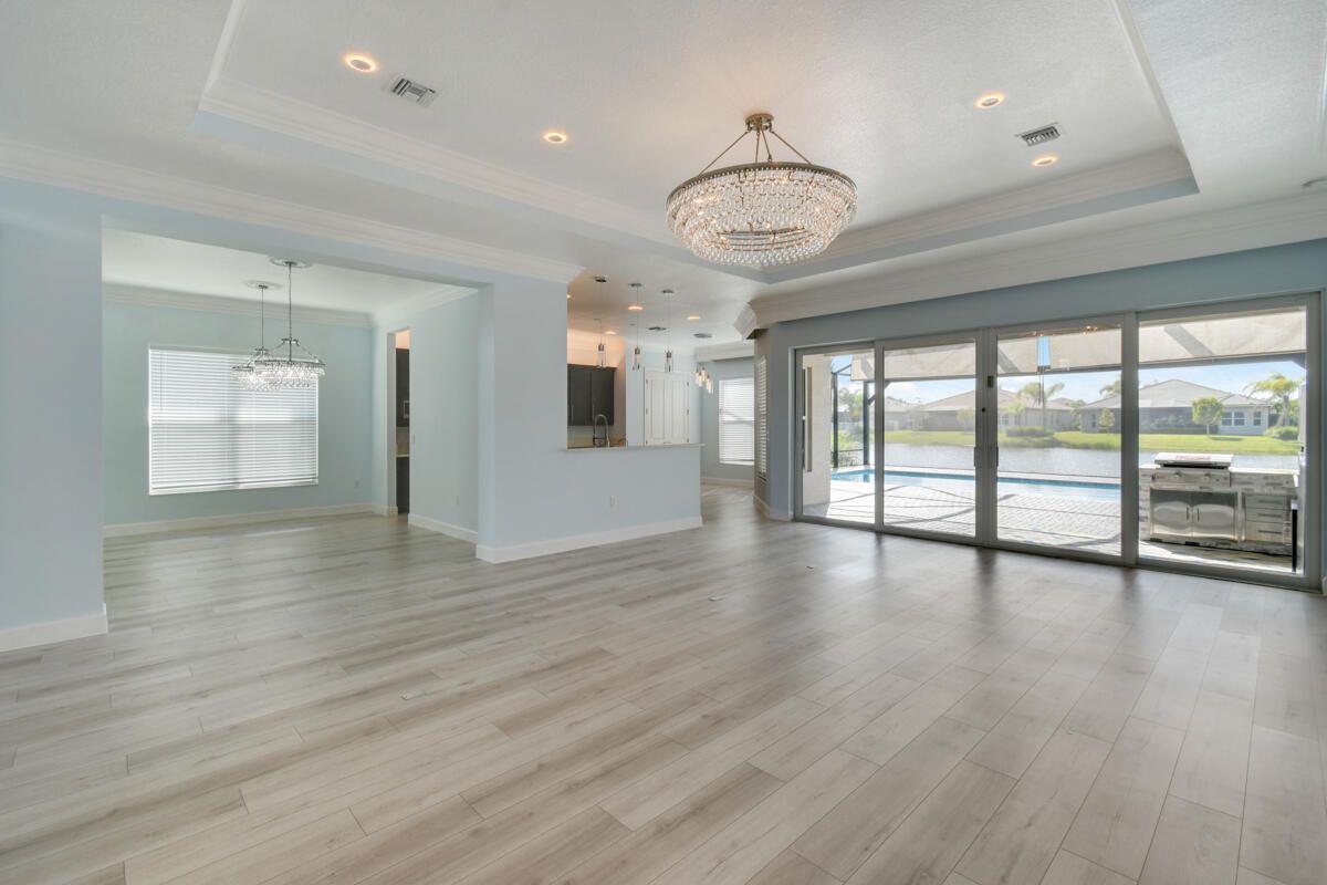 Welcome to this highly upgraded Julia model offering luxurious living on a premium waterfront lot with a widened paver driveway and walkway. This ''smart house'' is controlled by a Lutron app and full security system, allowing you to manage lighting and more with ease. Enjoy breathtaking sunsets from your extended patio and screened-in pool with outdoor kitchen. The home features extensive upgrades, including a floor to ceiling entertainment center and electric fireplace, an upgraded kitchen with quartz countertops, soft close cabinetry, luxury vinyl plank flooring, elegant dimmable and color changing lighting, crown molding, hi-hat lighting with night lights and pearlized ceilings. The primary suite features built in walk-in closets. See more for a detailed list of all upgrades! Exterior Widened entry walkway wall to wall Increase width of driveway 2 feet on both sides Gutters around the whole house Driveway downspout underground drainage both sides of back patio No-se-um screens on all windows and sliding doors and sides of screen enclosure Driveway lighting controlled manually or by Lutron app Driveway and back patio pavers are sealed 2 Hose Bibs (Side of driveway and side of Backyard) Roof professionally cleaned Interior High end UV double light for HVAC Main entrance keypad Garage entry keypad Primary suite keypad Smoke with heat detector wired directly to system in great room Smoke detectors in each room Carbon monoxide Waterproof Rigid Core Luxury Vinyl Plank with cork padding installed throughout home except bedrooms and den Foyer Keyless entry Hurricane Impact ¾ glass entrance door Stainless steel hinges on entrance door Foyer mirror wall art Entrance indoor double hidden screen 9 inches wood crown molding on ceiling 6 inches wood crown molding on vaulted ceiling (4) 4 inches high hats 3 Crystal chandeliers Caseta Chandeliers with dimmer switch controlled manually or by Lutron app Pearlized finish on vaulted ceiling Framed transom window Great Room Floor to ceiling and wall to wall entertainment center with 8 shelves and 2 cabinets and color changing shelving remote lighting 100 inches recessed fireplace with heat and different flame colors and different ember bed colors 85 inch wall mounted TV and up to 92 inches TV capability 9 inches wood crown molding on vaulted ceiling 9 inches wood crown molding on ceiling 3 floor electrical receptacles Chandelier Caseta Chandelier with smart dimmer switch controlled manually or by Lutron app (8) 4 inches high hats with night lights 4 sliding doors with no-se-um screens Hidden sliding doors cornices Den Upgraded carpet and padding Barn entrance door 72 inches ceiling fan with medallion 4 High Hats with night light 9 inches wood crown molding Additional electrical ports for internet access Dining Room Floor to ceiling and side to side mirror wall art 2 chandeliers with medallions Caseta Chandeliers with smart dimmer switch controlled manually or by Lutron app 9 inches Wood Crown molding Kitchen Soft close kitchen cabinets and drawers Quartz countertops Cabinets hardware brushed nickel 12 inches GE Profile kitchen canopy hood vented exterior GE dishwasher Kitchen island base cabinets pull-out-tray Kitchen sink Moen under mount Kitchen faucet Kohler Reverse osmosis water filtration system Pantry's wire shelving extended to ceiling (6) 6 inches high hats with night lights 1 chandelier Caseta Chandelier with smart dimmer switch controlled manually or by Lutron app 9 inches crown molding Hidden window cornices Stainless steel water valves Primary Suite Wall mount TV electrical installation ready 9 inches wood crown molding (4) 6 inches high hats with night lights 74 inches ceiling fan Upgraded carpet and padding 2 walk-in closets with mirrors, drawers, shelving, hanging rods and LED lighting Primary Ensuite Bath 2 Kohler under counter rectangular sink Extended mirrors to ceiling over both vanities Frameless shower door Walk-in shower tiles extended to ceiling Vanity cabinets Level 2 with granite counter top Kohler shower faucet with handheld Kohler comfort height toilet Stainless steel water valves Powder Room Vanity cabinets Level 2 with granite counter top Extended mirror to ceiling with vanity Banjo Top Kohler under counter rectangular sink Moen faucet Kohler comfort height toilet Stainless steel water valves 2nd Bedroom Wall mount TV electrical installation ready 9 inches wood crown molding (4) 6 inches high hats with night lights 74 inches ceiling fan Upgraded carpet and padding 1 walk in closet with shelves and hanging rods Floating shelf Hidden window cornices 2nd bathroom Vanity cabinets Level 2 with granite counter top Kohler under counter rectangular sink Moen faucet Kohler comfort height toilet Bathtub tiles extended to ceiling Stainless steel water valves 3rd Bedroom Wall mount TV electrical installation ready 9 inches wood crown molding (1) 6 inches high hats 74 inches ceiling fan Upgraded carpet and padding 1 walk in closet with mirror, drawers, shelves and hanging rods Hidden window cornices 3rd Bathroom Vanity cabinets Level 2 with granite counter top Extended mirror to ceiling Kohler under counter rectangular sink Moen faucet Kohler comfort height toilet Kohler shower faucet with hand held Stainless steel water valves Walk in shower tiles extended to ceiling Floating shelves Laundry Room Base cabinet with granite counter top and sink Faucet Soft close wall and base cabinets for storage with granite counter tops Stainless steel water valves