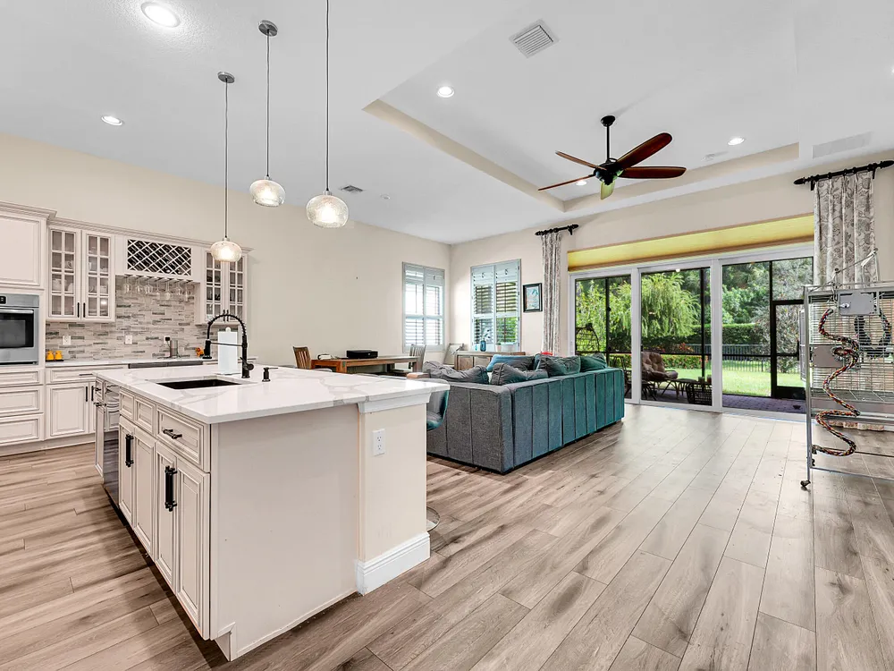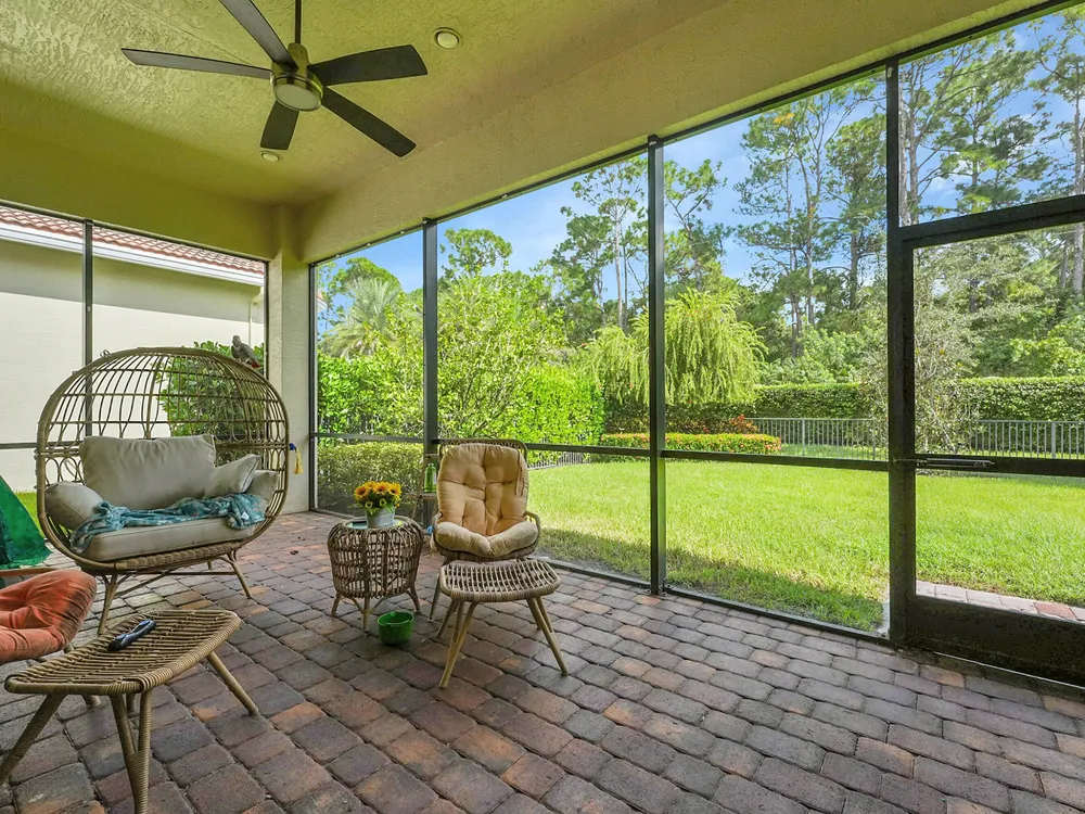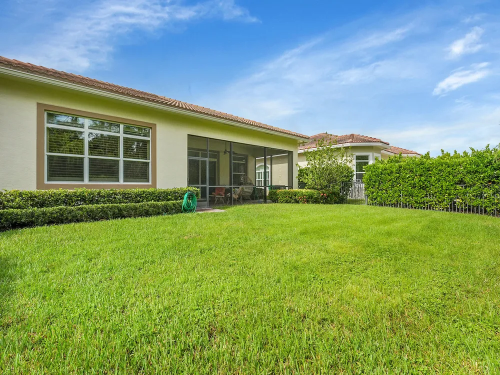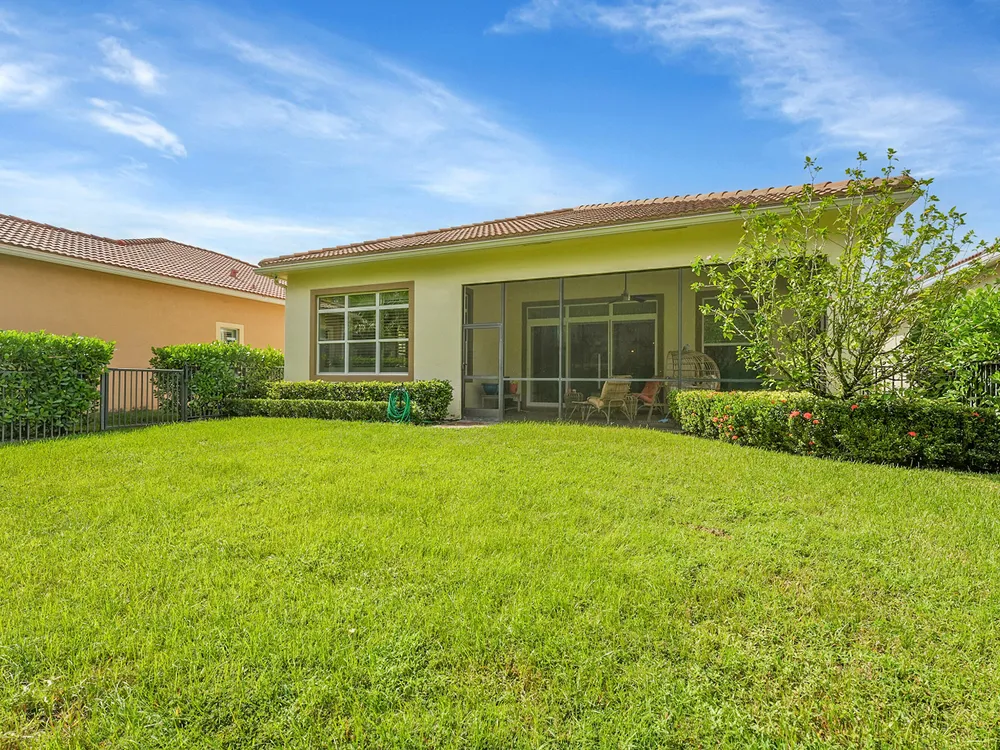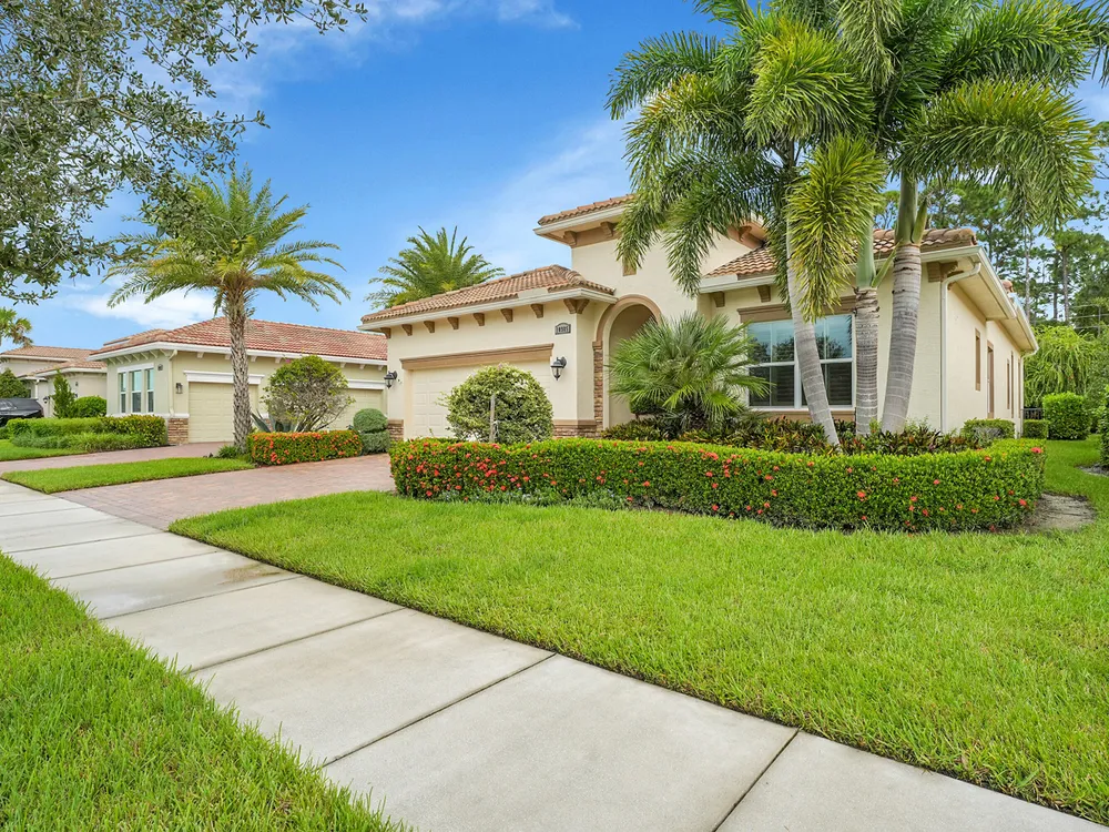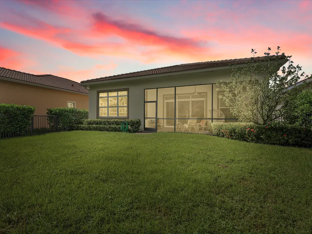 This sought-after Lago plan offers an exceptional open-concept design. Situated in the f PGA Verano community, the home boasts a fantastic location: directly across the street from a tranquil pond and backing up to a lush hedge that provides a peaceful buffer from the PGA golf course.The thoughtful layout features a spacious owner's suite with a large master bedroom and a functional den, conveniently located immediately off the foyer. Culinary enthusiasts will appreciate the dedicated pantry and the separate laundry room. The expansive living space flows seamlessly into a lovely screened-in patio at the rear of the house, where you can relax and enjoy the serene and private backyard setting. This home is an ideal blend of luxury, privacy, and convenience. Live the Verano Life Style today!